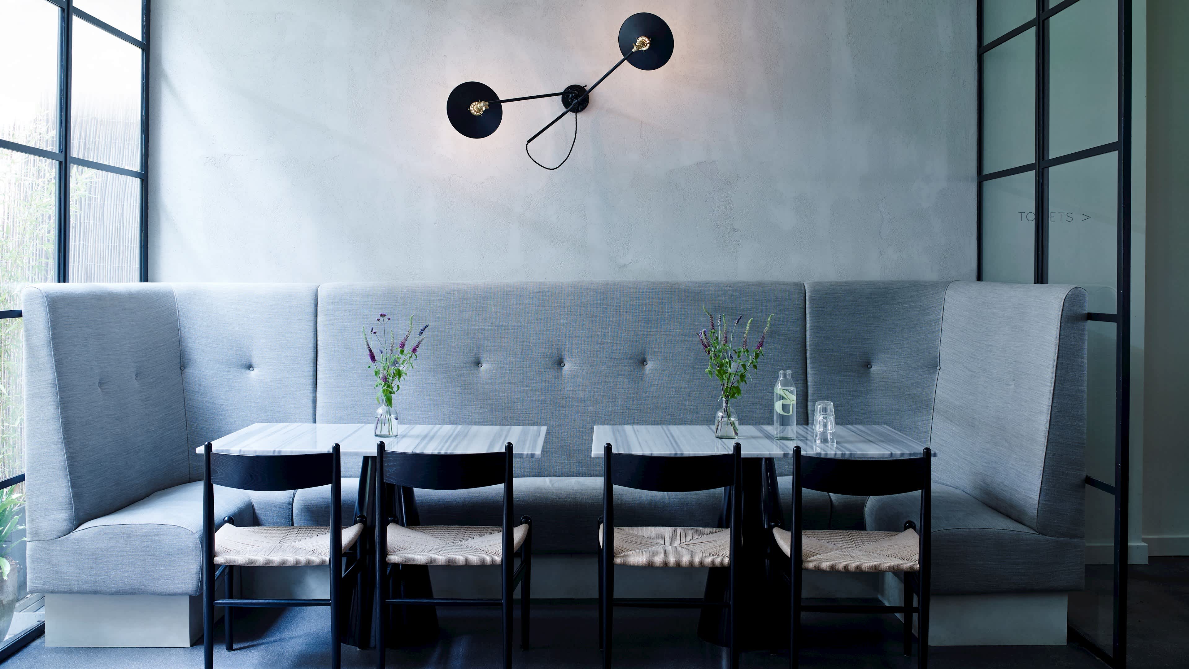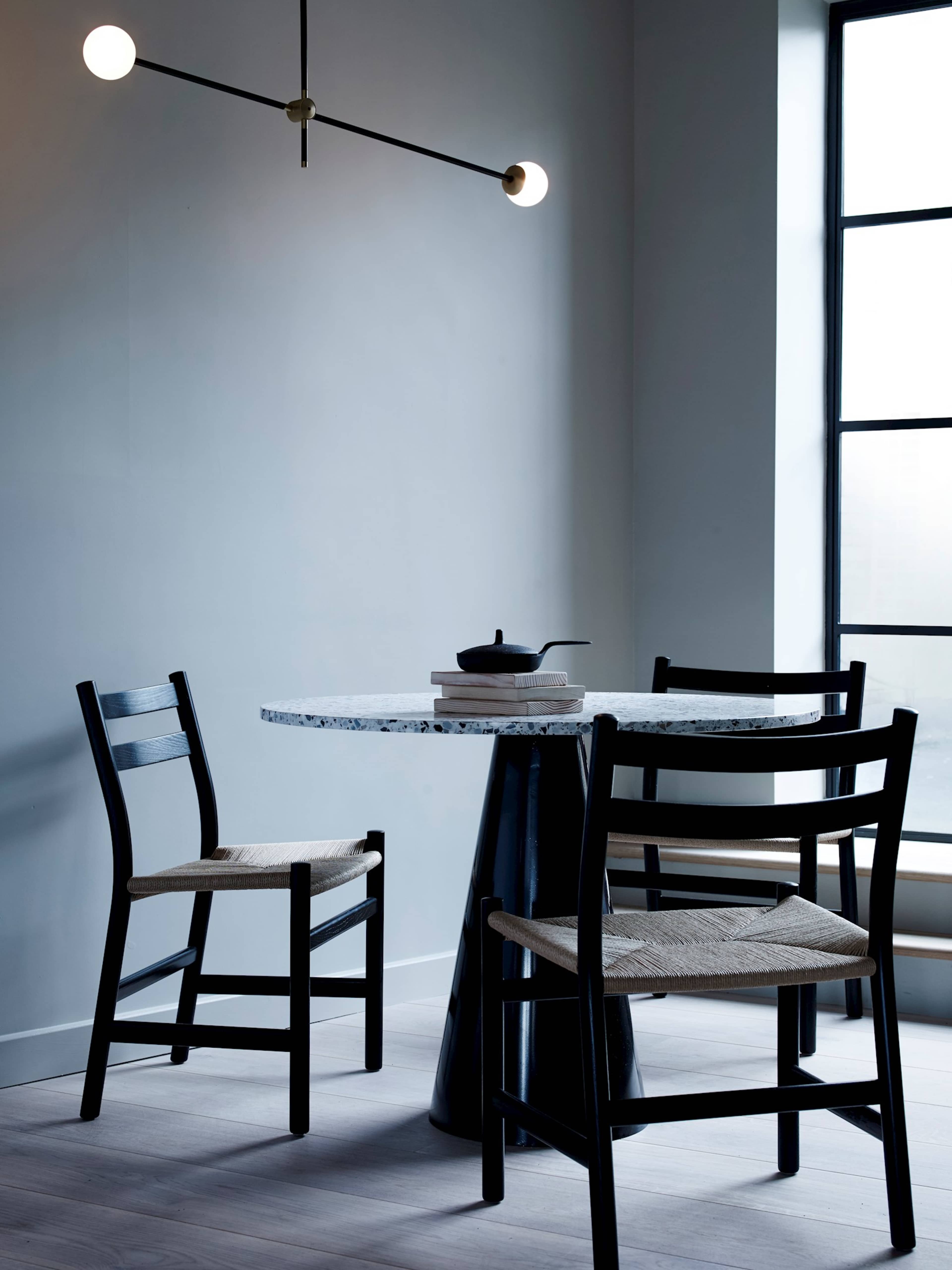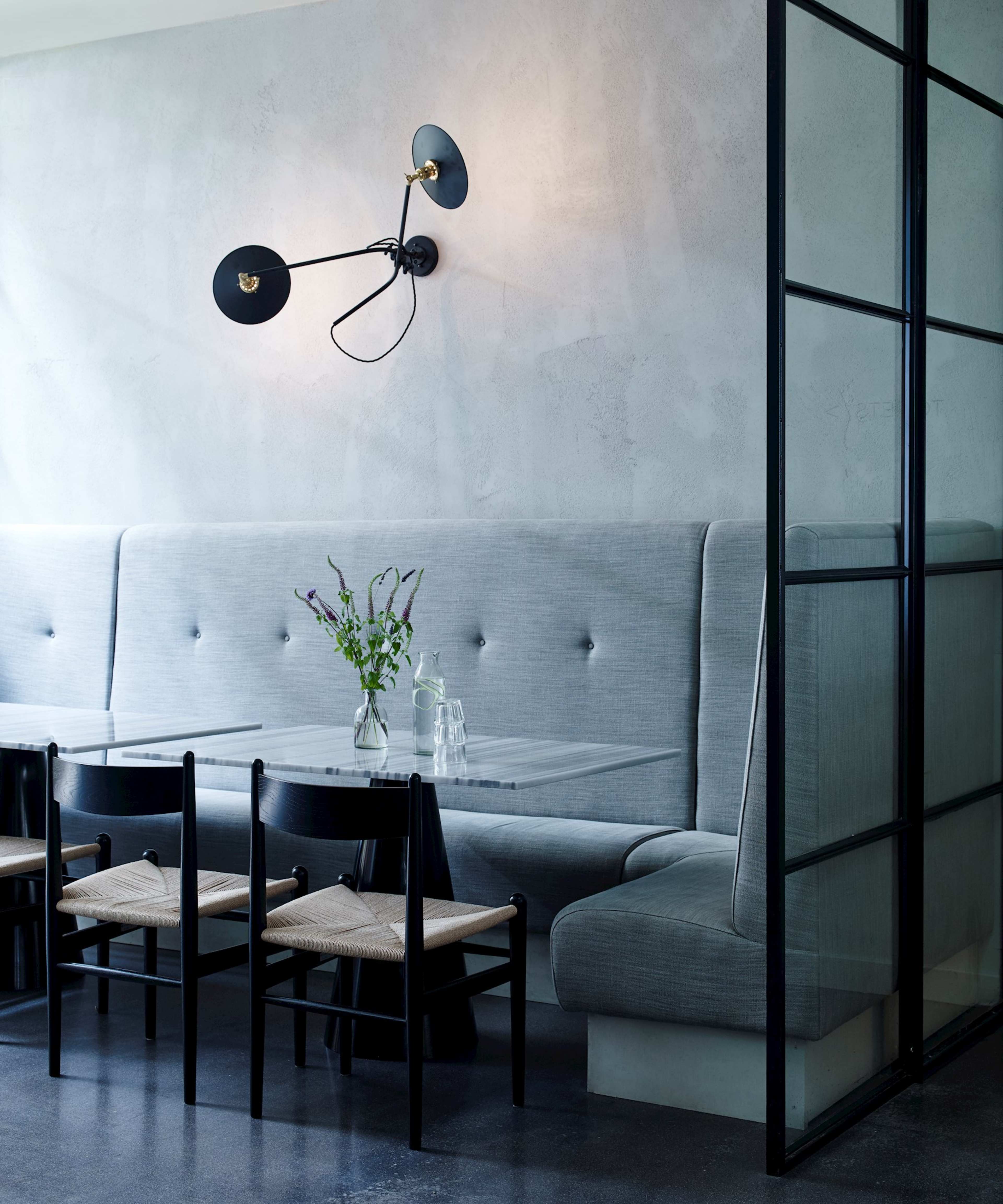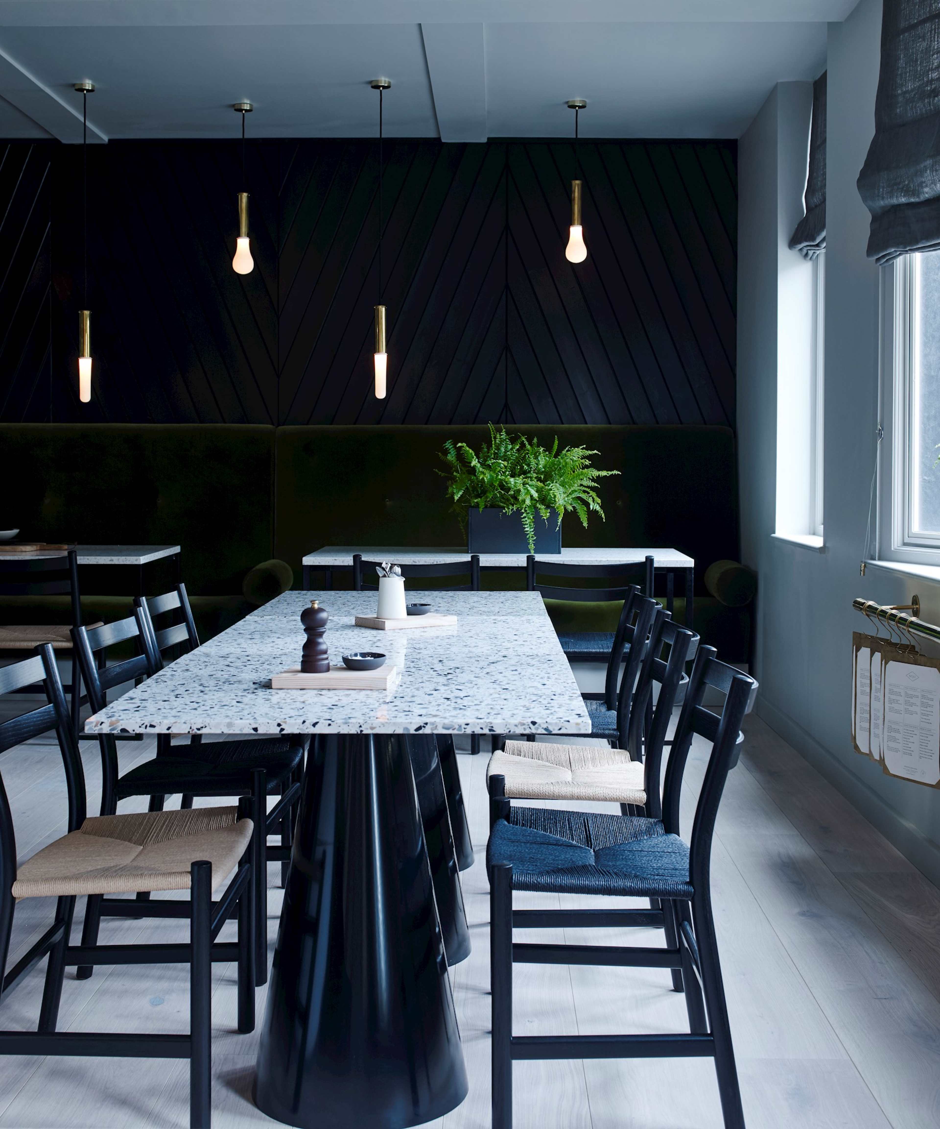 På førstesalen, som er forbeholdt private middagsselskaber, er en af væggene beklædt med sortmalede træpaneler, som sammen med de lange olivengrønne veloursofaer skaber en flot kontrast til marmorbordene og de rå fyrretræsgulve. »På denne etage har vi valgt sortlakerede CH46 og CH47 stole med armlæn. Disse stole er en smule bredere end almindelige stole og giver en behagelig siddekomfort,« siger Louisa Grey.