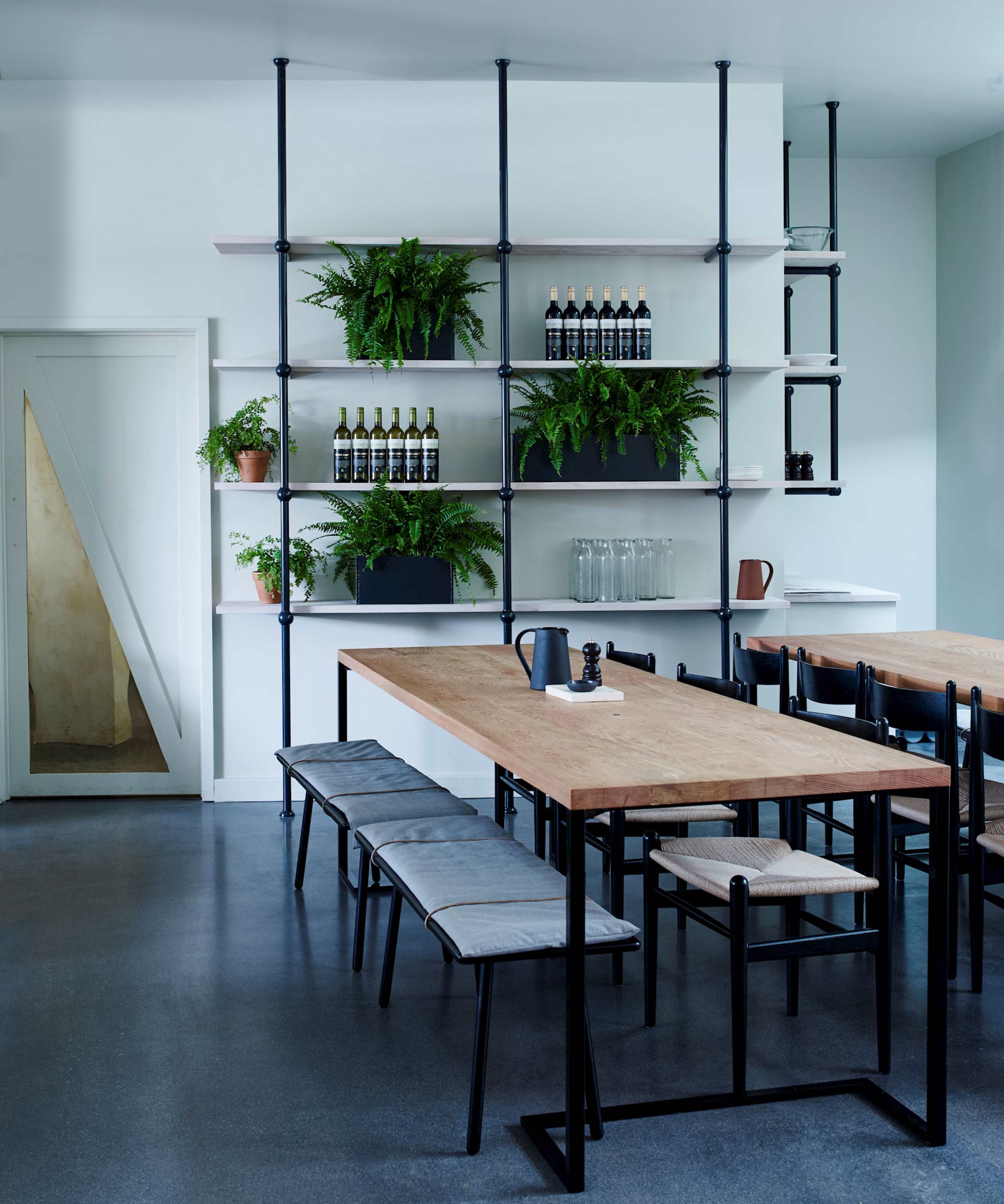 I stueetagen kan man også vælge at sidde ved langborde, der er specialdesignet til social dining-arrangementer. De sortlakerede CH36 stole passer smukt sammen med bordpladerne i ubehandlet træ.