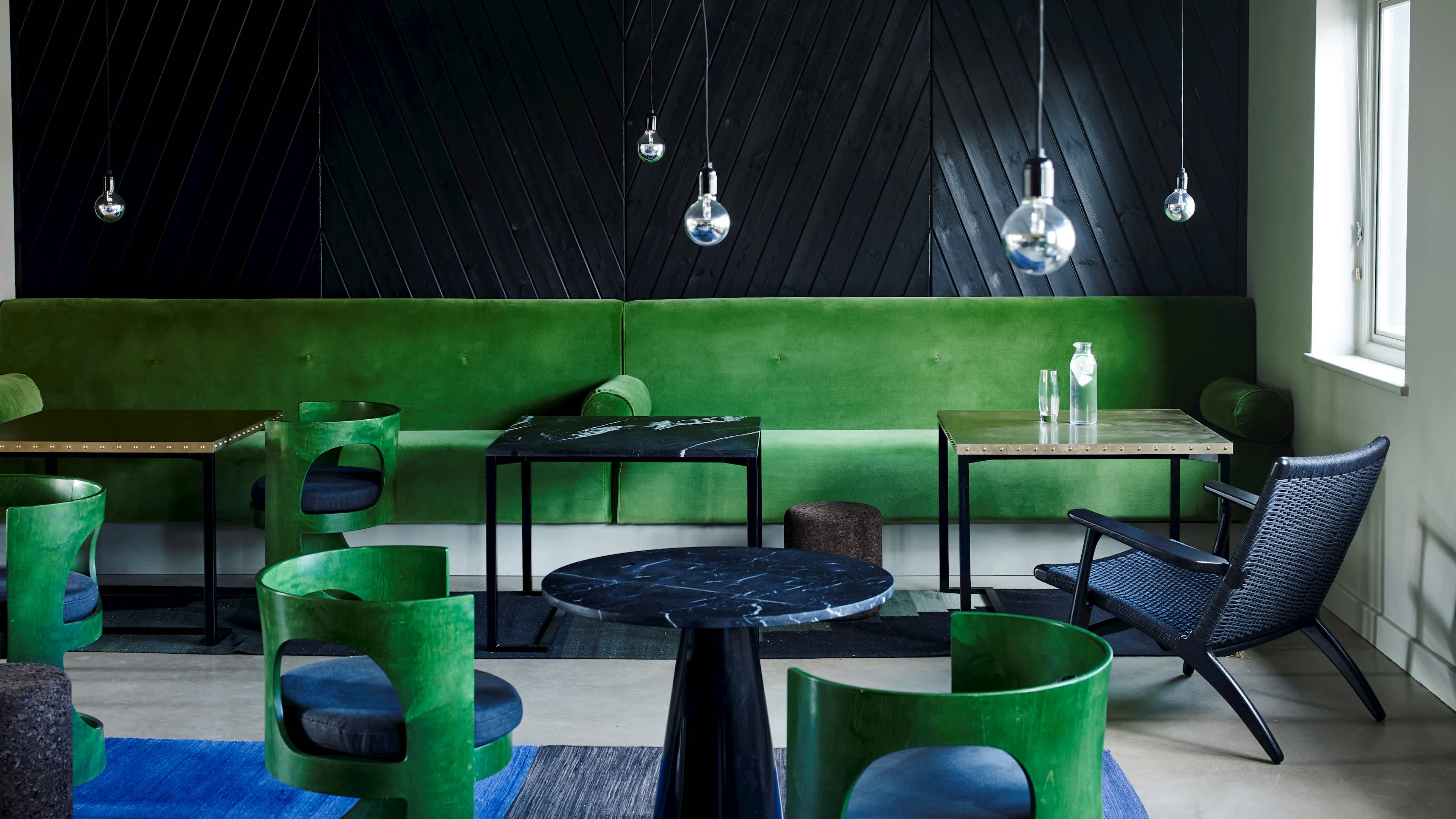 Loungeområdet på øverste etage har designerne indrettet med vægge i sort træ, lave veloursofaer og lave firkantede borde med bordplader i forskellige typer marmor. De grønne laminerede træstole, som er designet i slutningen af 60'erne, suppleres af elegante, lette og komfortable sorte CH25 loungestole med sæde i sort papirgarn. »Vi har designet de grønne veloursofaer, så de passer perfekt til Carl Hansen & Søns loungestole, med et sæde, som er lavere end en standardsofa. Med sin diskrete belysning og de perfekt afstemte materialer er det en etage, du bare aldrig har lyst til at forlade igen,« siger Louisa Grey.