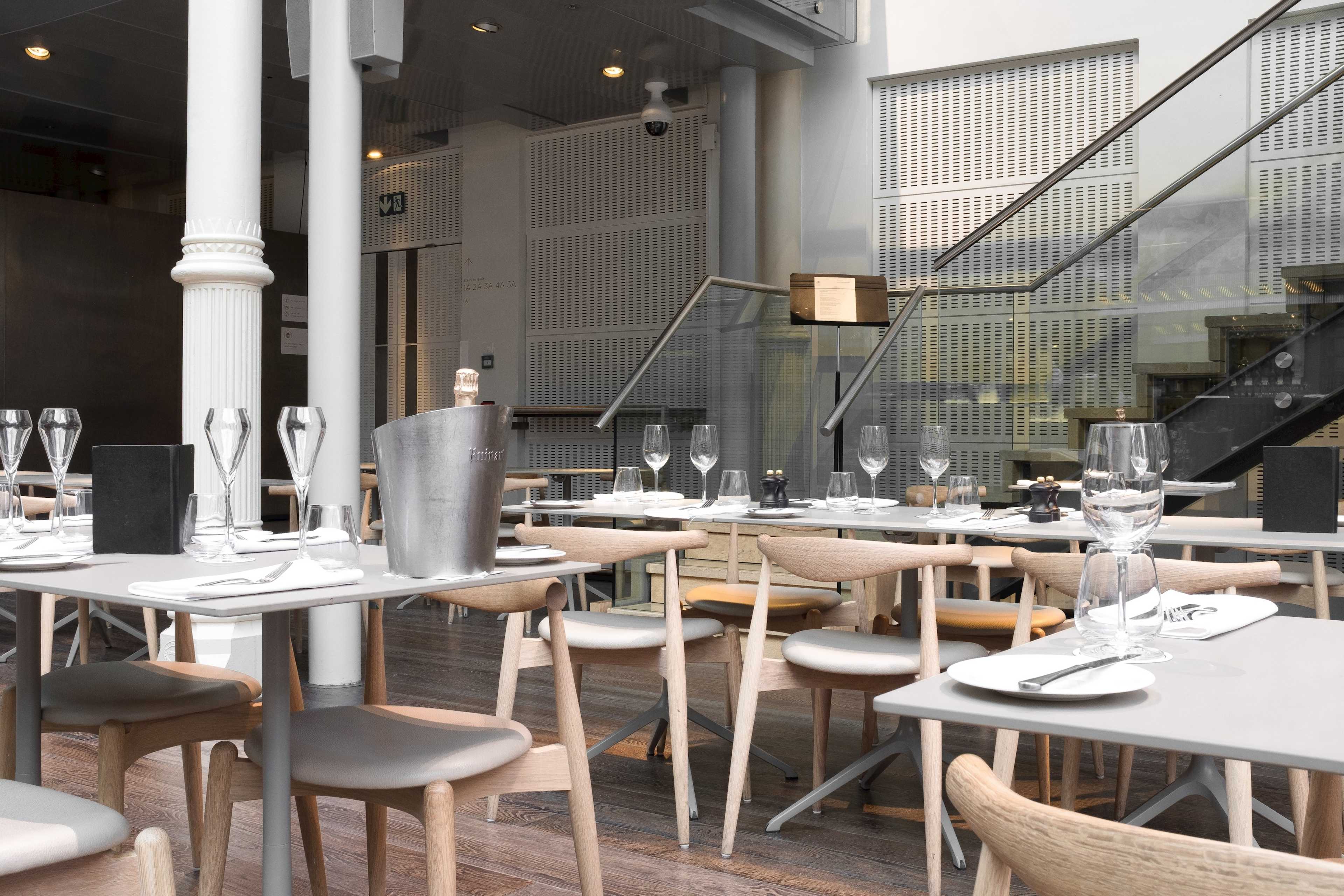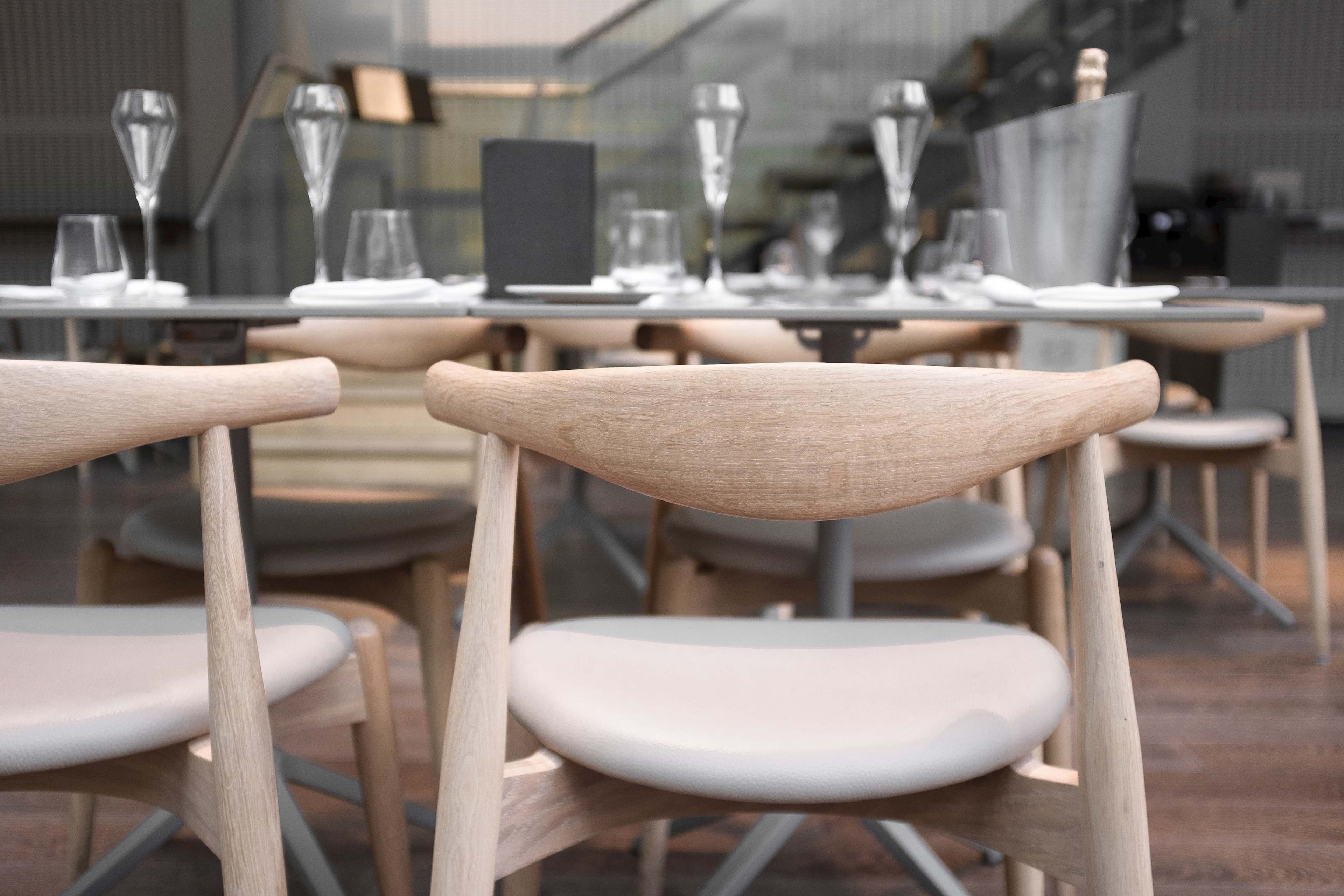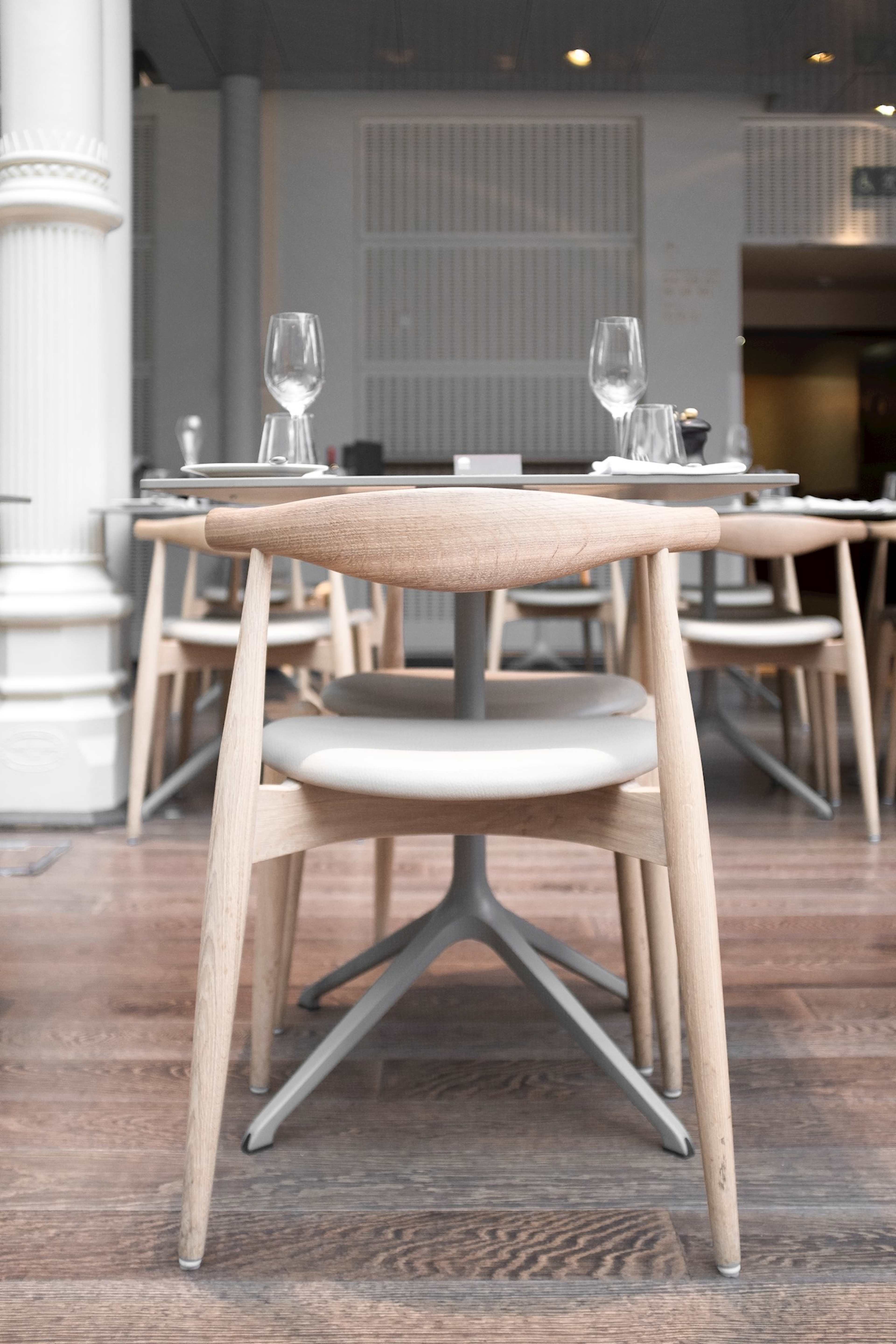 Med sit organisk formede kopstykke og sæde udgør Wegners CH20 stol restaurantens skulpturelle element. Stolens lyse stel i eg og naturfarvede lædersæde harmonerer på smukkeste vis med den øvrige farvesætning.