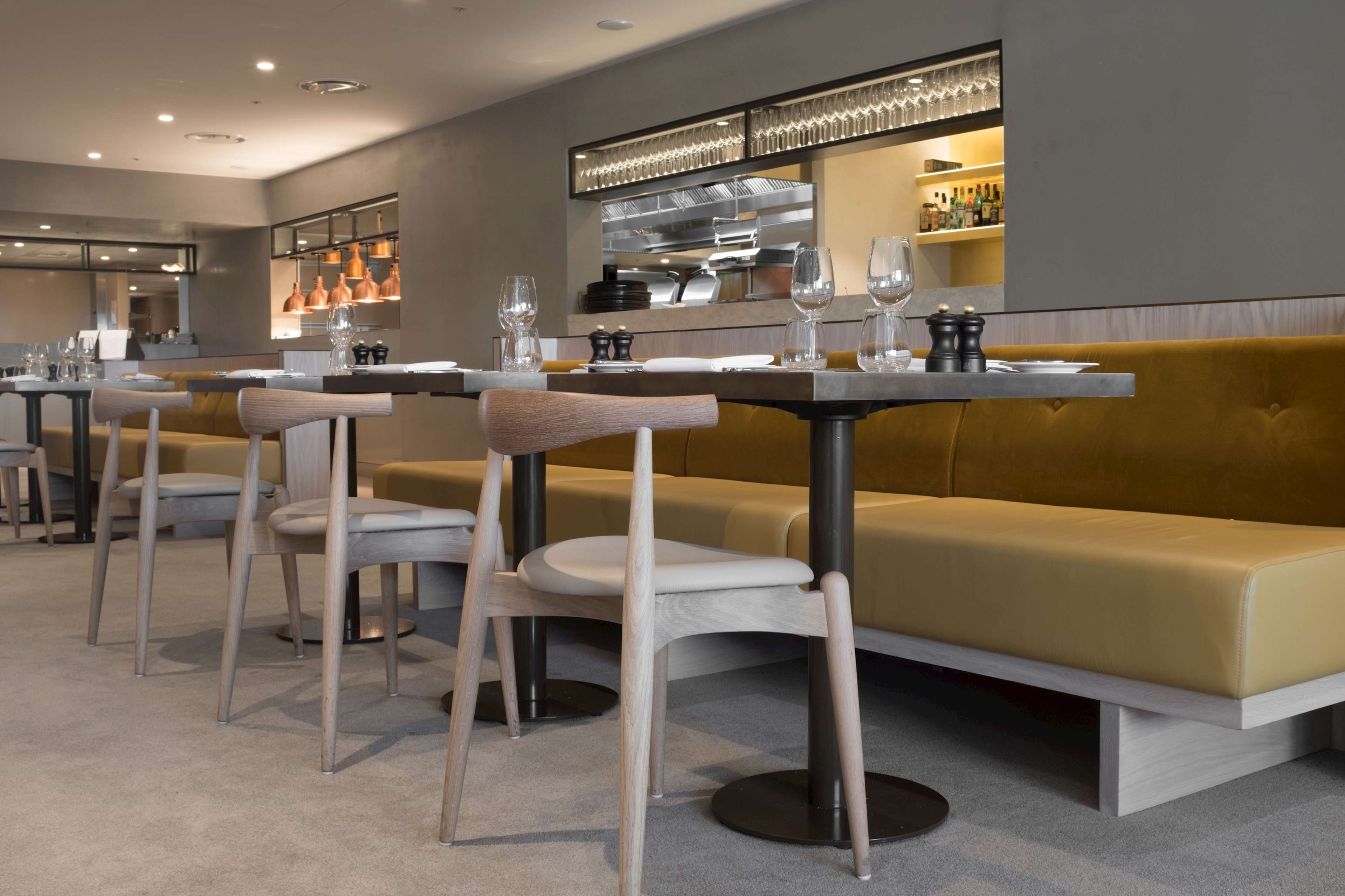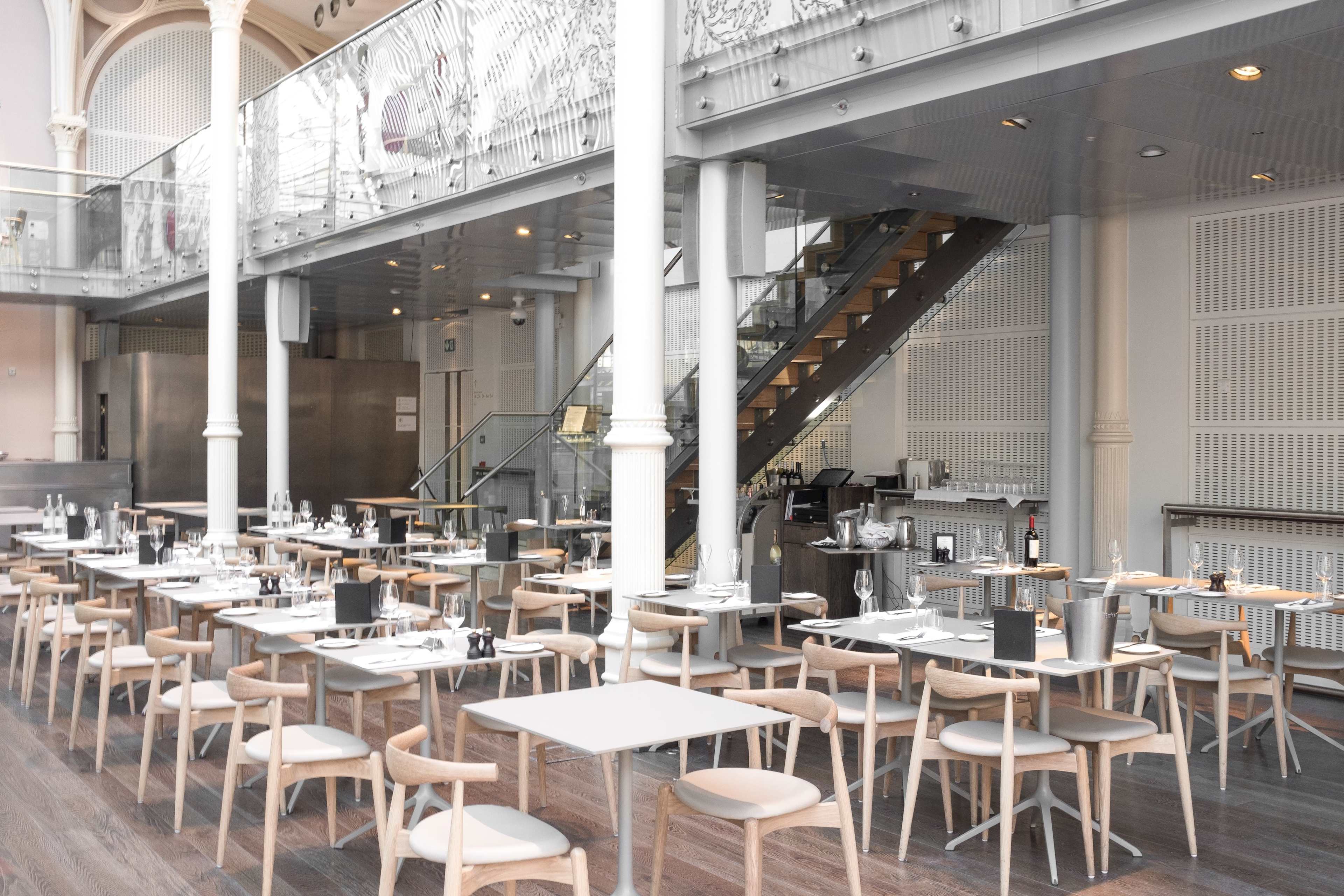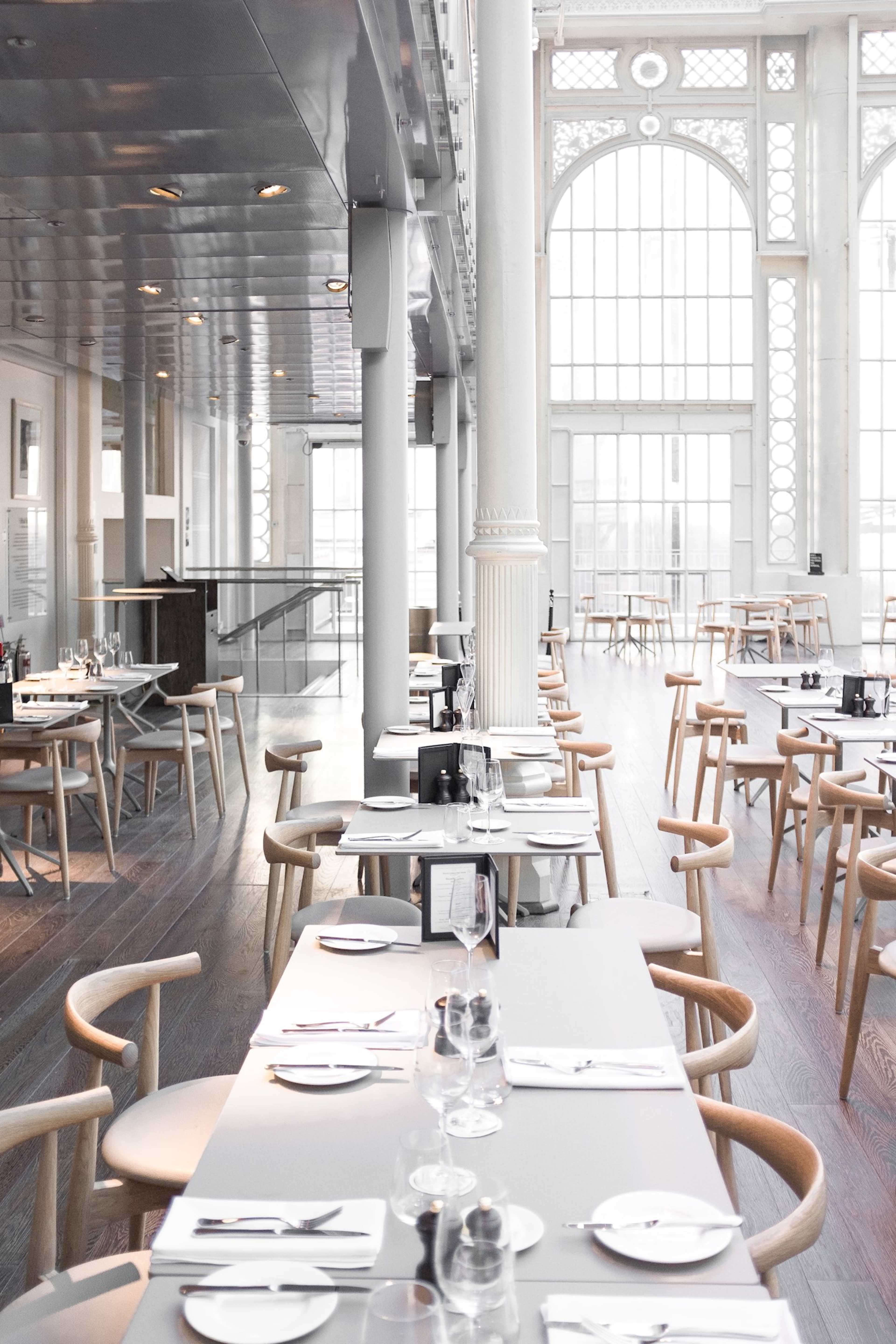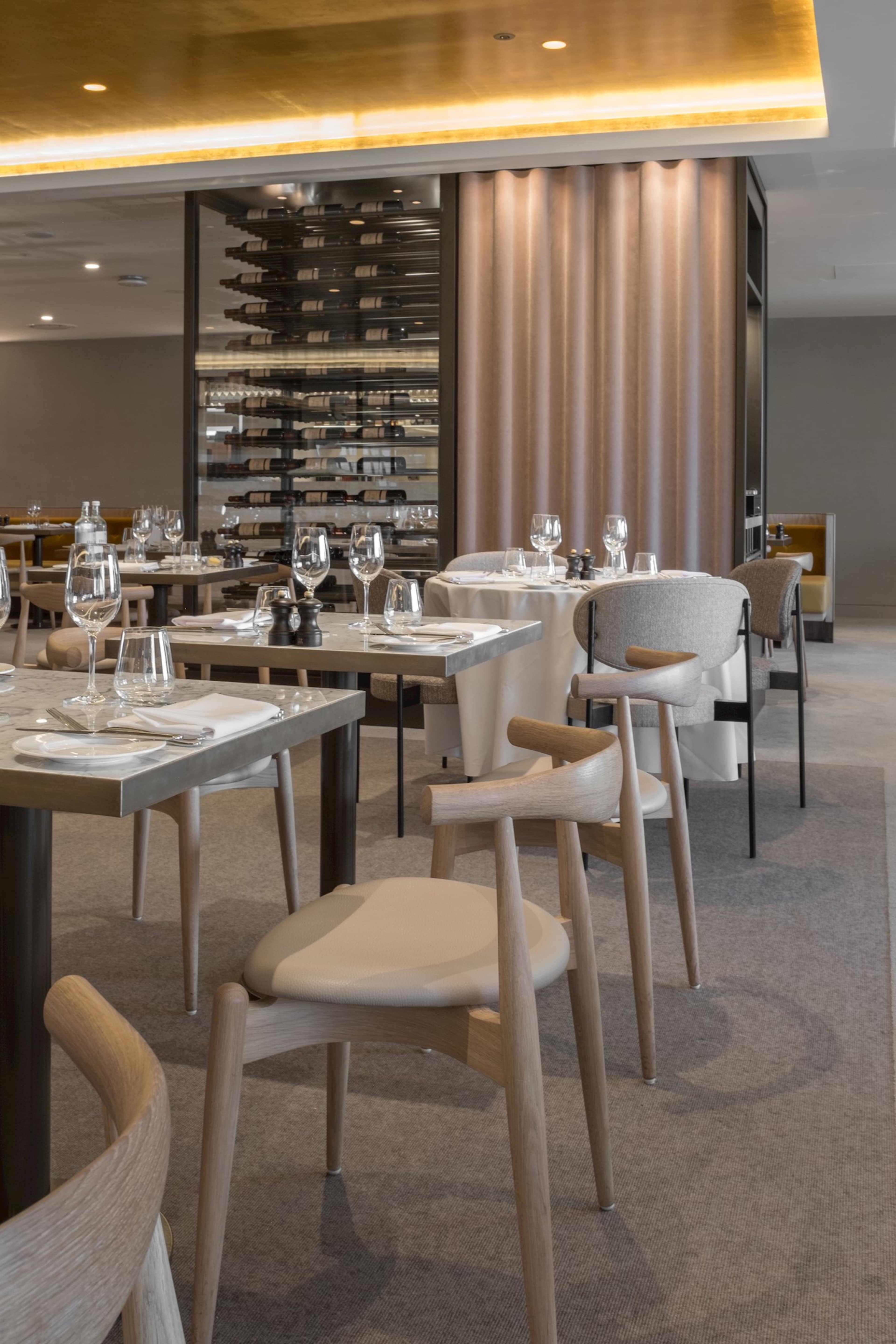 Med sit organisk formede kopstykke og sæde udgør Wegners CH20 stol restaurantens skulpturelle element. Stolens lyse stel i eg og naturfarvede lædersæde harmonerer på smukkeste vis med den øvrige farvesætning.