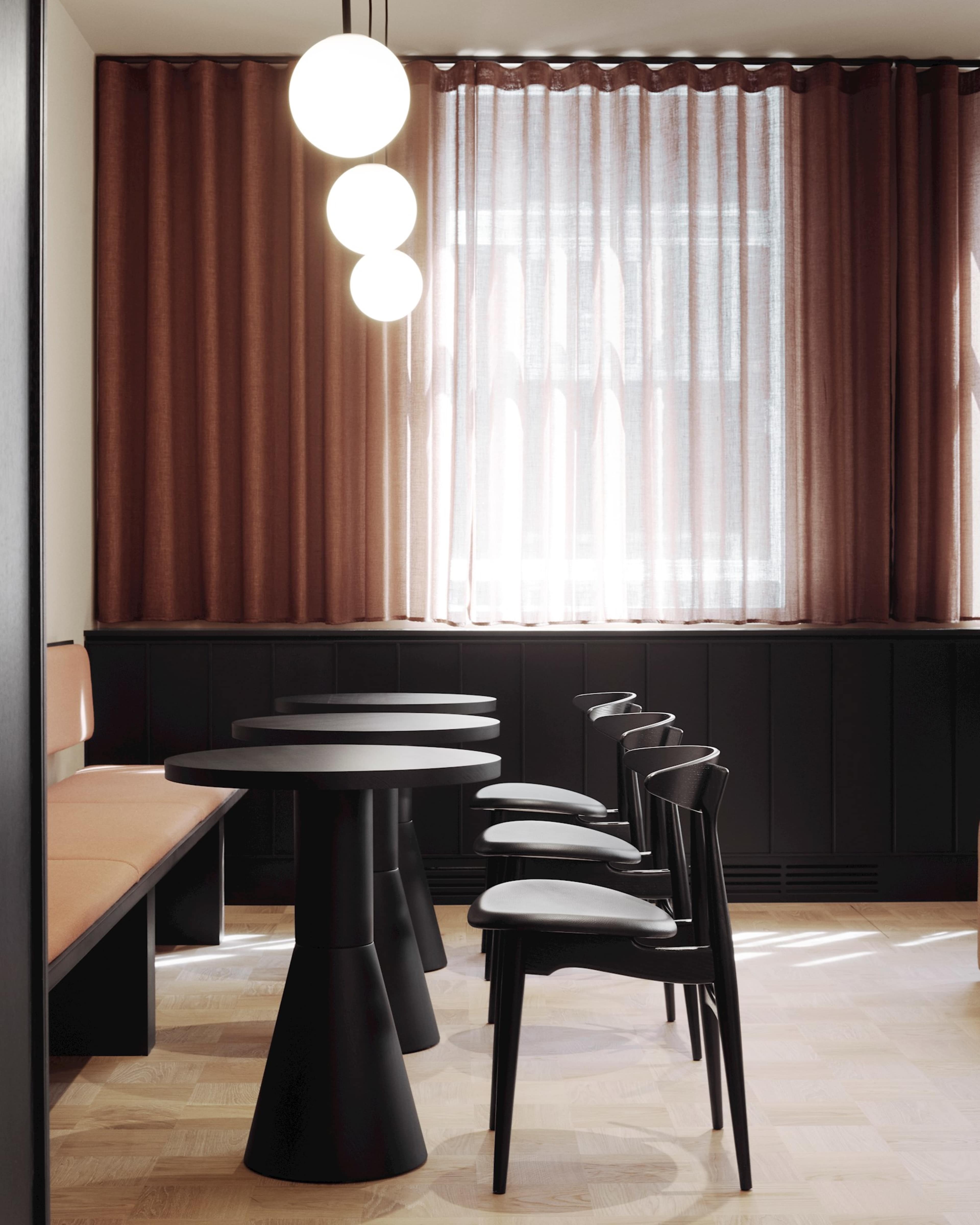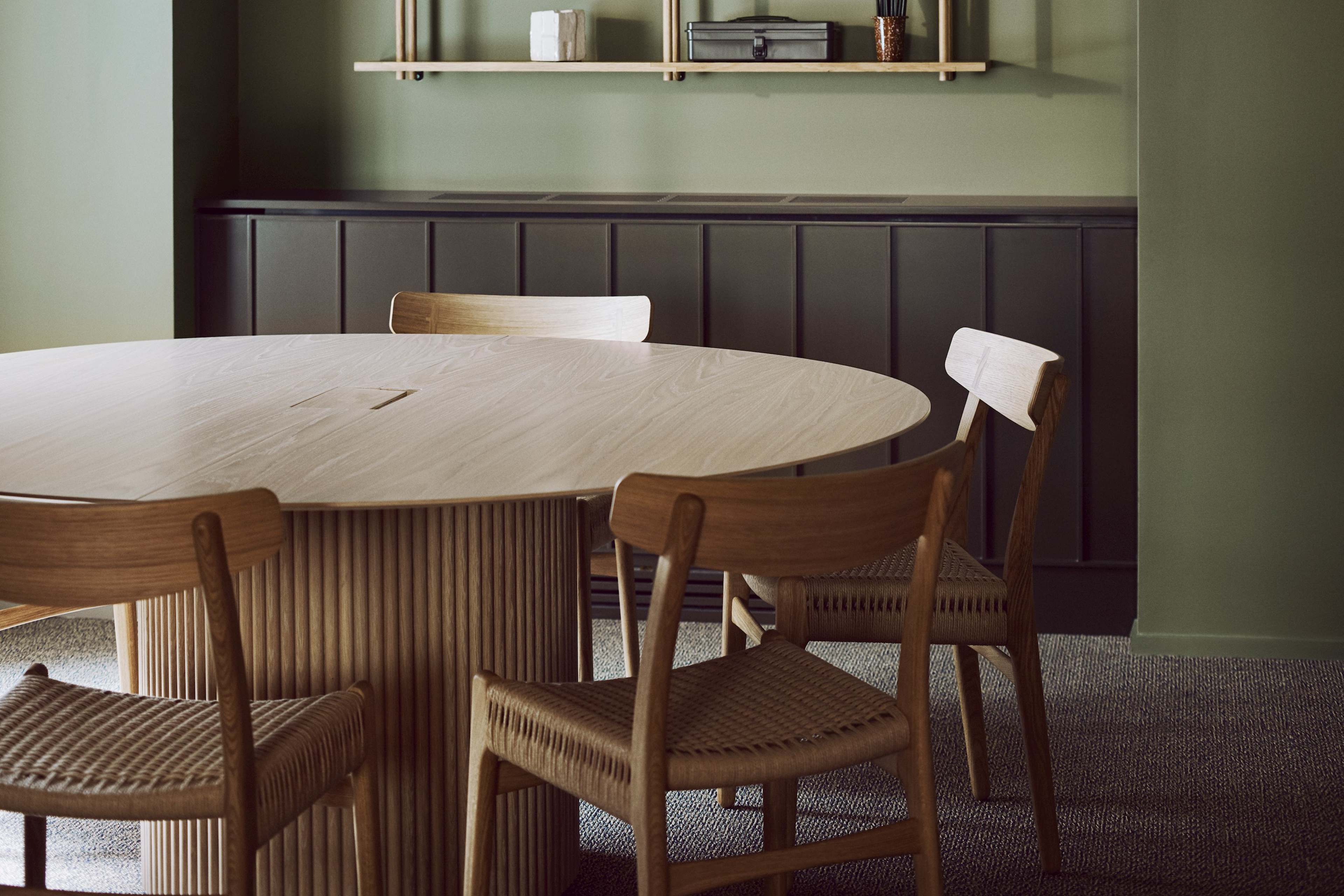 Mødelokaler med olivengrønne vægge har hylder i træ og messing samt runde træborde omgivet af CH23 stole. ”Det er en let, holdbar og overraskende behagelig stol, hvilket betyder, at den egner sig perfekt til et sted, hvor folk tit har brug for at sidde i lange møder,” forklarer Karlström om CH23 modellen, som Hans J. Wegner skabte i 1950.