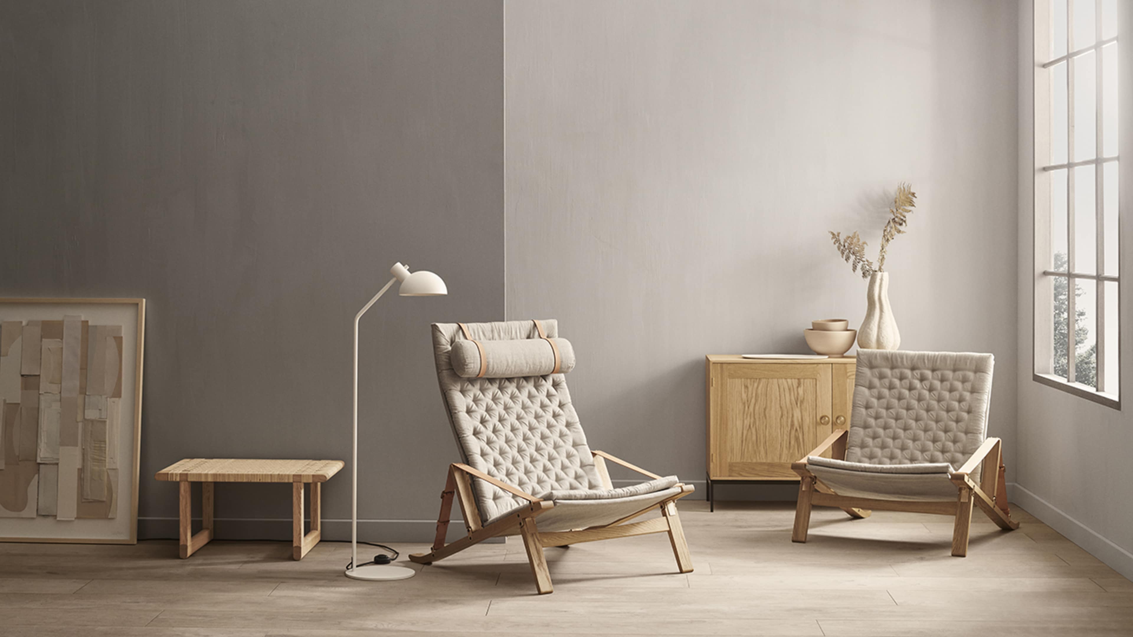 Sammenklappelige loungestole med et unikt udtryk, designet af Fabricius Kastholm og udført i højeste standard af en iøjnefaldende sammensætning af certificeret solidt egetræ og kviltet hørkanvas.