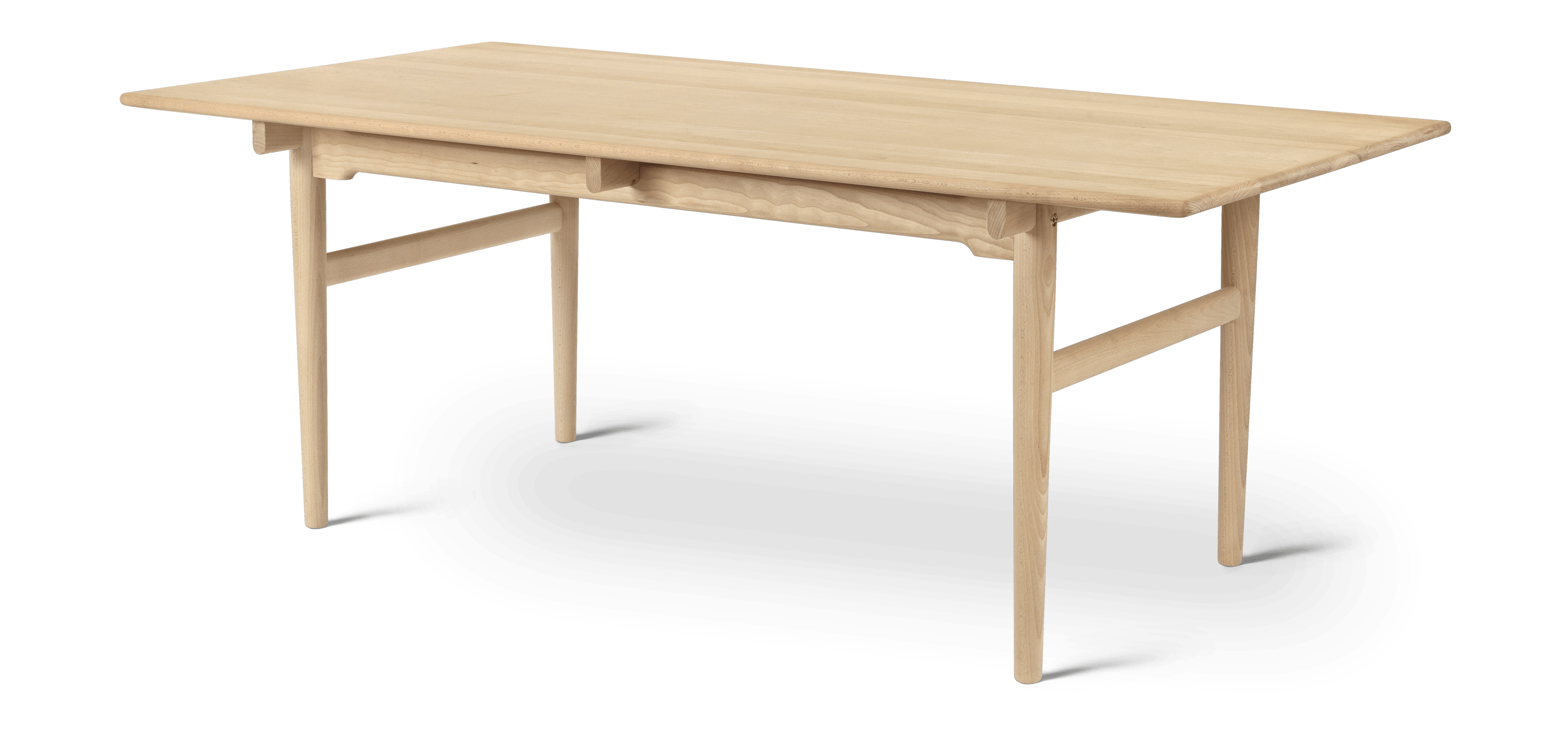 Der Esstisch CH327 von Hans J. Wegner aus dem Jahr 1962 ist ein gutes Beispiel dafür, wie Kreativität in Verbindung mit exzellenter Handwerkskunst zu einem außergewöhnlichen, interessanten Design führen kann. CH327 ist ein Esstisch aus Massivholz mit weichen Kanten und abgerundeten Beinen, die zum Boden hin schmaler werden. Die Maserung des Holzes folgt der Länge der Tischplatte, die von drei verschiedenen Schienen getragen wird. Unter den Schienen befindet sich auf jeder Seite eine Seitenschiene, die sich entlang der Länge des Tisches fortsetzt. Zwischen der Seitenschiene und der Tischplatte ist ein Zwischenraum. So entsteht der Eindruck, dass die Tischplatte schwebt. An jedem Ende befinden sich zwei abnehmbare Beine, die mit einer Querstrebe verbunden sind. Die Beine und Streben sorgen für Stabilität in Querrichtung, während die Seitenschienen für Stabilität in Längsrichtung sorgen. Die Seitenschienen sind an den Tischbeinen höher und liegen enger zusammen, um die Beinfreiheit beim Sitzen zu erhöhen. Der CH327 ist in zwei Längen erhältlich: 190 cm für sechs Personen und 248 cm für acht Personen. Beide Tische können an jedem Ende mit einer 40 cm breiten Zusatzplatte verlängert werden, wodurch sich die Anzahl der Sitzplätze auf zehn und zwölf erhöht. Der elegante CH327 Table von Wegner ist sowohl als Esstisch als auch als Konferenztisch geeignet. Er kann auch ohne Weiteres als Schreibtisch verwendet werden.