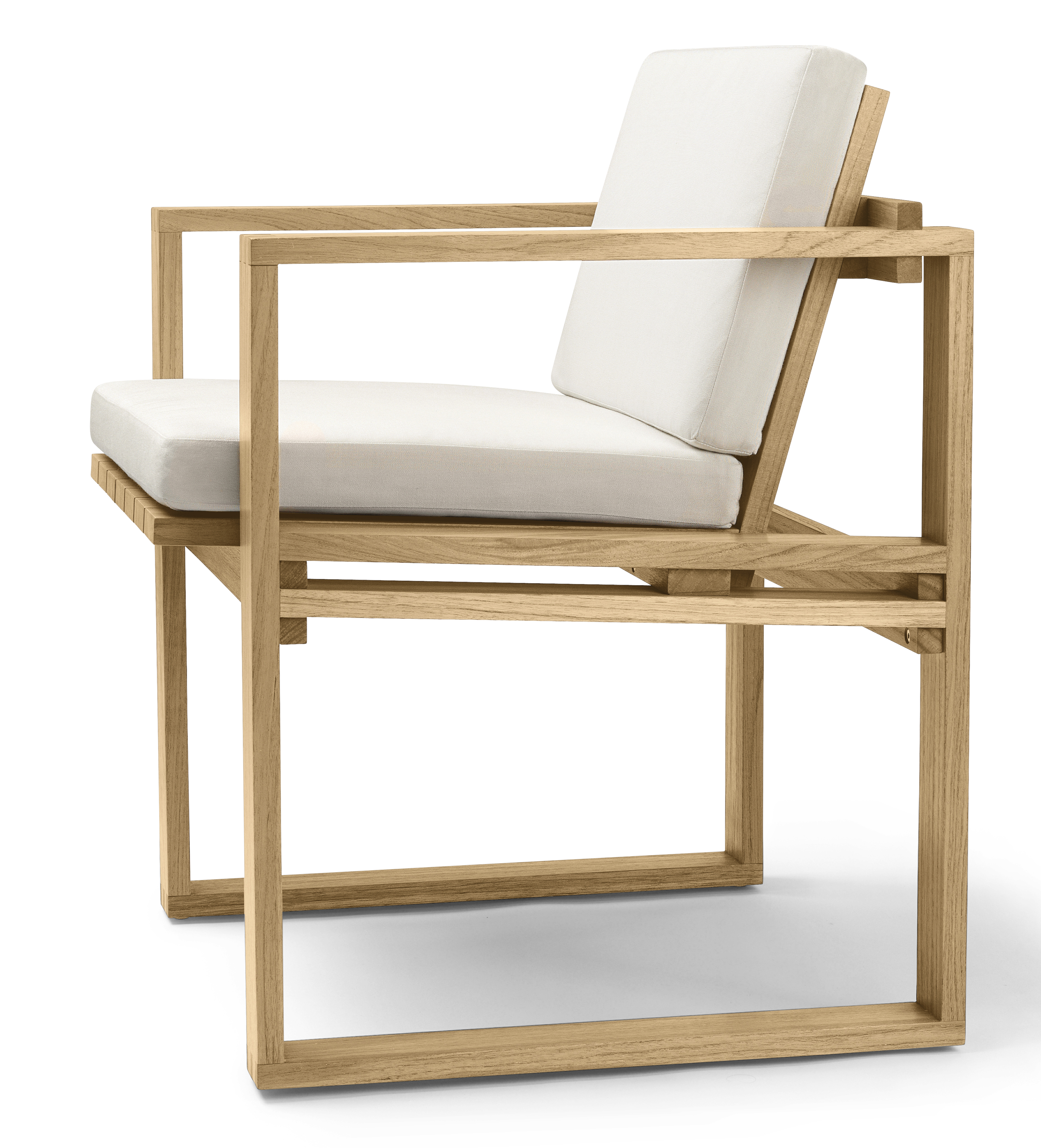 Der BK10 Dining Chair von Bodil Kjær zeichnet sich durch klare Linien und eine formvollendete Grafik aus. Er sieht im Außenbereich genauso gut aus wie in der Inneneinrichtung, und genau das war auch die Absicht der dänischen Architektin. Er ist aus massivem Teakholz hergestellt, und der kubistisch inspirierte Stuhl ist so konzipiert, dass er im Laufe der Zeit wunderschön patiniert. Trotz seiner robusten Konstruktion besticht er durch ein feines, lineares Aussehen. Der Stuhl wurde 1959 als Teil einer Reihe von architektonisch inspirierten Möbeln für den Innen- und Außenbereich geschaffen, deren Proportionen so gestaltet wurden, dass sie sich in die Umgebung einfügen. Der Sitz und die Rückenlehne des Stuhls sind bequem gewinkelt, und er hat Armlehnen, Beine und Kufen, die zwei Quadrate bilden – ein Detail, das nur von exzellenten Handwerkern umgesetzt werden kann. Neben dem Esszimmerstuhl umfasst die Indoor-Outdoor Series von Kjær auch einen Loungesessel, einen Beistelltisch, einen Esstisch, ein Zweisitzer-Lounge-Sofa, ein Schaukelsofa und eine Sonnenliege. Für alle Sitzgelegenheiten, Stühle und Liegen sind elegante Auflagen aus witterungsbeständigem Sunbrella-Stoff erhältlich.