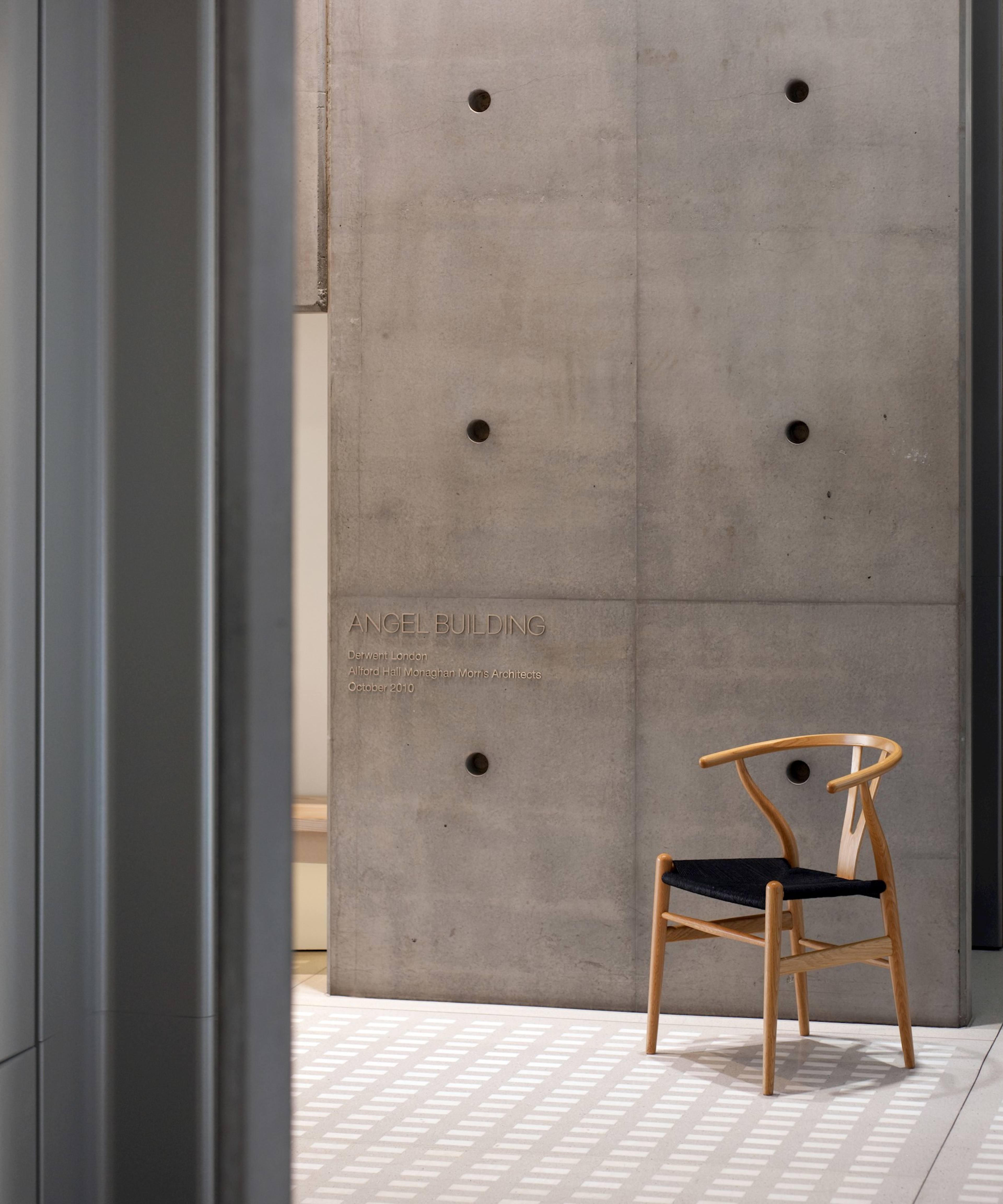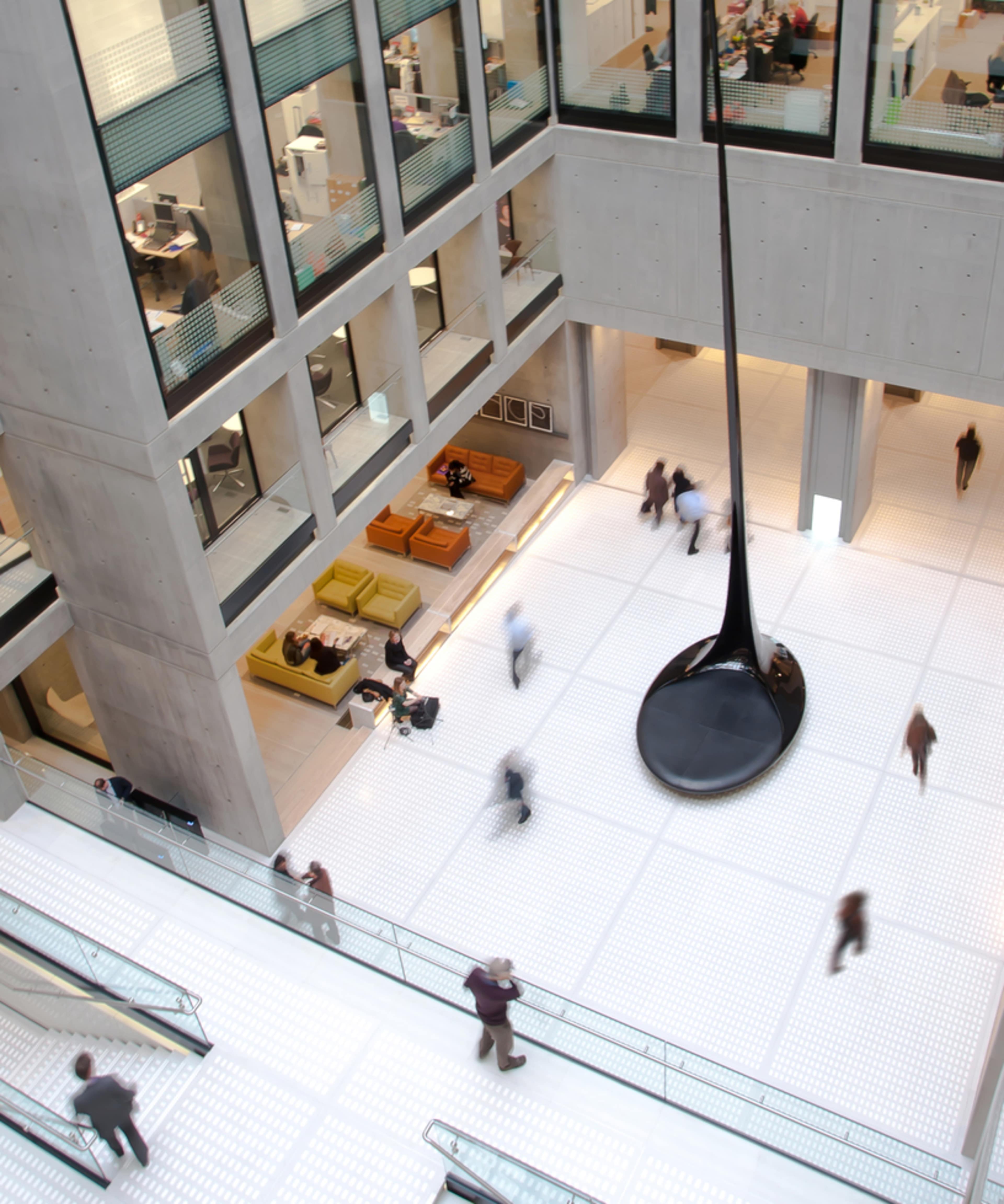 When you step into the hall of the Angel Building and proceed into the large atrium, your first impressions are of good proportions, natural materials and abundant and pleasant natural lighting. The atrium floor is polished light terrazzo with a simple checked pattern, and the walls and columns are raw, smooth concrete. The room's point de vue is the Out of the Strong Came Forth Sweetness drop-shaped ebony sculpture, which is 22 meters tall and also serves as a lounge. The work is by Ian McChesney and occupies the center of the atrium.