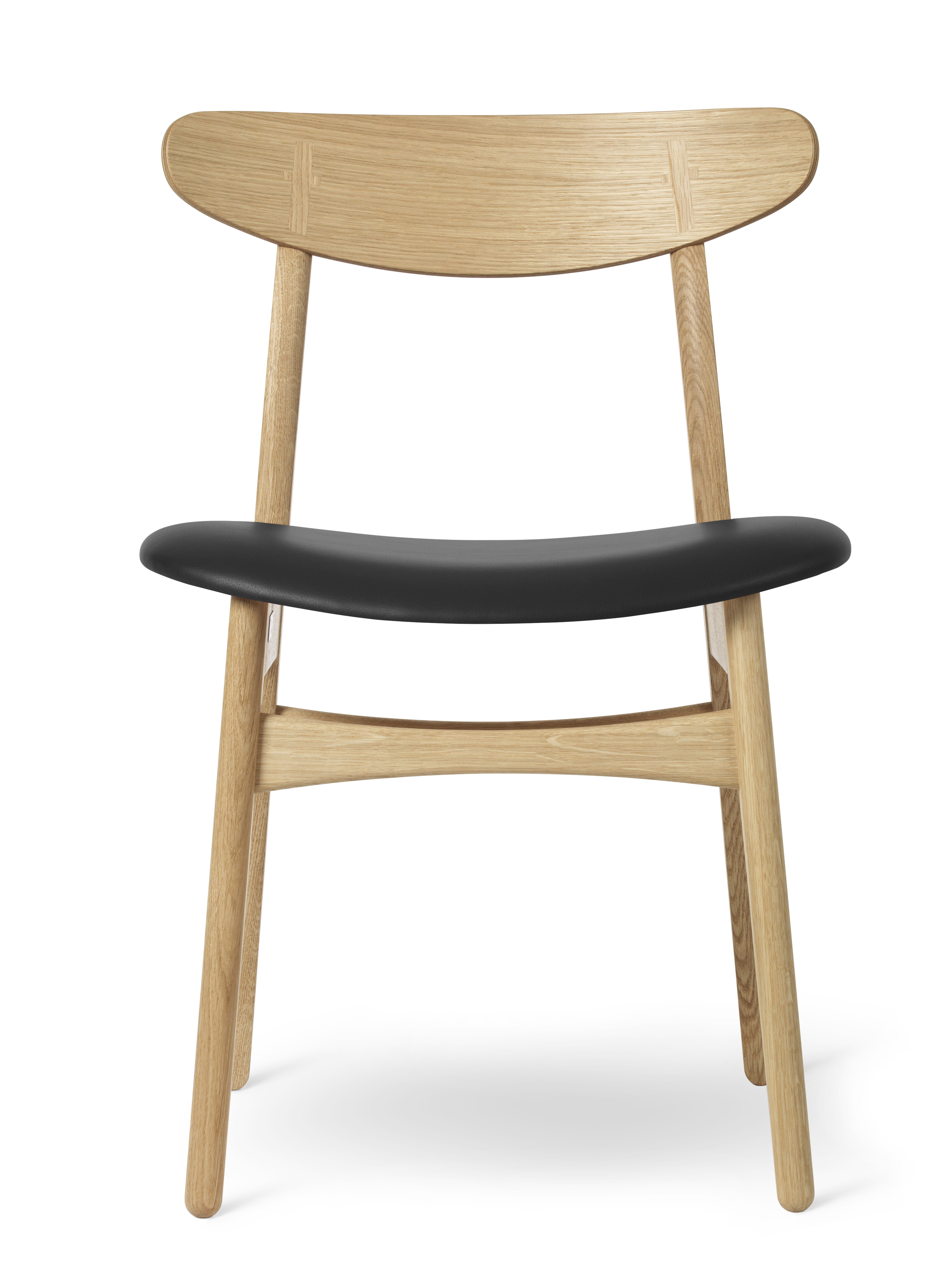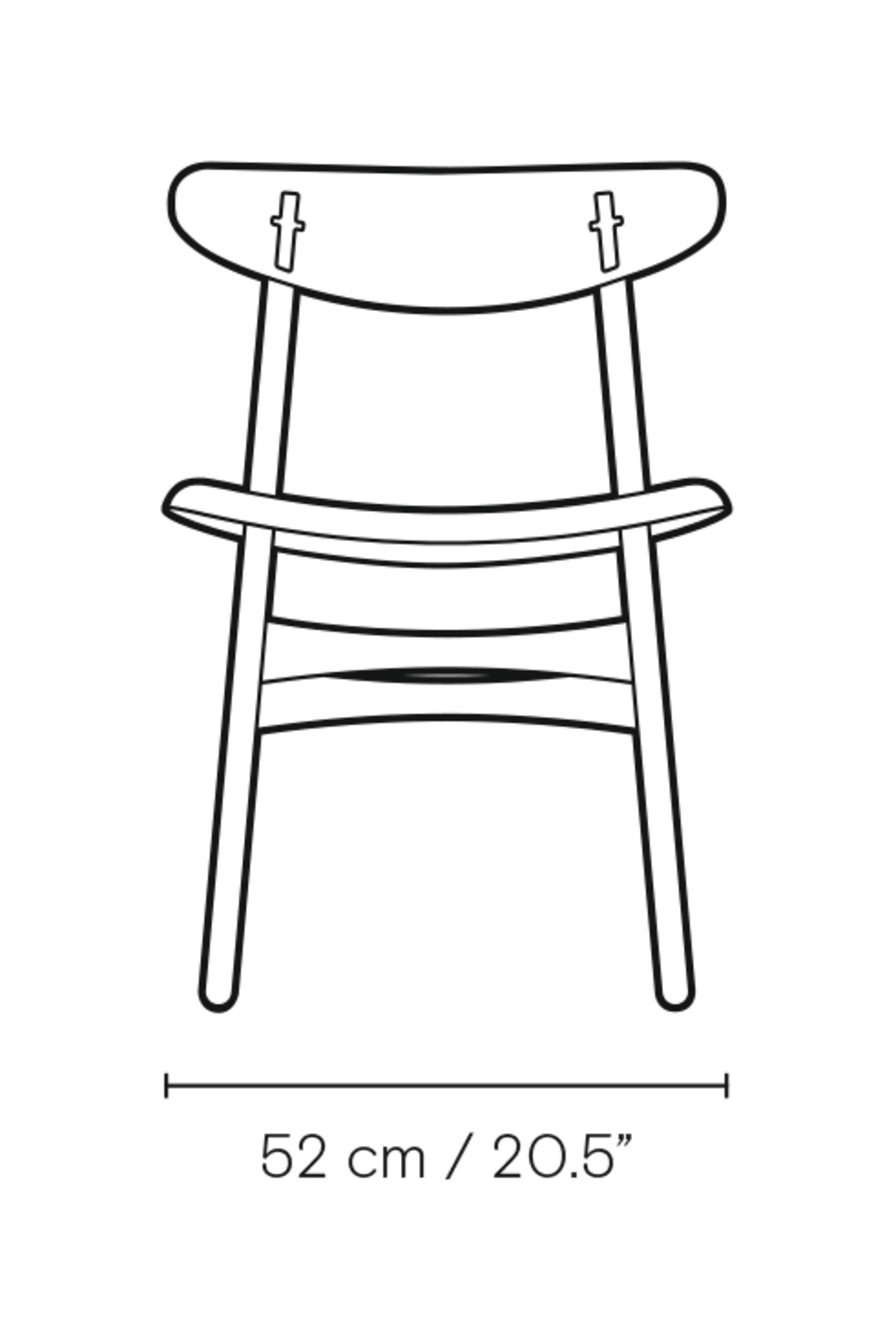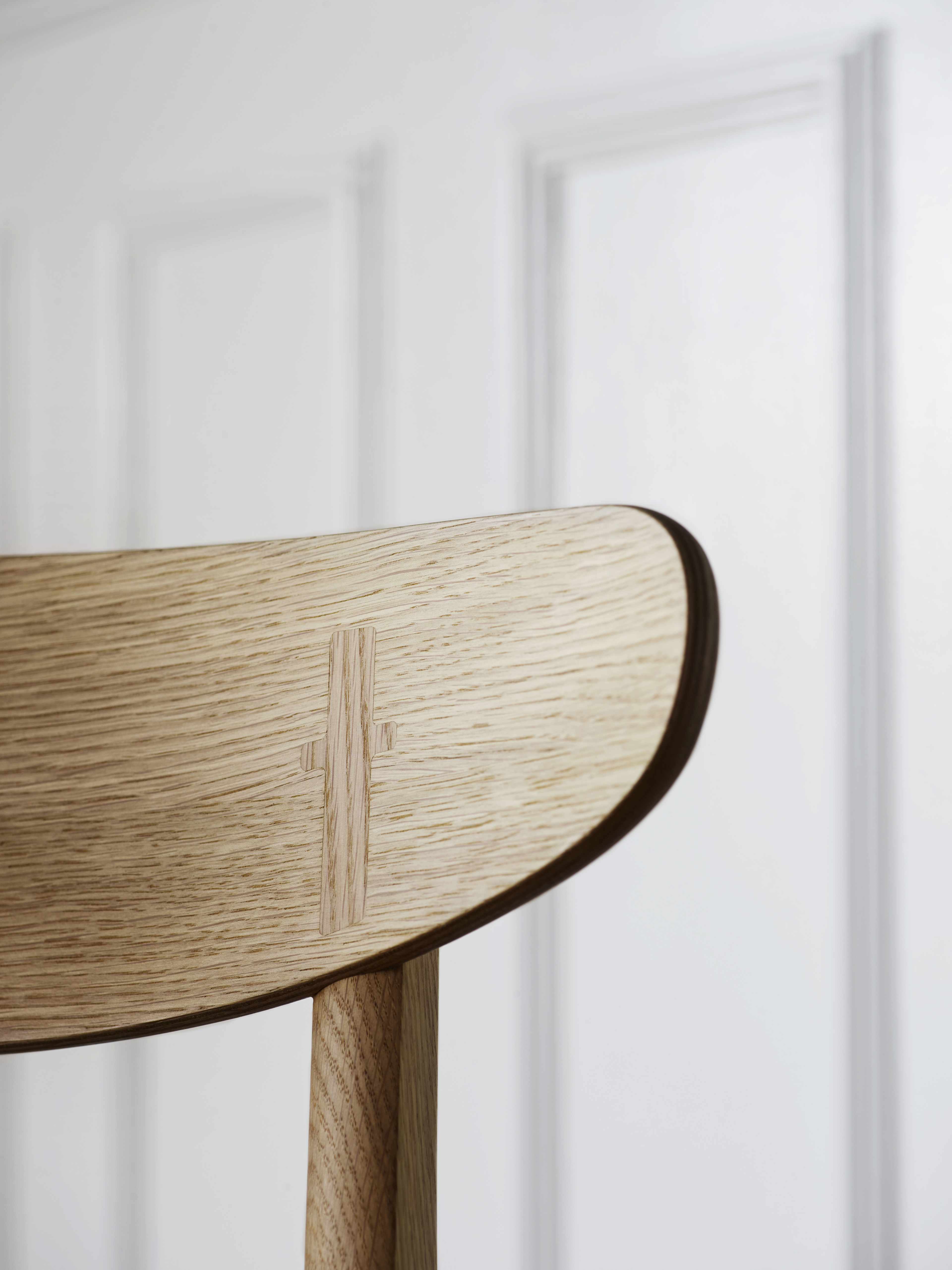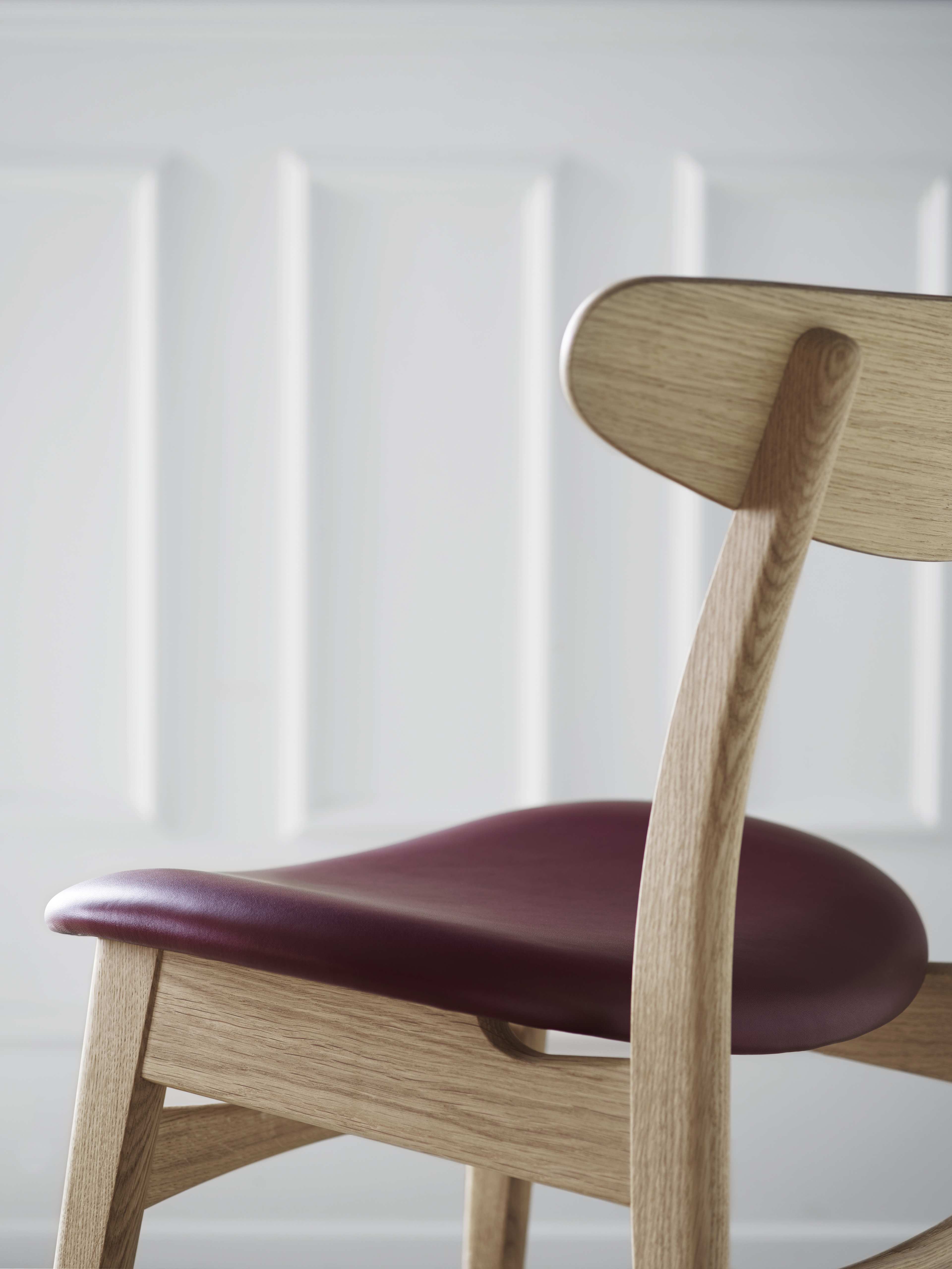 家具職人としてのこだわりが伺える背の部分に施された、クラフトマンシップ溢れる十字形の埋木、そしてカーブする後ろ脚に沿って傾斜するように配された、オーバル形のバックレスト。ウェグナーならではの意匠が随所に見られます。さらにバックレストは、成形合板製のゆったりとした座面と相まって、素晴らしい使用感と高い機能性を創り出すよう考慮されています。コンパクトなアームレス構造。テーブルの周りにあまり場所を取らないことも利点の一つです。
