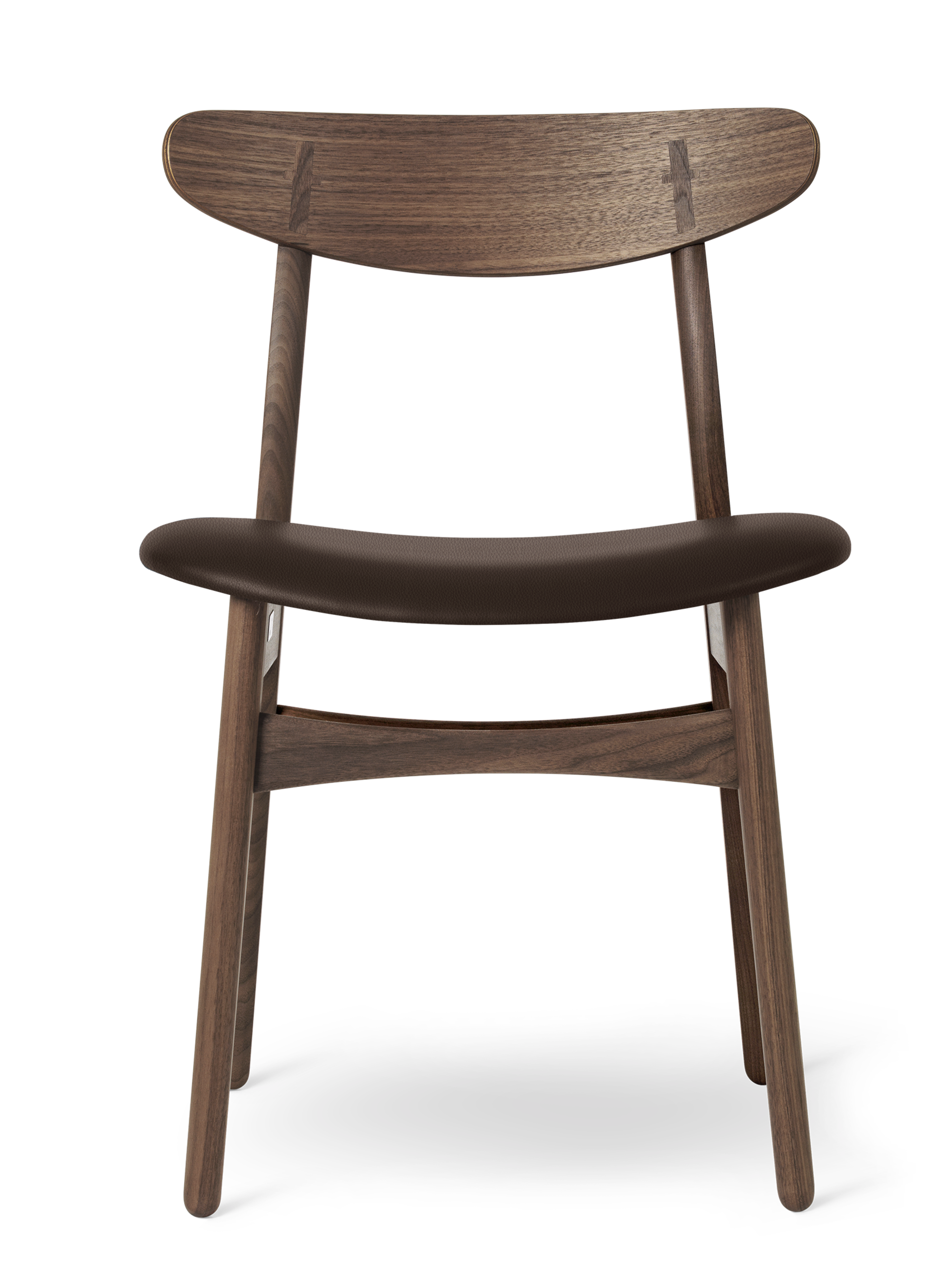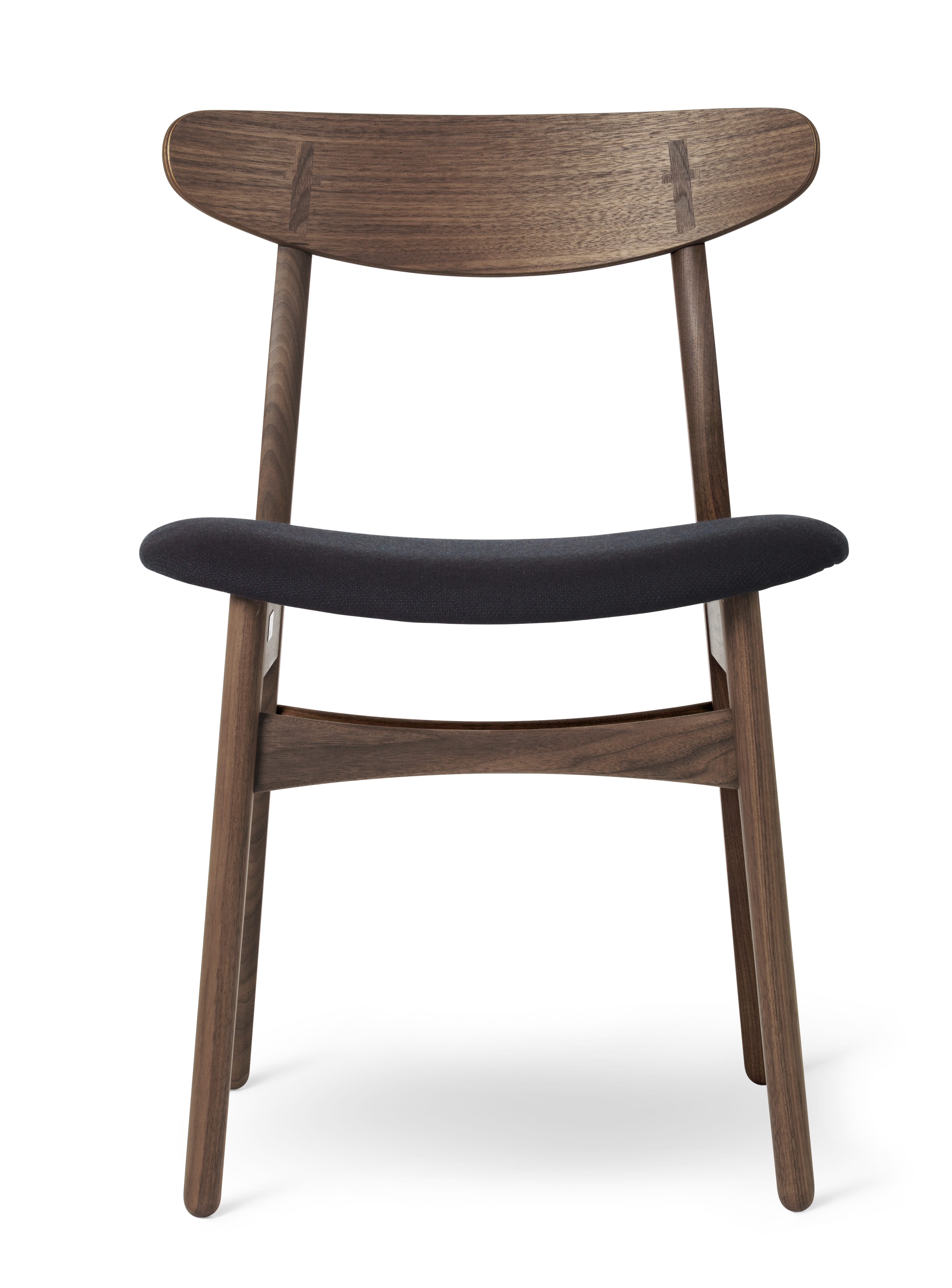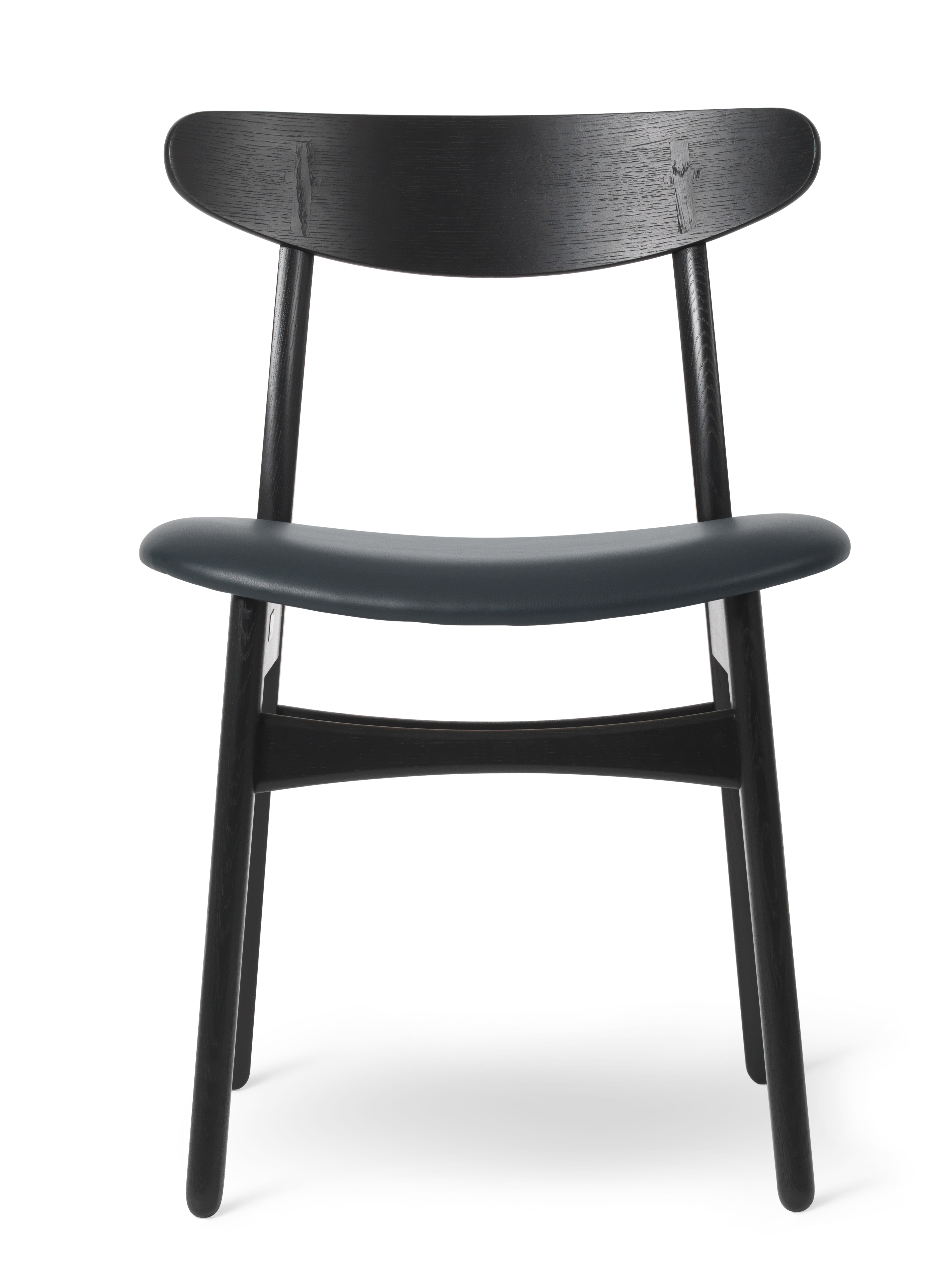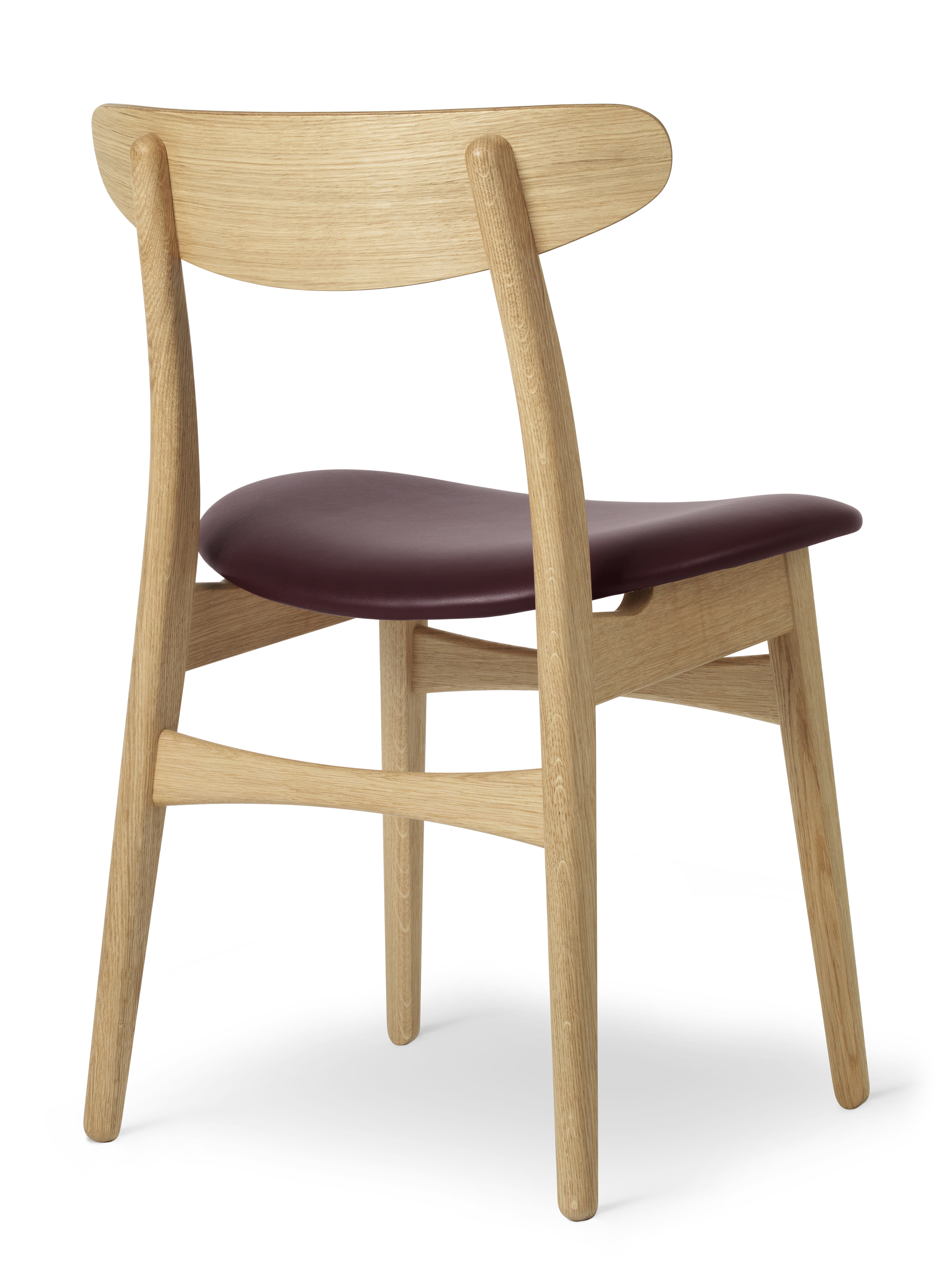 家具職人としてのこだわりが伺える背の部分に施された、クラフトマンシップ溢れる十字形の埋木、そしてカーブする後ろ脚に沿って傾斜するように配された、オーバル形のバックレスト。ウェグナーならではの意匠が随所に見られます。さらにバックレストは、成形合板製のゆったりとした座面と相まって、素晴らしい使用感と高い機能性を創り出すよう考慮されています。コンパクトなアームレス構造。テーブルの周りにあまり場所を取らないことも利点の一つです。