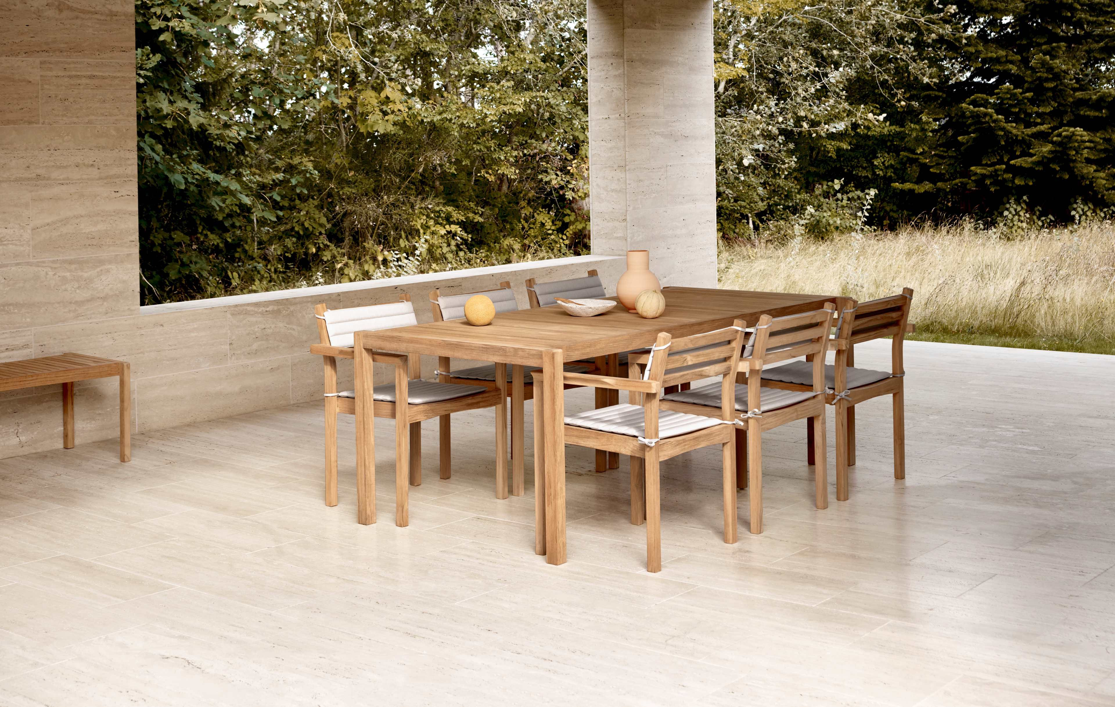 デザイナーとしてのホーマンは、余分なディテールのないかっちりとした美と、機能性へのこだわりで知られると同時に、ソフトな形状も好み、AH Outdoorシリーズにはその両面が反映されています。また、家具はスタッキングが可能で、季節が変わったら収納するのも簡単です。ホーマンのデザインの両面性は木の接合部のディテールにも見て取れます。バーがフレームに美しく一体化され、シンプルで洗練された表情を添えています。