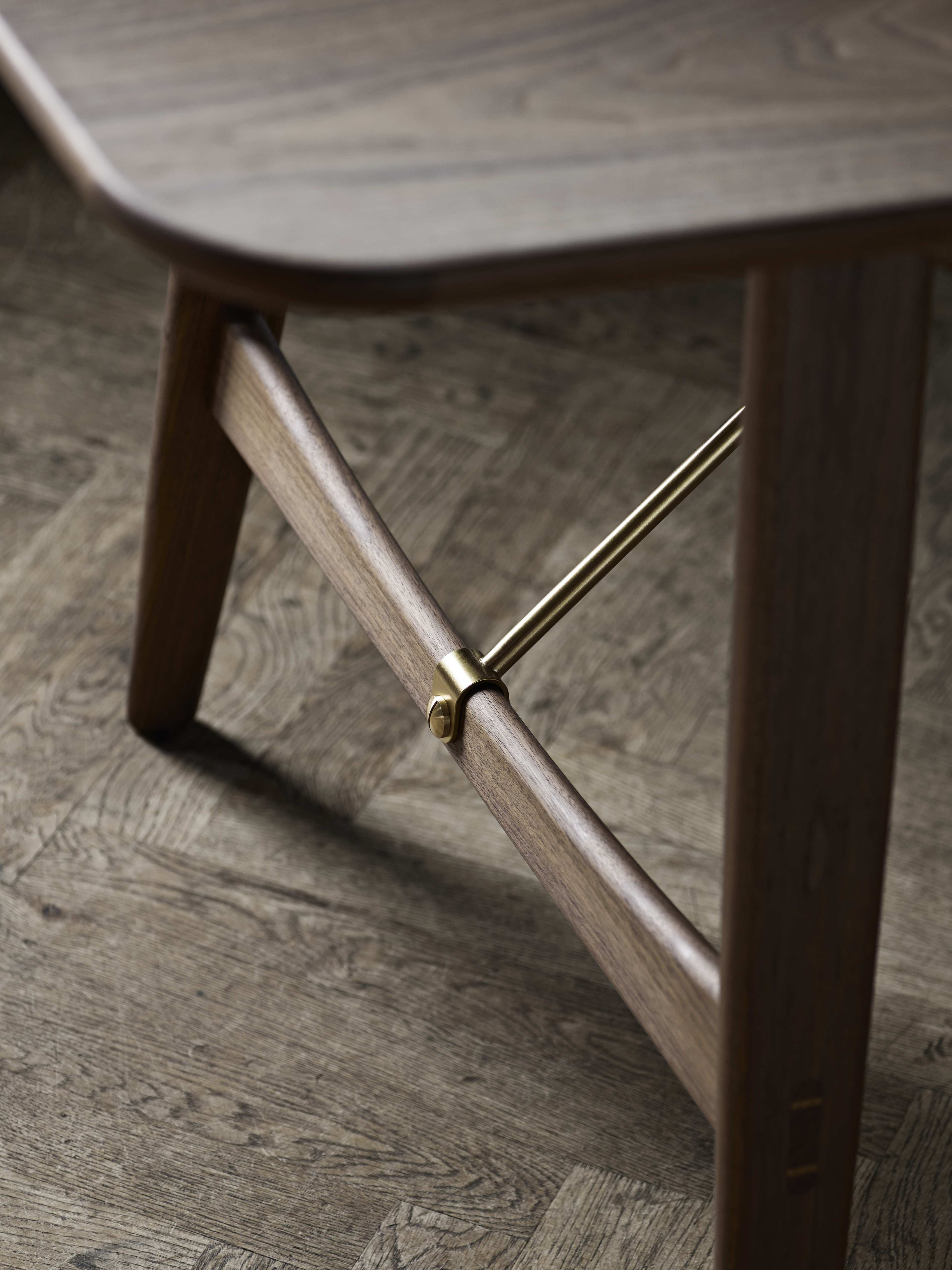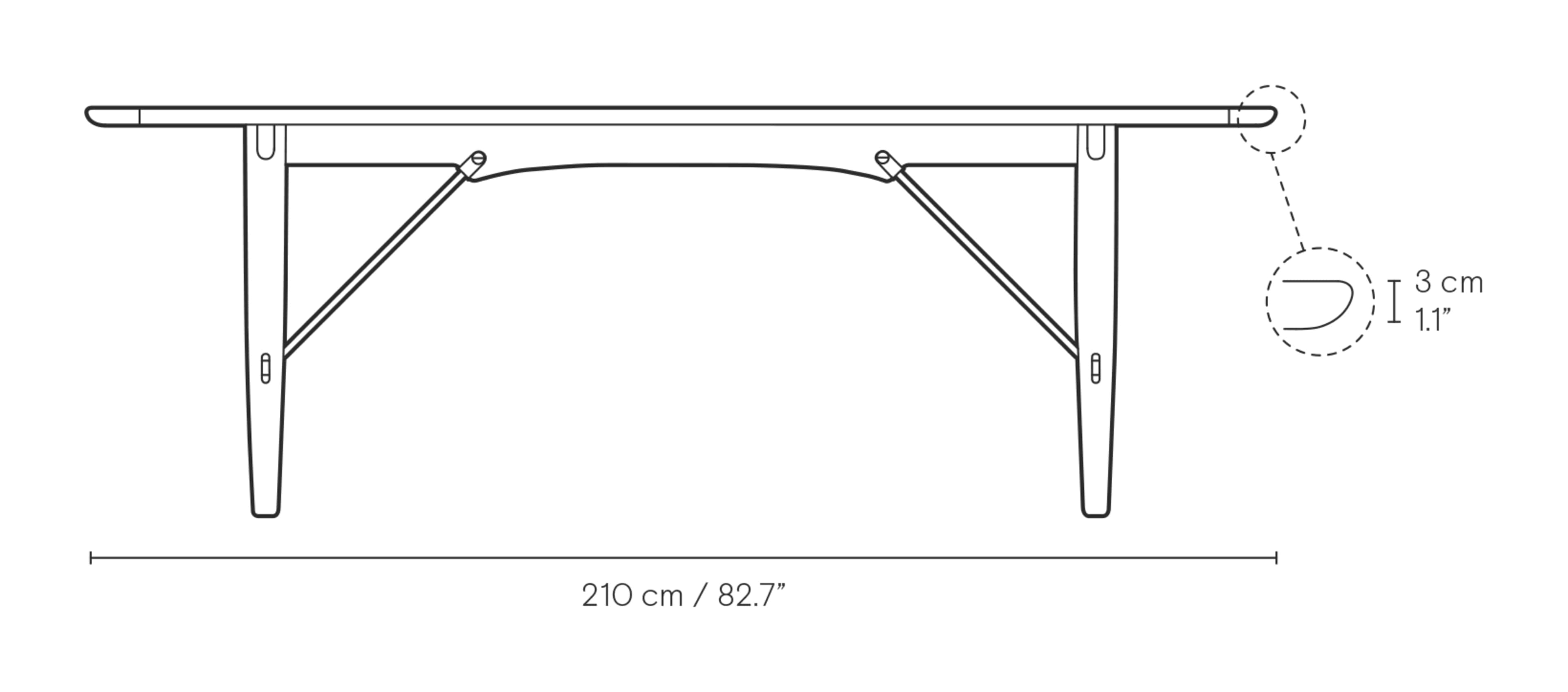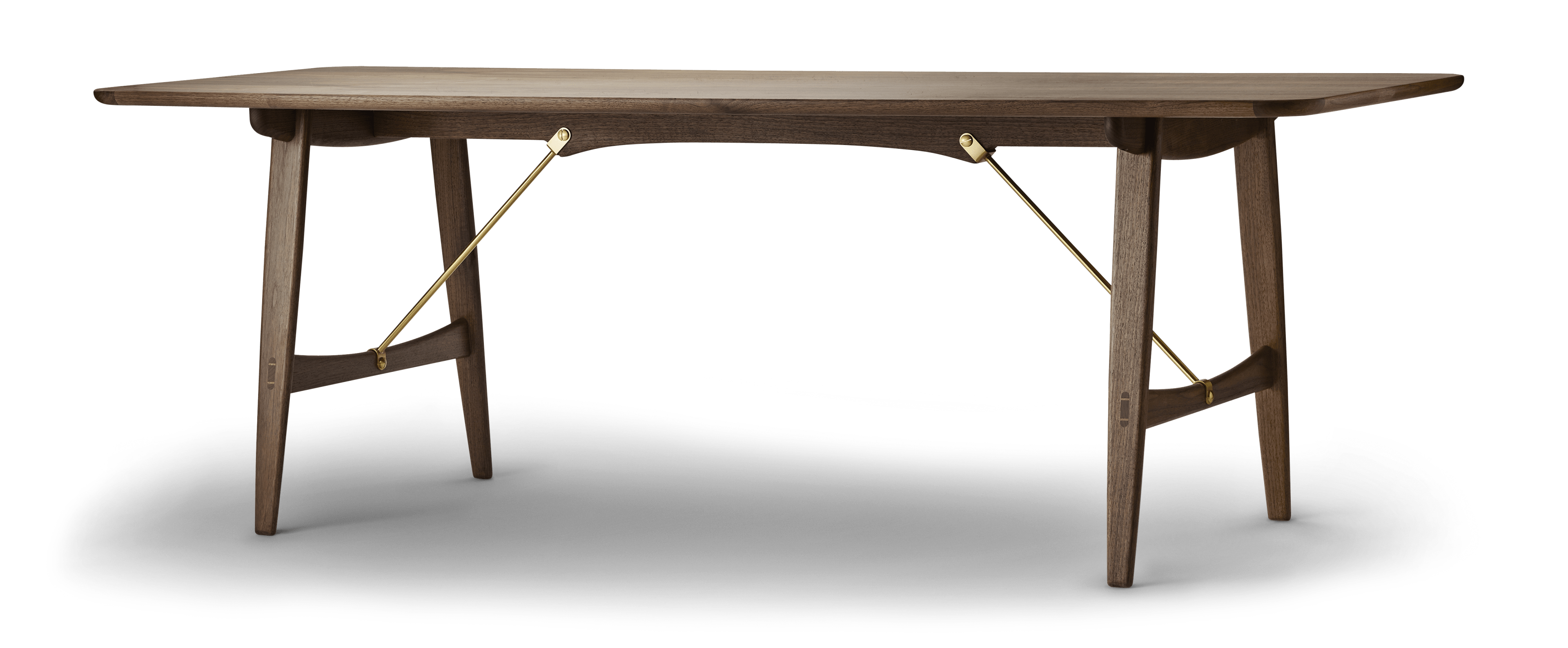 ボーエ・モーエンセンのBM1160 ハンティングテーブル。その名は、「ハンティングロッジ」をテーマに開催されたコペンハーゲン家具職人ギルド展で発表されたことと、野性味あふれる木材のイメージから来ています。 モーエンセンのハンティングテーブルの天板は、他のテーブルに比べて細身。空間に限りある場所にも適するほか、テーブル周りにより親密な雰囲気を演出します。そして丸みを帯びた加工が映える木部の意匠。テーブルの各部に繰り返し用いられる無駄のない美しいディテールです。誰にもでも手の届く家具を追求したモーエンセンのデザインが哲学の表れとも言えます。テーブルに安定性を与えるのは真鍮製の2本の支柱。天板と脚部を優雅に、そして印象的に接合する、考慮された意匠です。また、ほぞ継ぎや職人技が映えるコントラストをつけた木製のくさびなど、脚部の美しさが、テーブルの優雅さを強調しています。