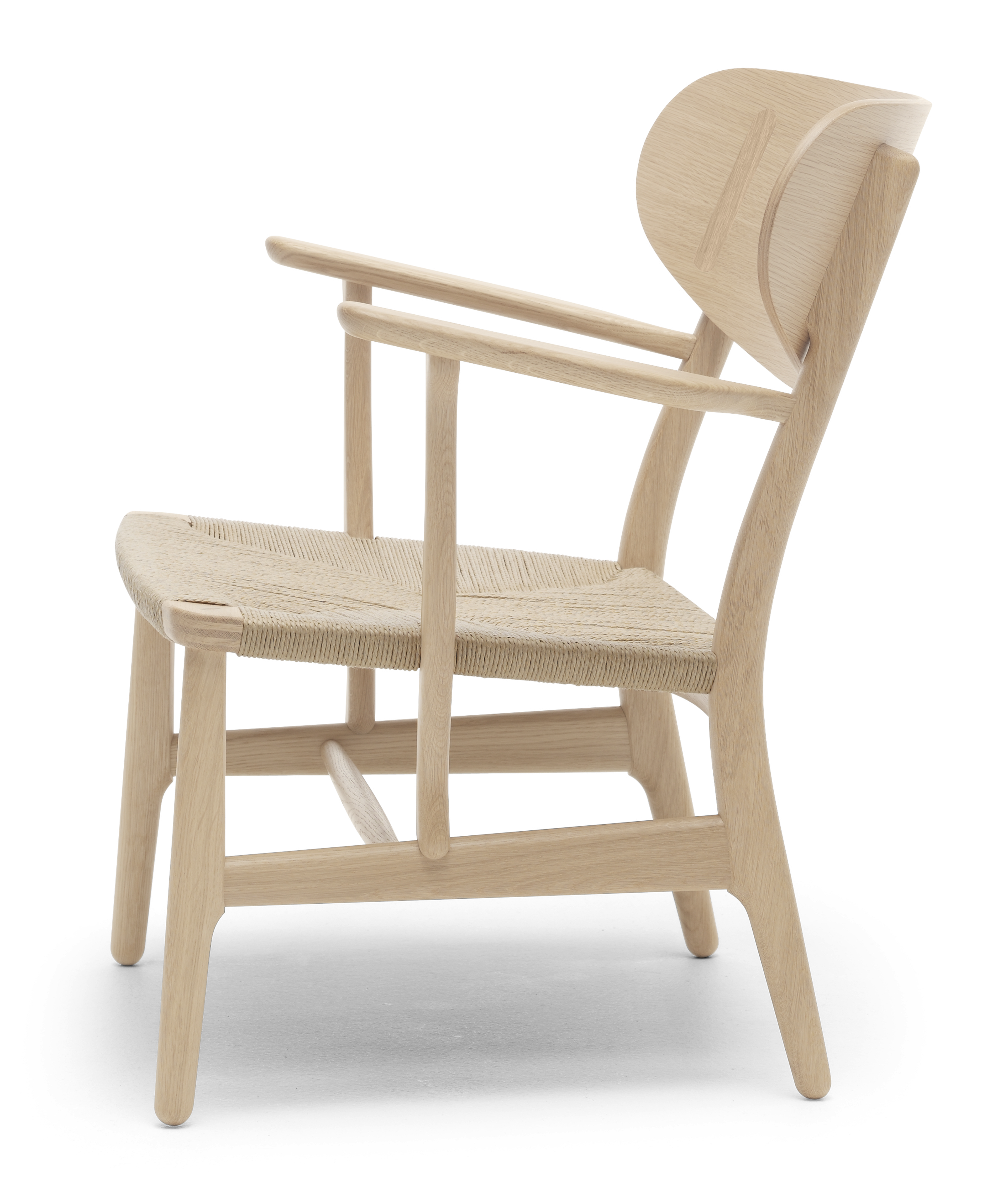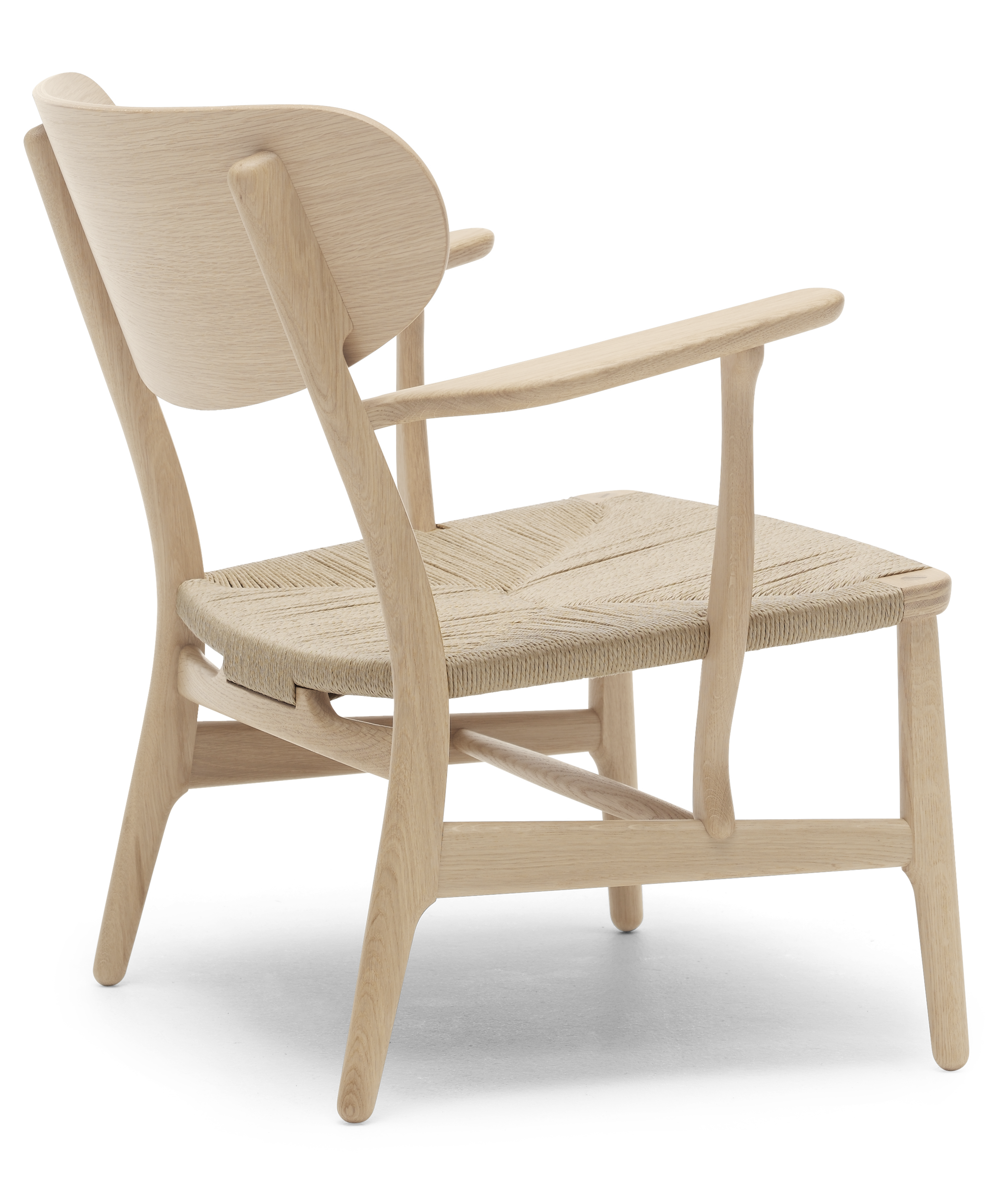 ハンス J. ウェグナーのラウンジチェア CH22は、カール・ハンセン&サンにより2016年、数十年の年月を経て生産が再開された復刻モデル。アームレストの形状、ペーパーコードを施した座面、そして印象的な成形合板製の背もたれ。随所にウェグナーデザインならではの特徴が見られる椅子となっています。そして、背に施された木製の楕円形の埋木。ウェグナーならではの印象的な意匠です。また、優れた職人の技も各所に見ることができます。座面フレームのコーナーに施されたフィンガージョイント、前脚の接合に用いられた木製の楔。フレームと別素材を用い美しいコントラストを創り出しています。 組立、仕上げ、そして座面のペーパーコード張り。今日生産機器こそ近代化されましたが、1950年にカール・ハンセン&サンでウェグナーが試作品を製作した当時と同じように今でも製作されています。 ラウンジチェア CH22は、ウェグナーがカール・ハンセン&サンに初めてデザインした、椅子コレクションの一つとして発表されました。いずれの椅子もデニッシュモダンのアイコンとして高い評価を受けています。