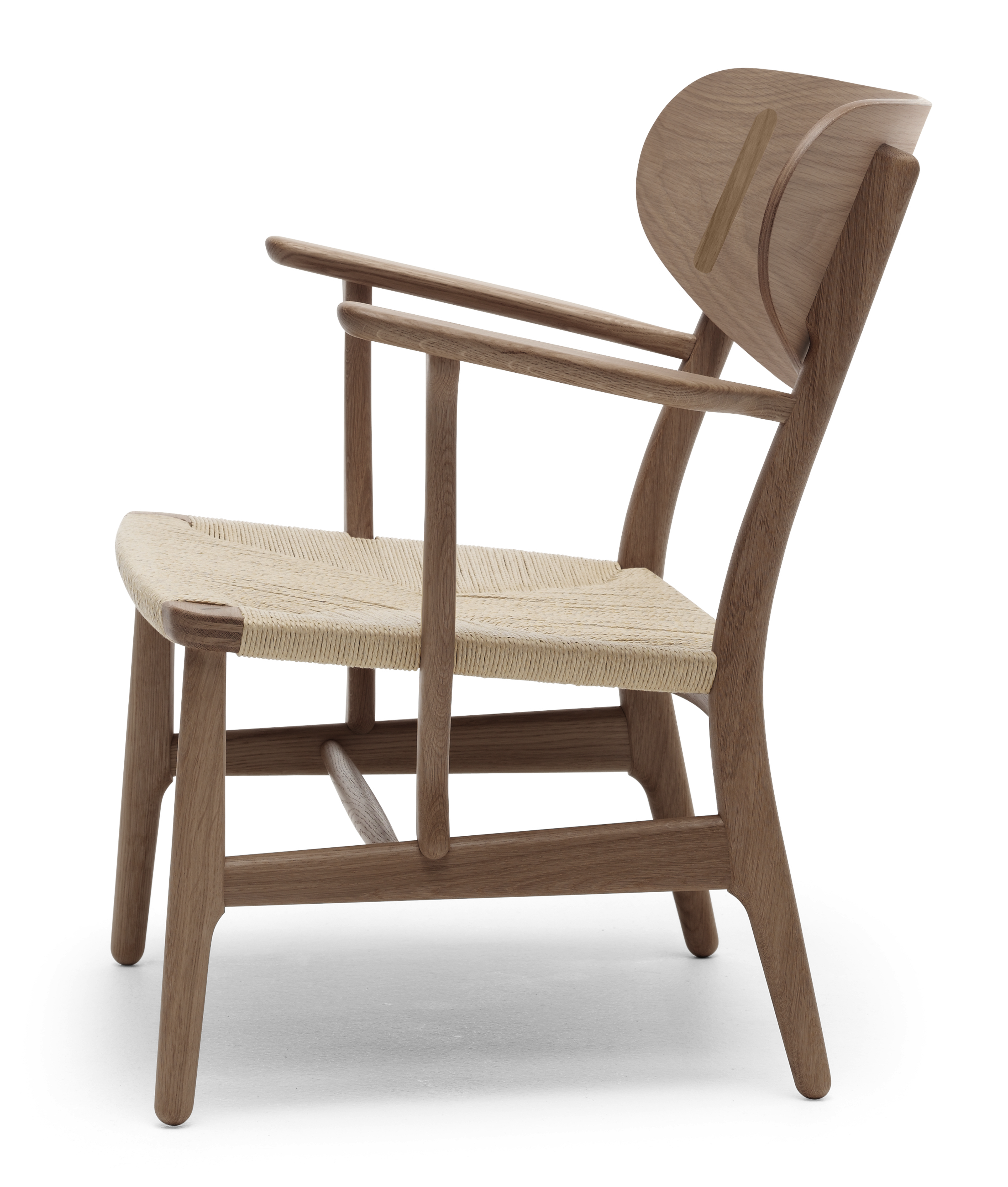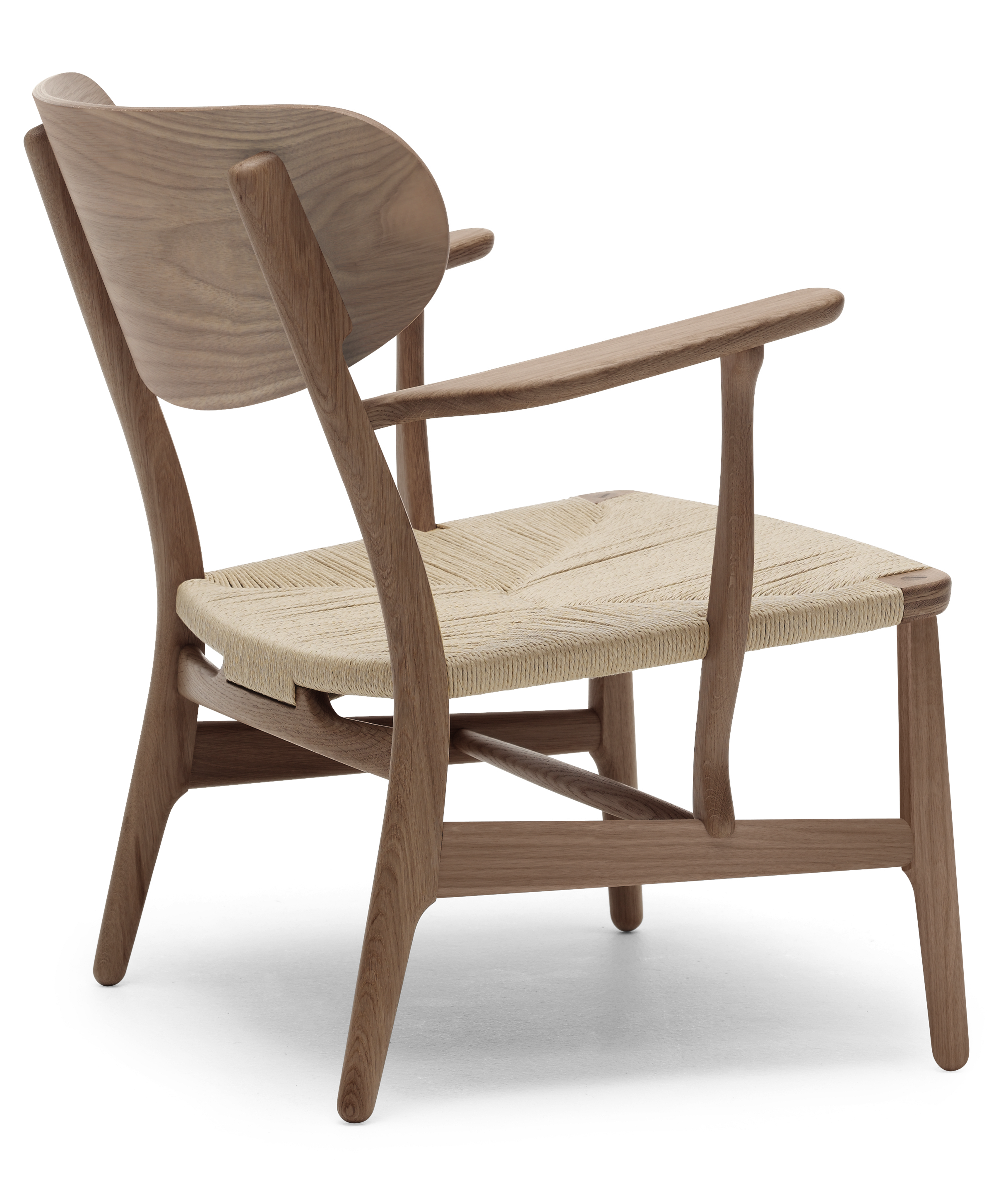 ハンス J. ウェグナーのラウンジチェア CH22は、カール・ハンセン&サンにより2016年、数十年の年月を経て生産が再開された復刻モデル。アームレストの形状、ペーパーコードを施した座面、そして印象的な成形合板製の背もたれ。随所にウェグナーデザインならではの特徴が見られる椅子となっています。そして、背に施された木製の楕円形の埋木。ウェグナーならではの印象的な意匠です。また、優れた職人の技も各所に見ることができます。座面フレームのコーナーに施されたフィンガージョイント、前脚の接合に用いられた木製の楔。フレームと別素材を用い美しいコントラストを創り出しています。 組立、仕上げ、そして座面のペーパーコード張り。今日生産機器こそ近代化されましたが、1950年にカール・ハンセン&サンでウェグナーが試作品を製作した当時と同じように今でも製作されています。 ラウンジチェア CH22は、ウェグナーがカール・ハンセン&サンに初めてデザインした、椅子コレクションの一つとして発表されました。いずれの椅子もデニッシュモダンのアイコンとして高い評価を受けています。