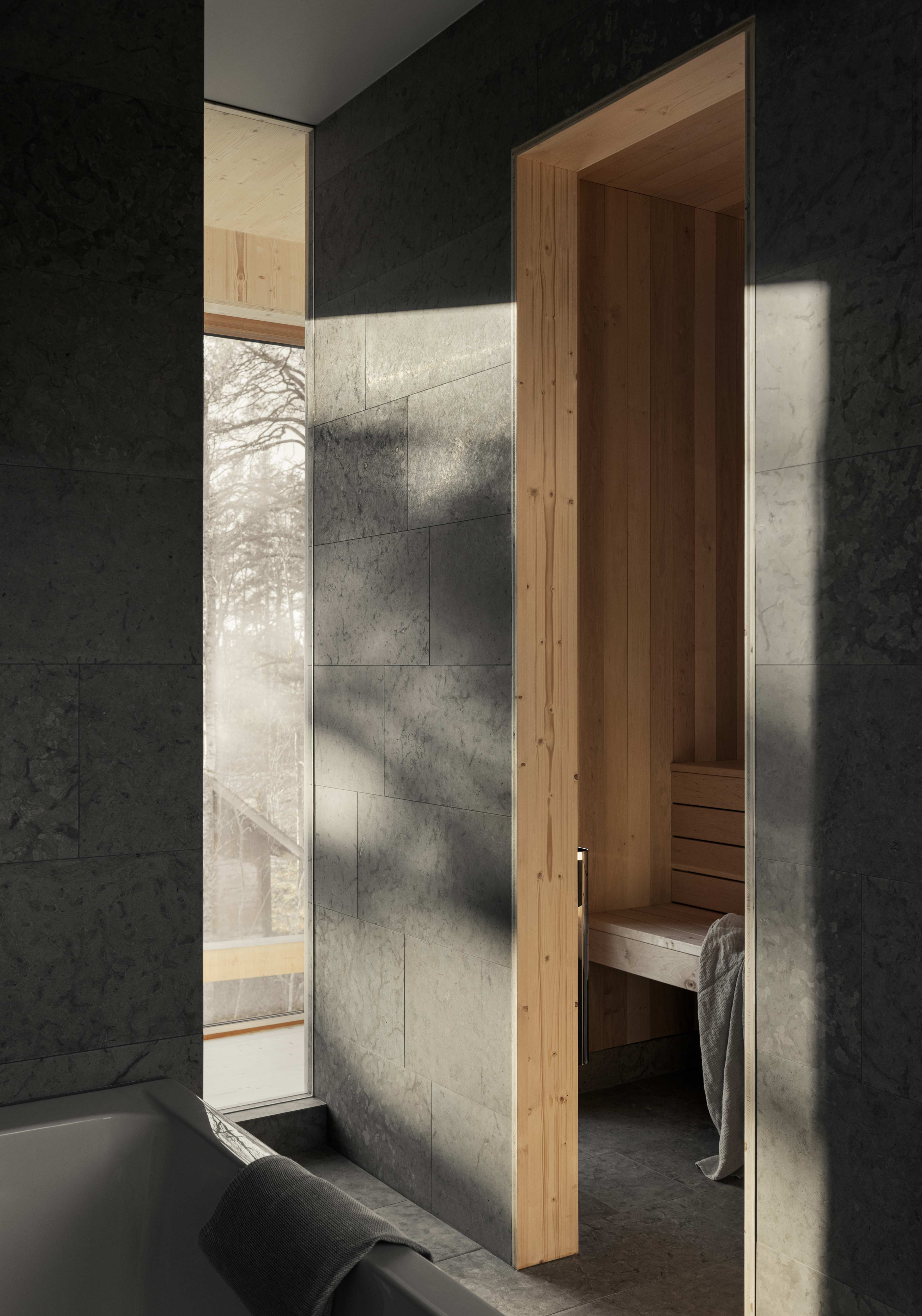 キッチンには、丈夫で持続可能性の証となるスウェーデン産のオークの巨木を使用し、バスルームにはこの地方で採れる石灰岩を配しました。建築の道に入った当初は旧家の復元を行っていたライデンは、「私が主にインスピレーションを受けるのは、シンプルで昔風の形をしたスウェーデンの伝統的な建物です」と言います。「シンプルさ、建築の巧みさ、そして地元産の素材に対する知識に感銘を受けるのです。」