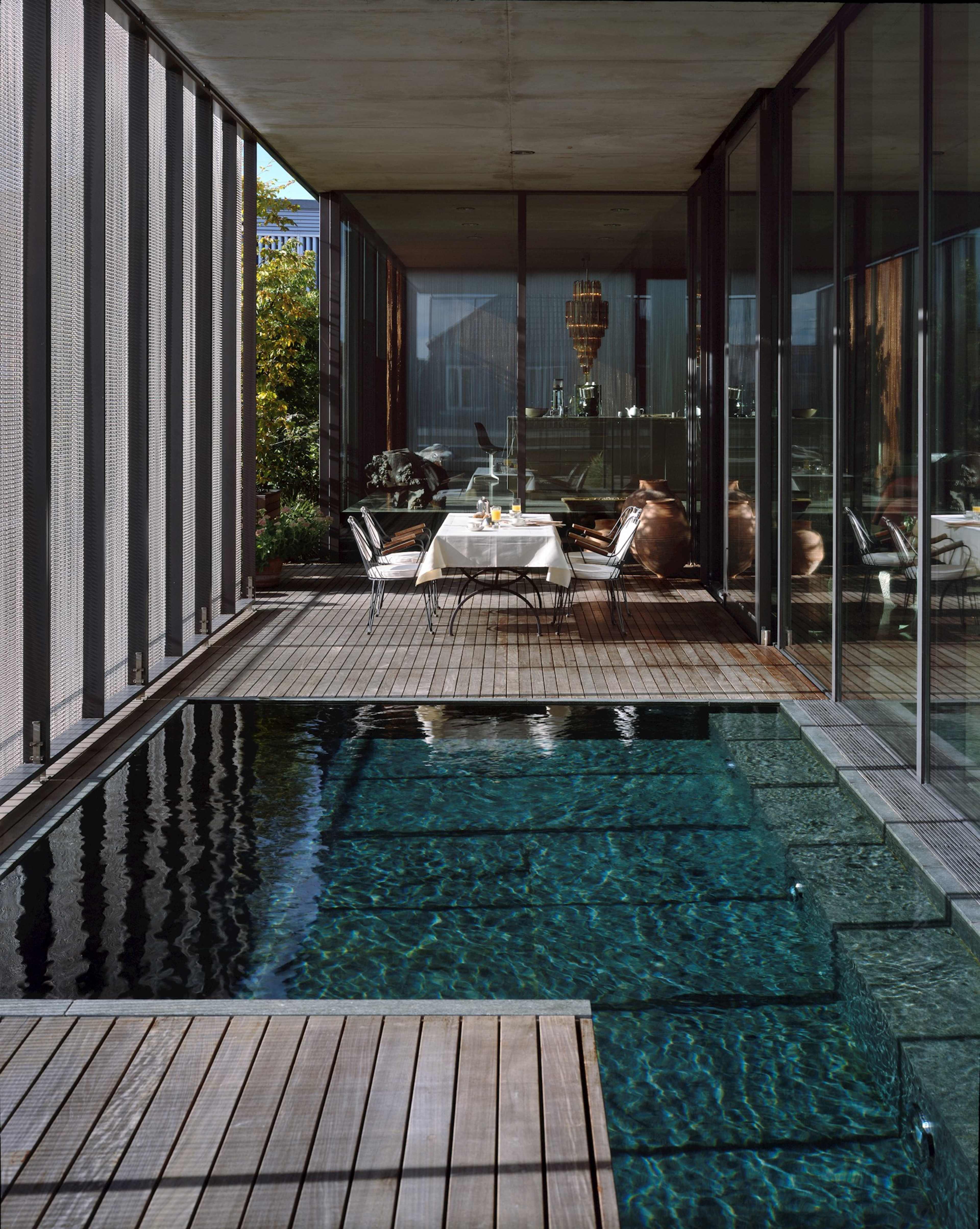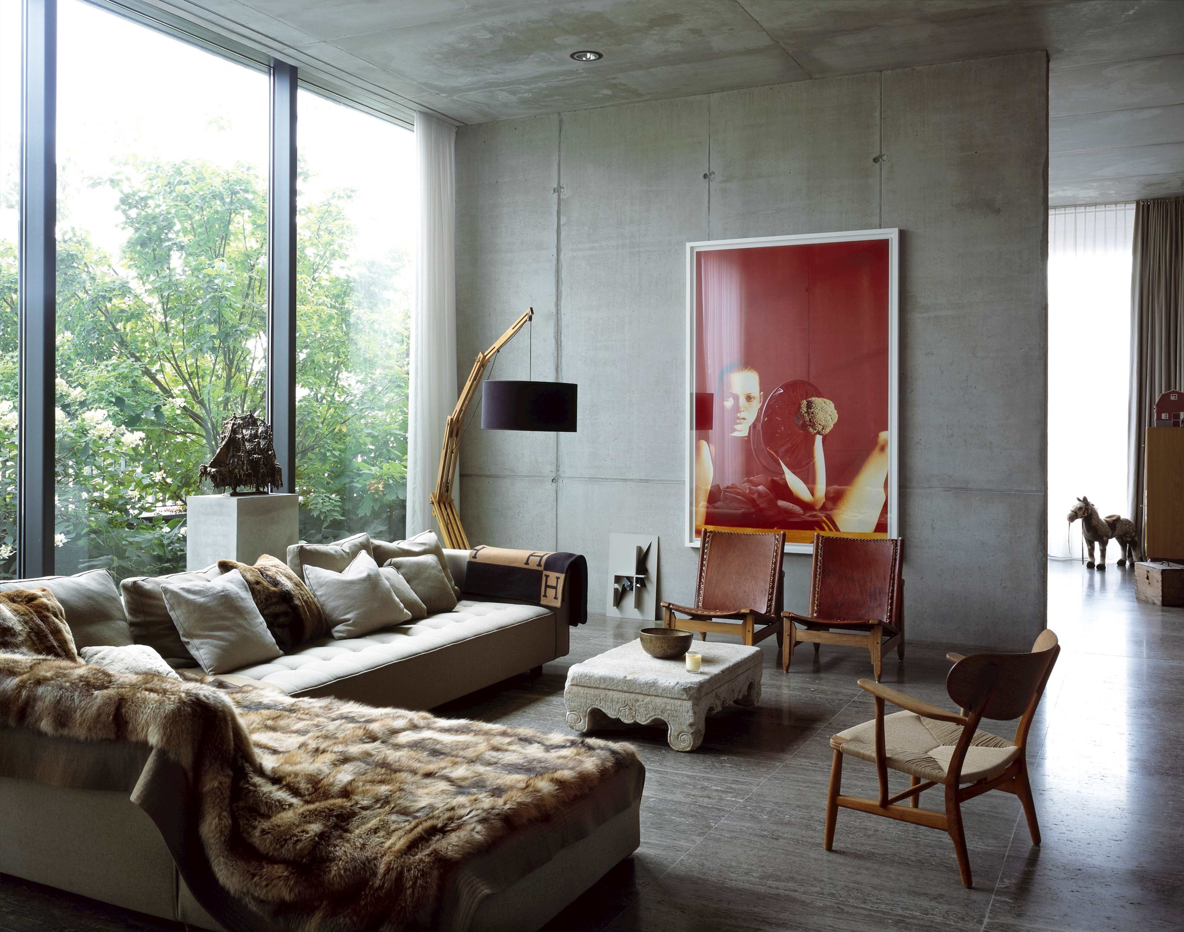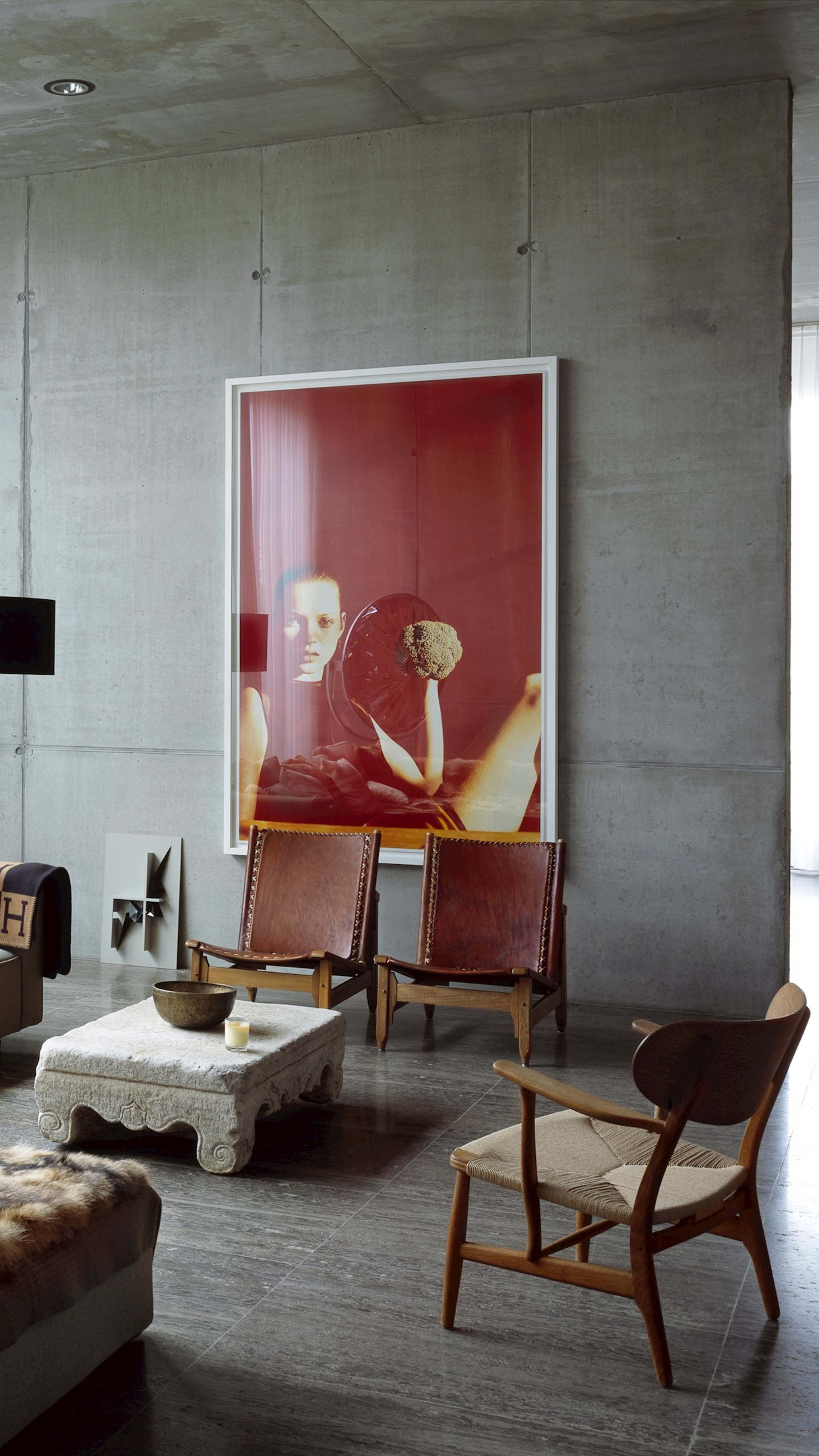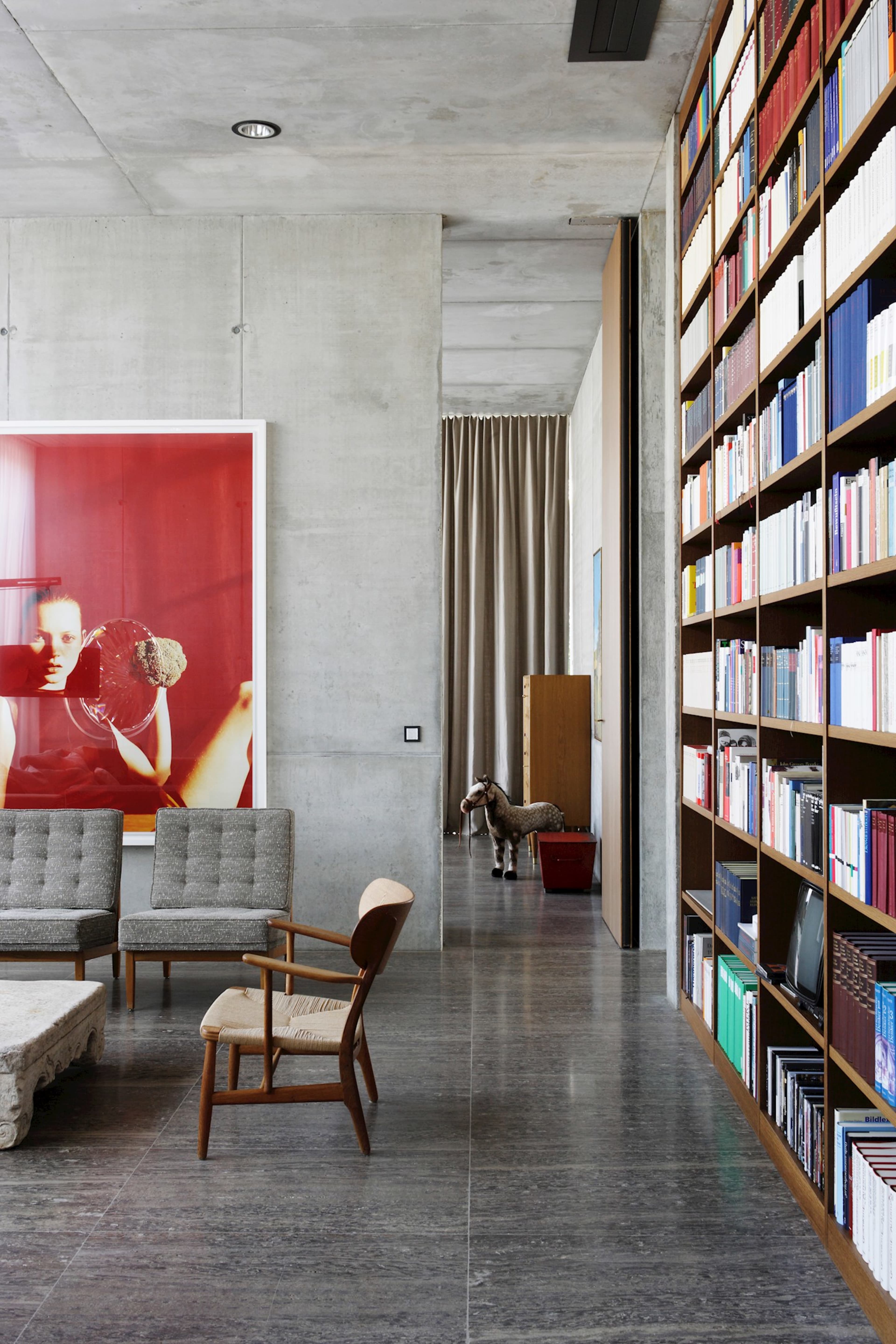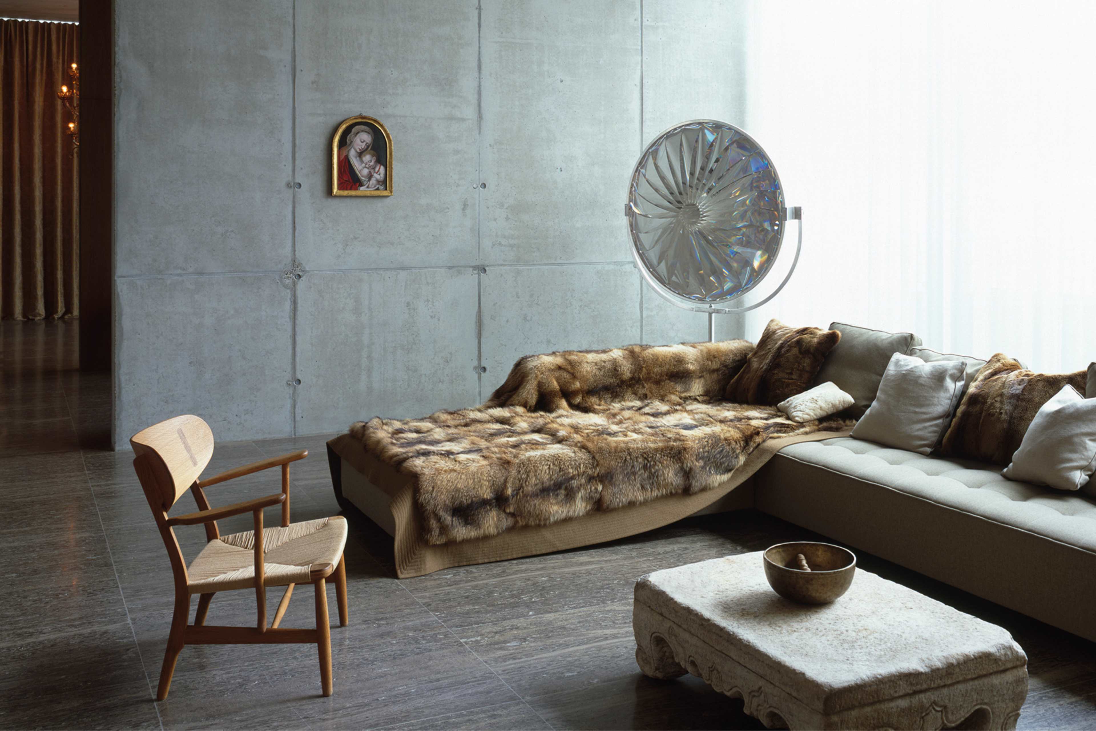 最上階のペントハウスは、カレン・ボロス、クリスチャン・ボロス夫妻の住居。ベルリンを展望できる住居にはアースカラーなど、温もりのある色彩や天然素材が多用されています。重々しいコンクリートの壁と優雅なコントラストを創り出す、広葉樹のハードウッド材のフローリング、毛皮、そして天井まで伸びたブックシェルフ。ナチュラルな素材が居心地のいい空間を創り出しています。リビングにはさりげなくハンス J. ウェグナーのCH22ラウンジチェア置かれています。「私たち二人にとっては、とても特別な椅子です。椅子の持つ独特な緊張感が気に入っています。芸術作品を気取らない、真摯でとてもさりげないデザインです。座り心地が良いので思わず座ってしまうような親近感と温かみを持っています。」と、クリスチャン・ボロスは語っています。