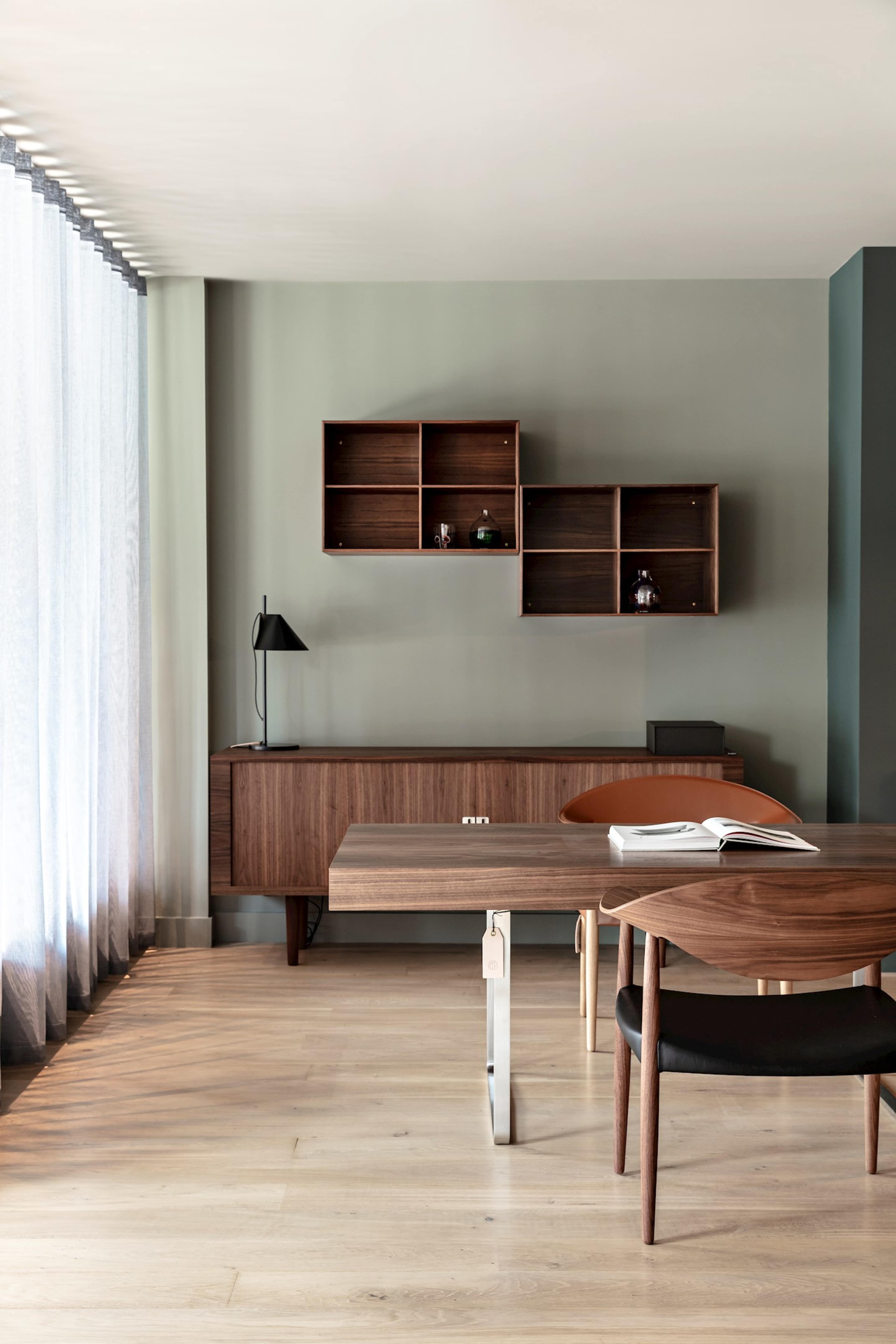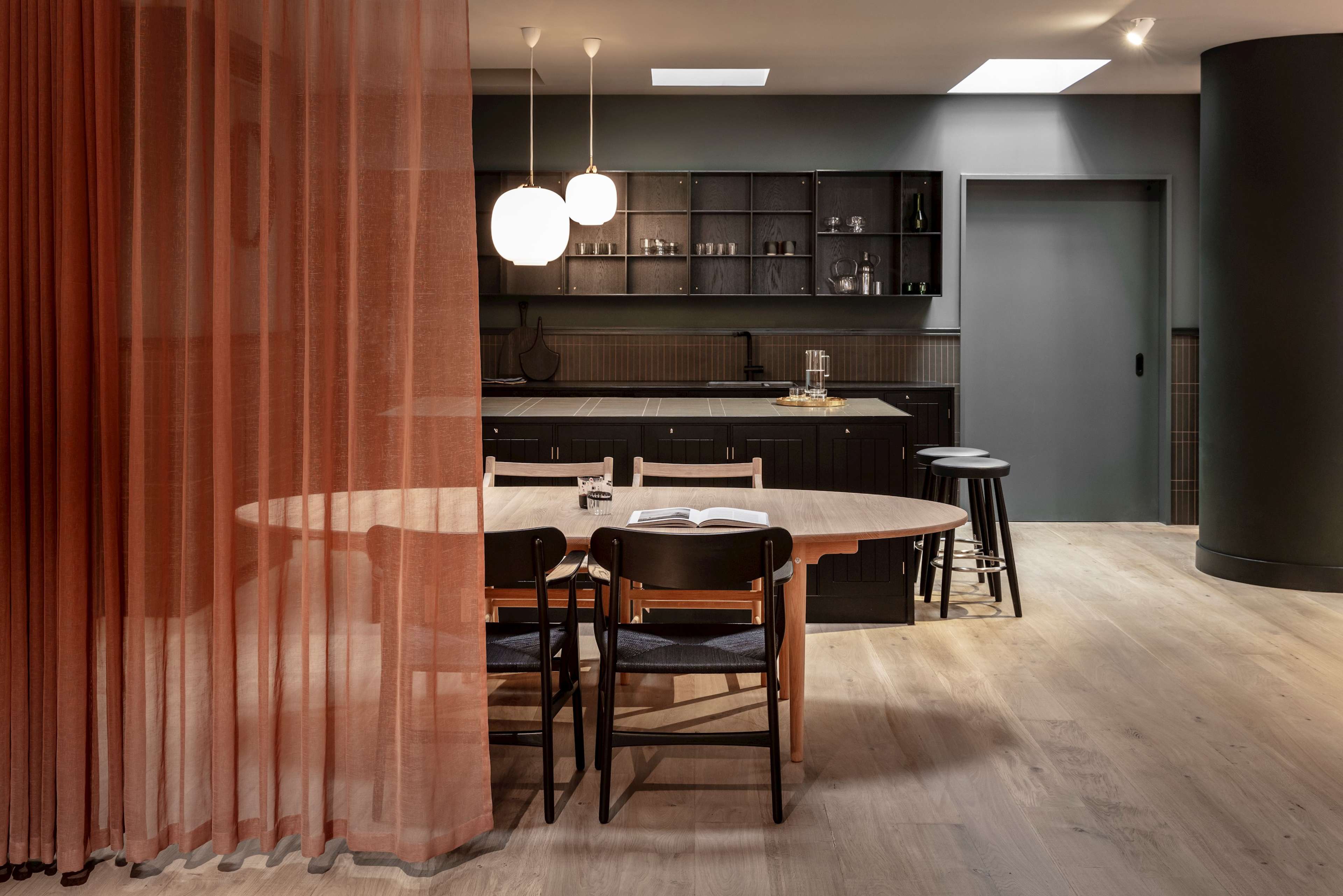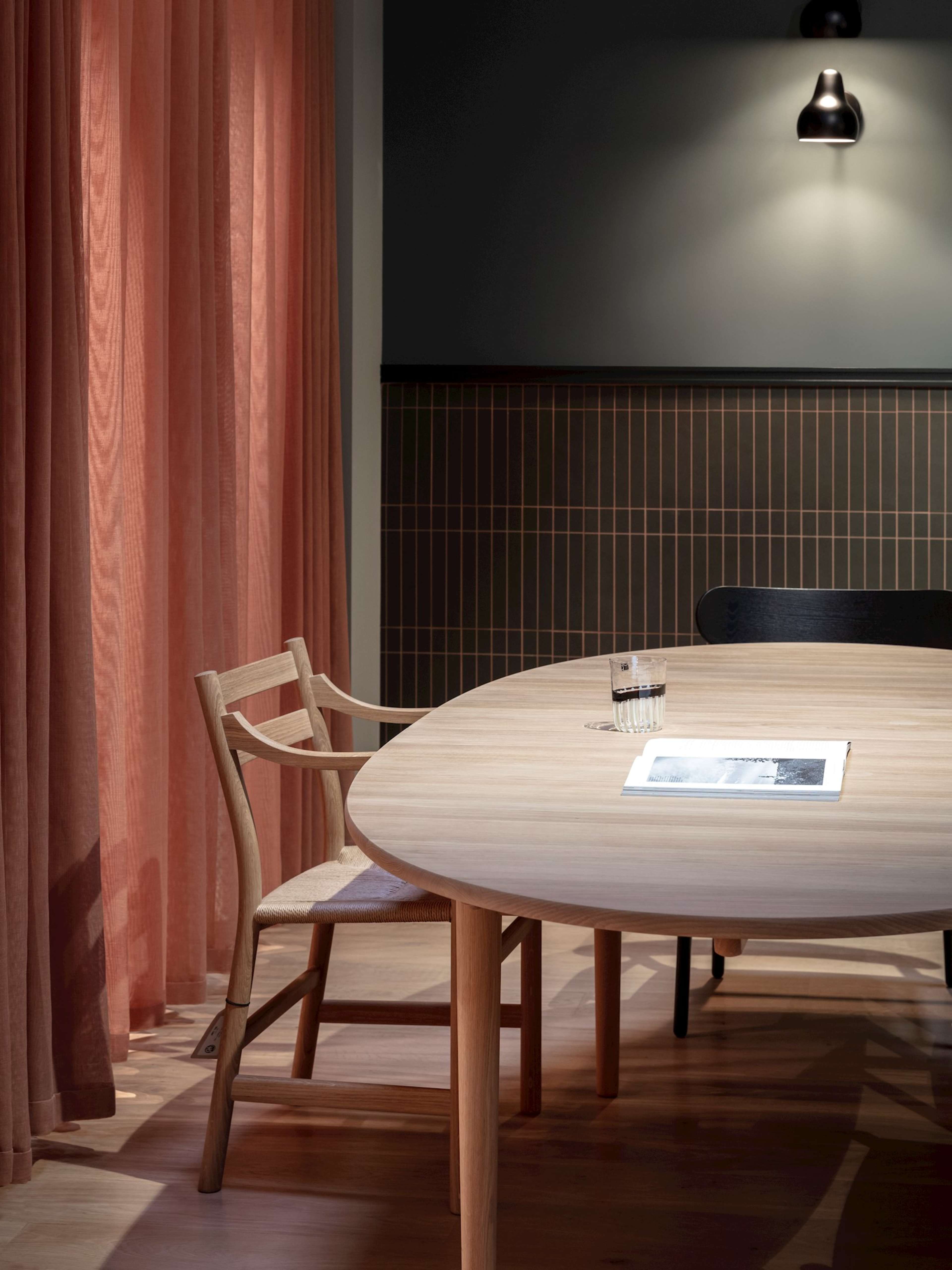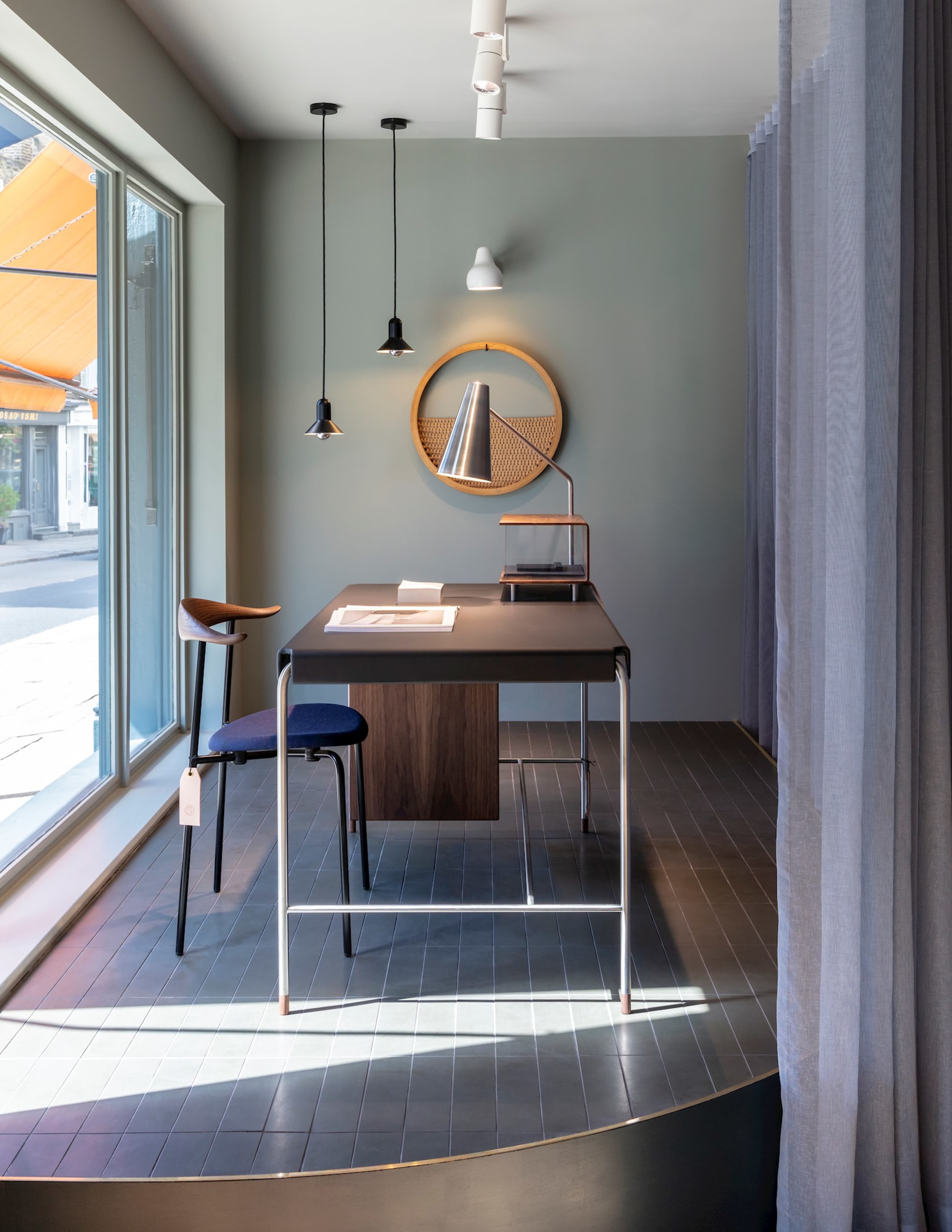 20世紀中期の建物に開業するストアの内装の基調は、カール・ハンセン&サンのコレクションと伝統色にインスパイアされた、ダークグリーン、ボルドー、落ち着きのあるグレー、そしてマリンブルー。床のオーク材と美しいコントラストを創り出しています。またここには、オーク材ブラック塗装仕上げのモーエンス・コッホの書棚やキャビネットを使用した特製のアイランドキッチンが設置されています。ロンドン・クラーケンウェルのショールームはすでにインテリアデザイナーや建築家たちの間でよく知られていますが、新しく開業するフラッグシップ・ストアは、さらに一般のお客様を取り込み、デザイナー、建築家とより幅広いお客様の要求や要望に対応できる場所となります。