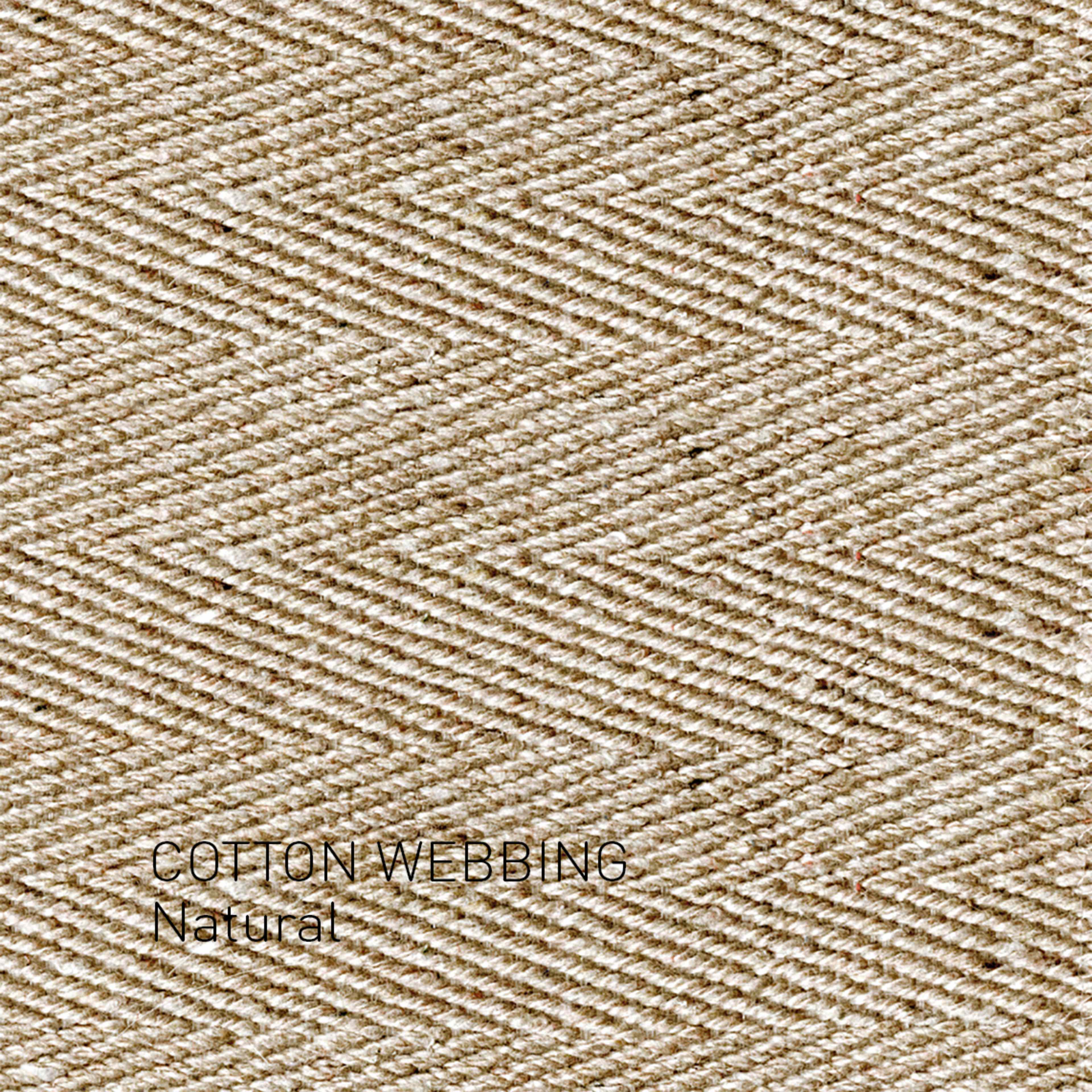 家具に使用されているウェビングテープの組成は85%コットン、15%ポリエチレンとなります。耐水性、耐湿性に優れています。コットンウェビングテープは耐久性に優れ、長年使用しても緩んでくることはあまりありません。また座面や背に用いることで、快適で優れたサポート力を発揮する素材です。