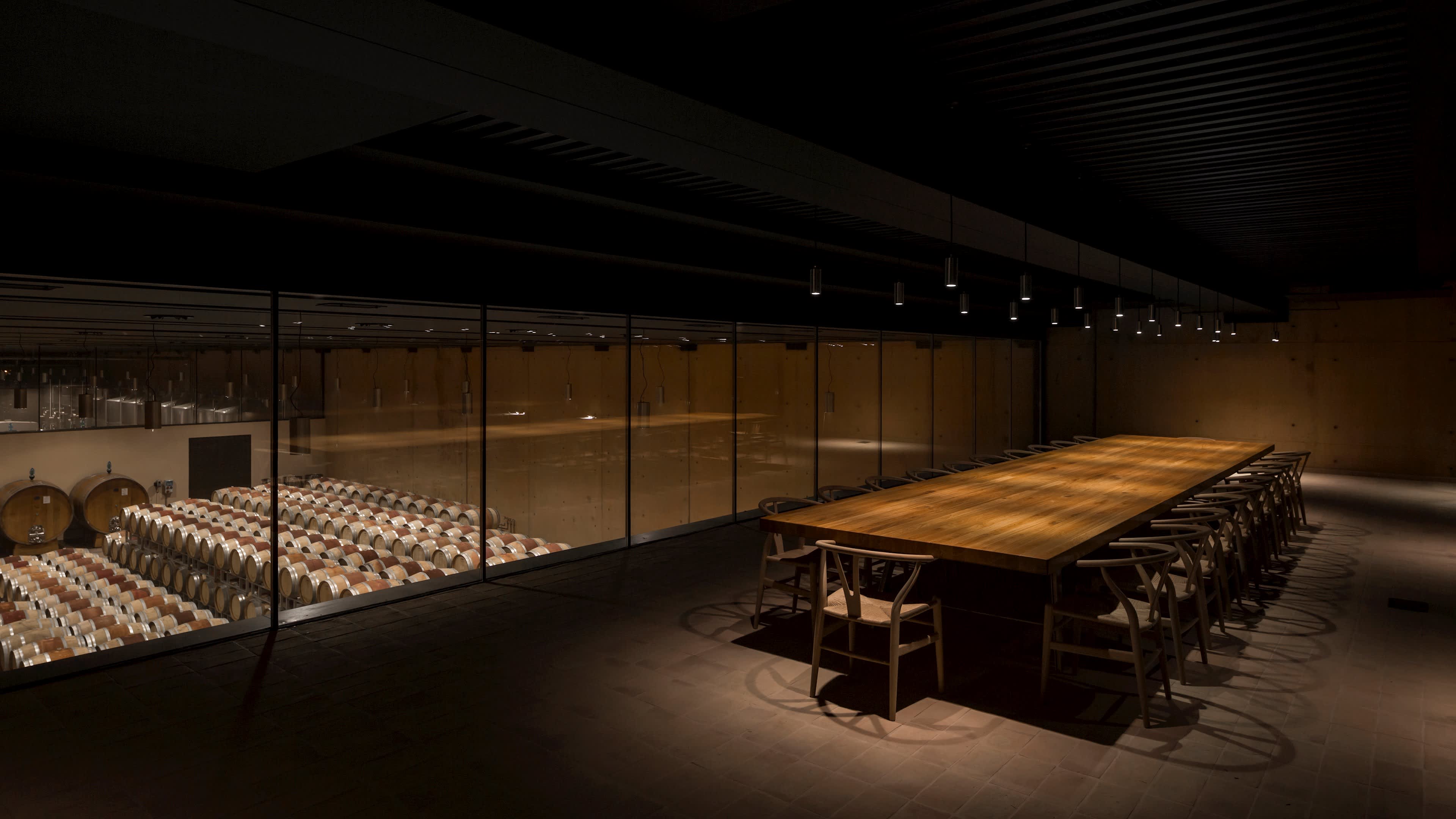 Genom en stor glasvägg i det 86 m2 stora vinprovningsrummet kan man titta ut över alla ekfat på våningen nedanför. Vinprovningsrummet har ett stramt och avskalat möblemang så att allt fokus hamnar på det besökarna kommer dit för, d.v.s. vinet.