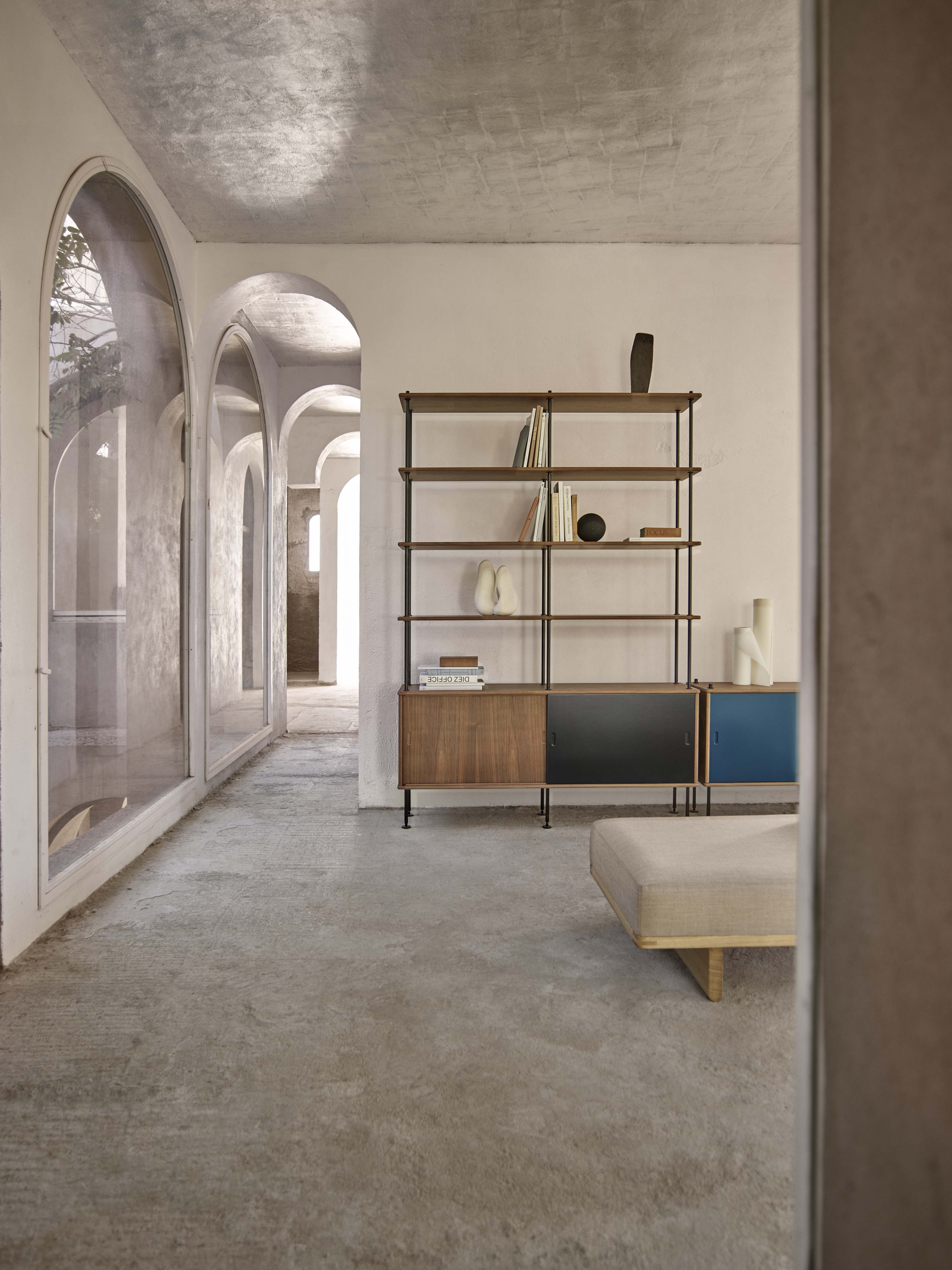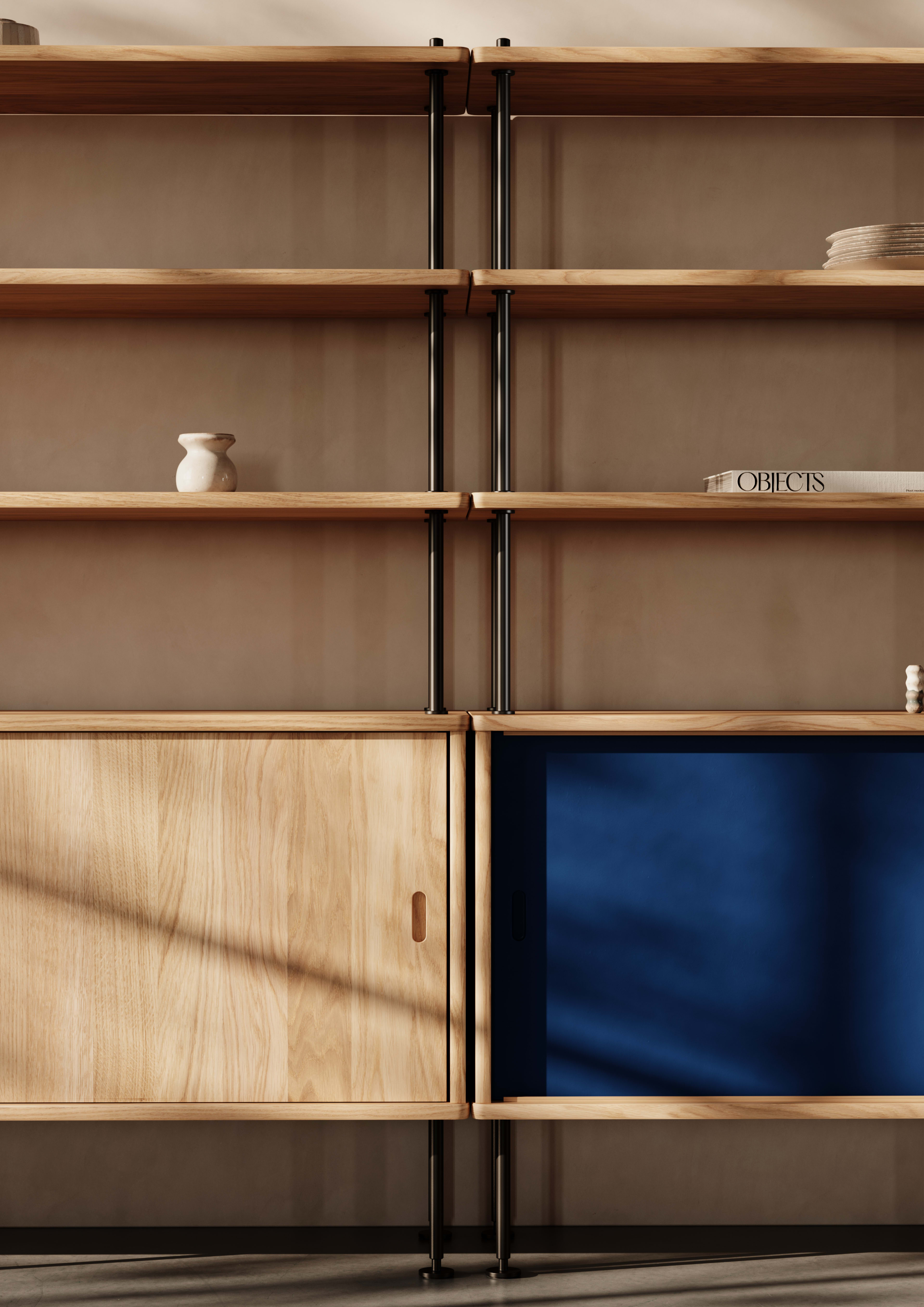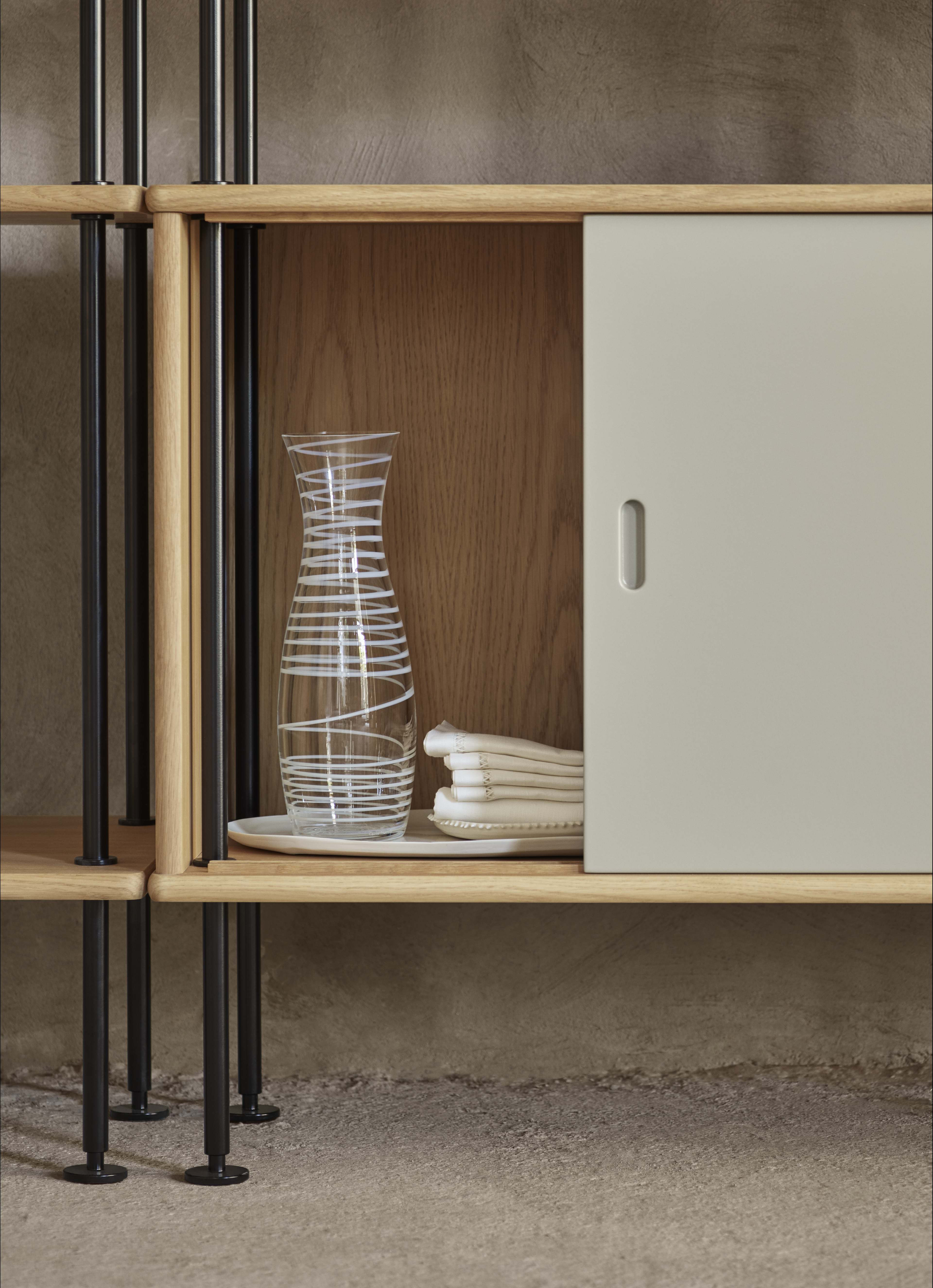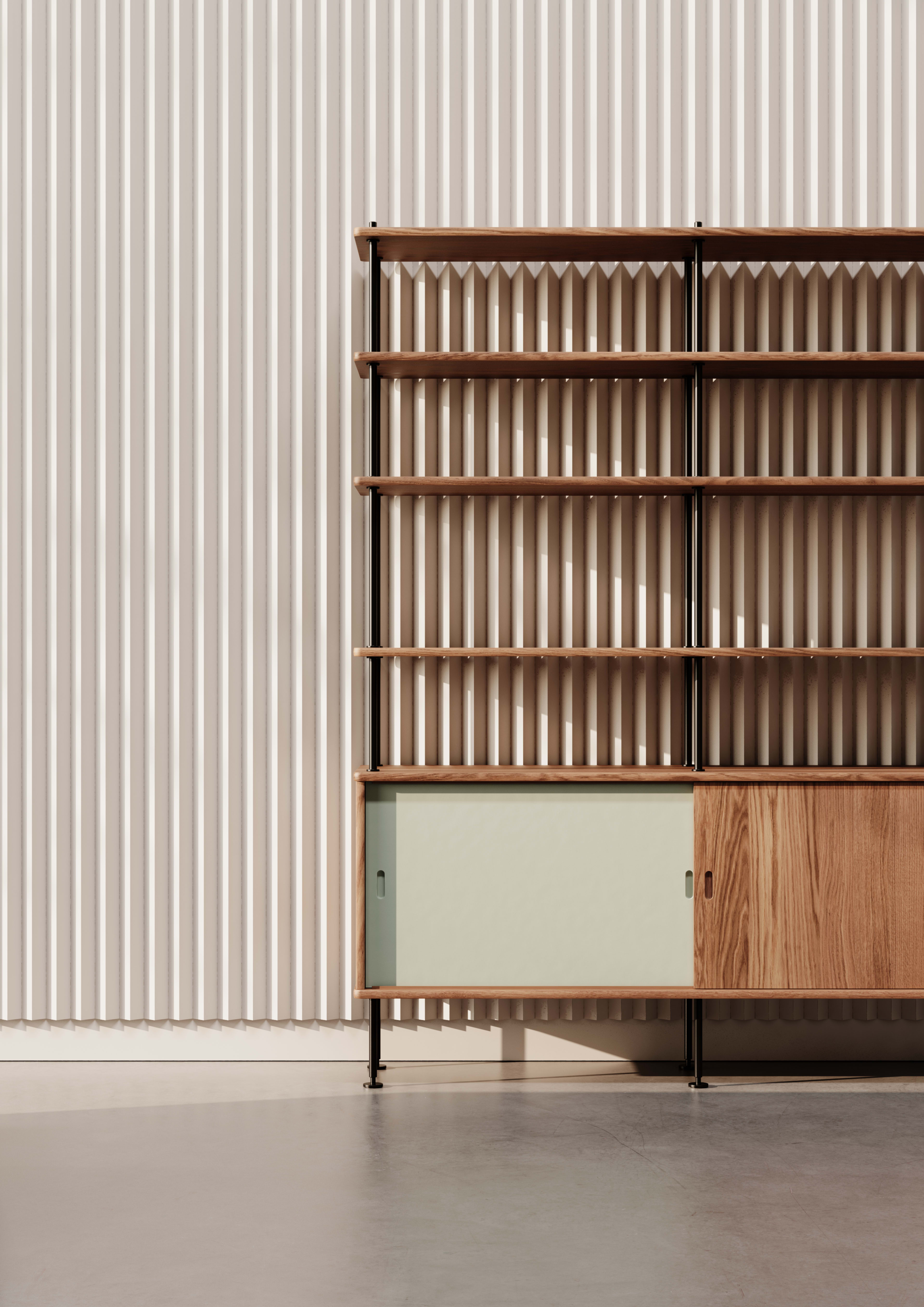 Det flexibla hyllsystemet består av stålrör i grått eller svart och valnöt eller FSC®-certifierad ek. (FSC C135991) Den modulbaserade designen ger bokhyllan oändliga monteringsalternativ, vilket gör att den alltid kan uppfylla dina föränderliga behov. Skåpen är utrustade med eleganta skjutdörrar som döljer sådant du inte vill visa upp, medan hyllplanen kan placeras på olika höjder – allt i en palett av klassiska färger som passar alla inredningsstilar.