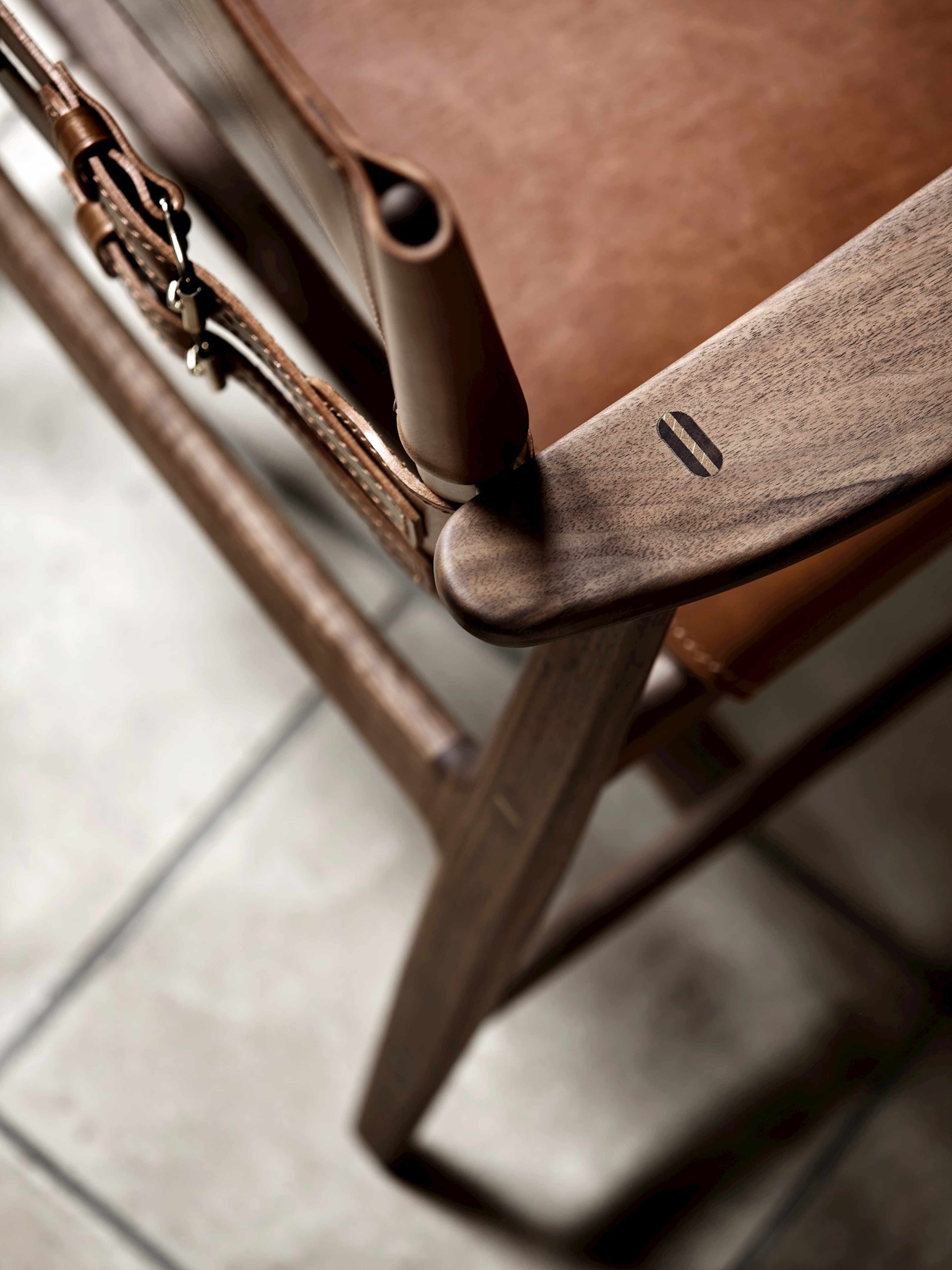 Furthermore, the attention to detail is a testament to the designers’ training as a cabinet maker. The organic wooden frame is embraced by the sturdy quality of saddle leather. Held taut by buckles and carefully skived for a smooth transition between layers, the result is a remarkable design. The height of the chair and the flexibility of the buckled saddle leather make the Huntsman Chair ideal as a dining chair as well as a lounge chair.