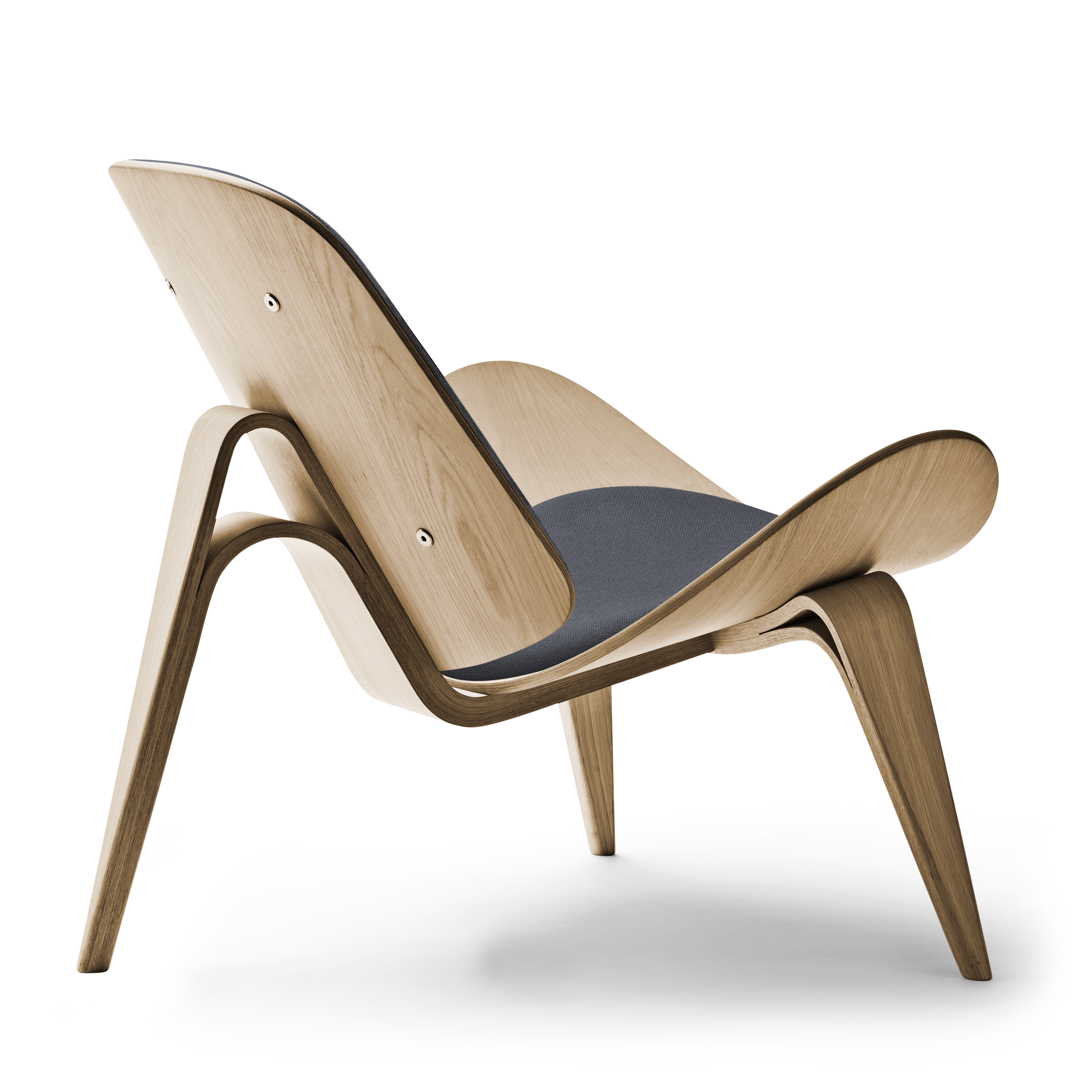 När Hans J. Wegner presenterade CH07 Shell Chair 1963 uppskattade många kritiker den avantgardistiska stilen, men allmänheten var ovillig att acceptera dess distinkta uttryck. Blandade recensioner på 1960-talet kombinerat med den tidens outvecklade produktionsteknik ledde till en mycket begränsad produktion. När Carl Hansen & Søn nylanserade Shell Chair 1998 vann den nästan omedelbart bred offentlig beundran tack vare intresset från en ny generation. Möbelns flytande lätthet uppnås av dess vingliknande sits och böjda ryggstöd som hålls av en ram med tre välvda ben. Stolens välkända sits och ryggstöd är skapade av formpressat fanér med stoppning som omsluter användaren i generös komfort. Stolens laminerade ben är gjorda i flera lager fanér och de två frambenen är gjorda i ett enda stycke, vilket ger en unik och stabil form. Shell Chair är en tydlig manifestation av Wegners uppfattning att en stol alltid ska vara bekväm, inte ha någon baksida och vara vacker från alla sidor och vinklar.