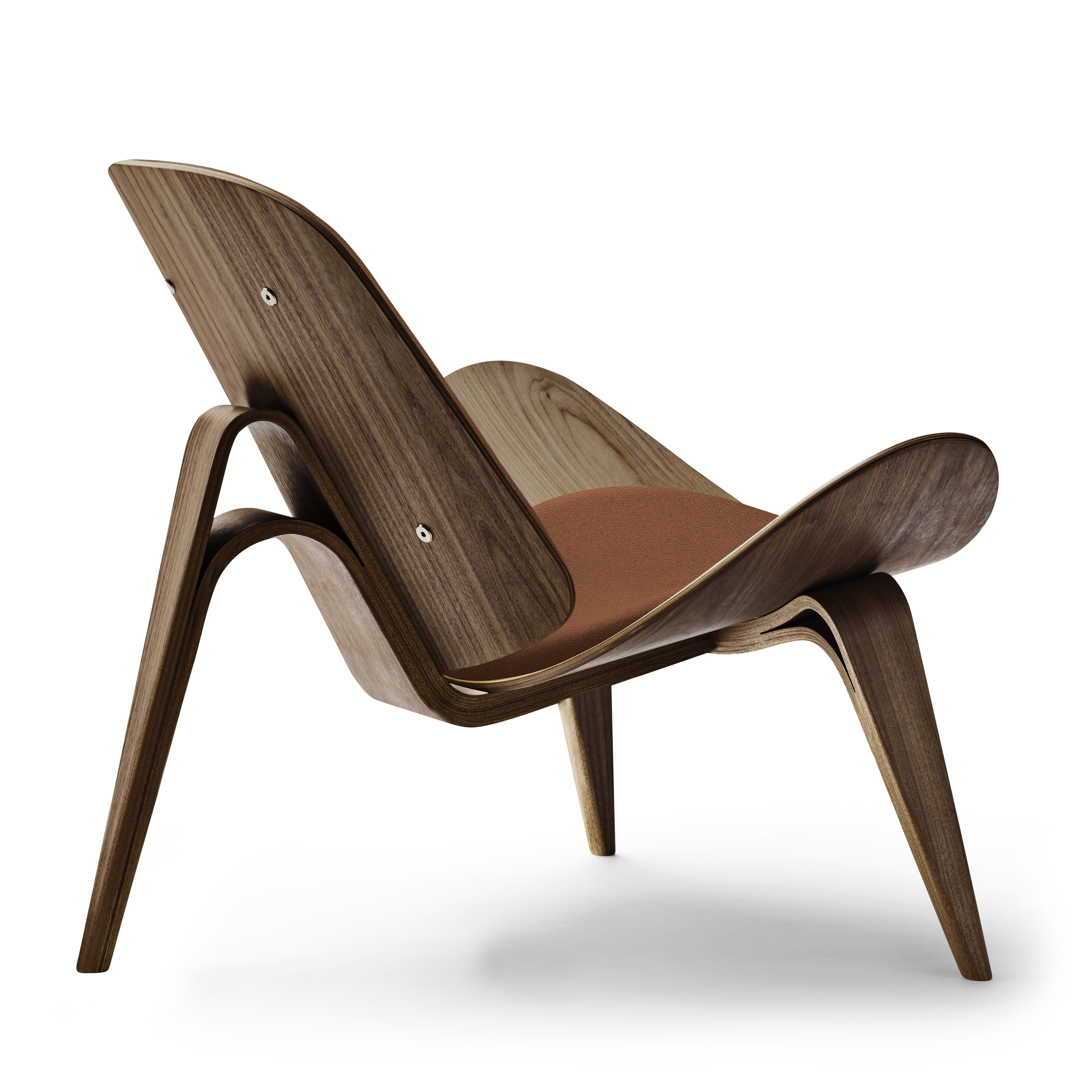 När Hans J. Wegner presenterade CH07 Shell Chair 1963 uppskattade många kritiker den avantgardistiska stilen, men allmänheten var ovillig att acceptera dess distinkta uttryck. Blandade recensioner på 1960-talet kombinerat med den tidens outvecklade produktionsteknik ledde till en mycket begränsad produktion. När Carl Hansen & Søn nylanserade Shell Chair 1998 vann den nästan omedelbart bred offentlig beundran tack vare intresset från en ny generation. Möbelns flytande lätthet uppnås av dess vingliknande sits och böjda ryggstöd som hålls av en ram med tre välvda ben. Stolens välkända sits och ryggstöd är skapade av formpressat fanér med stoppning som omsluter användaren i generös komfort. Stolens laminerade ben är gjorda i flera lager fanér och de två frambenen är gjorda i ett enda stycke, vilket ger en unik och stabil form. Shell Chair är en tydlig manifestation av Wegners uppfattning att en stol alltid ska vara bekväm, inte ha någon baksida och vara vacker från alla sidor och vinklar.