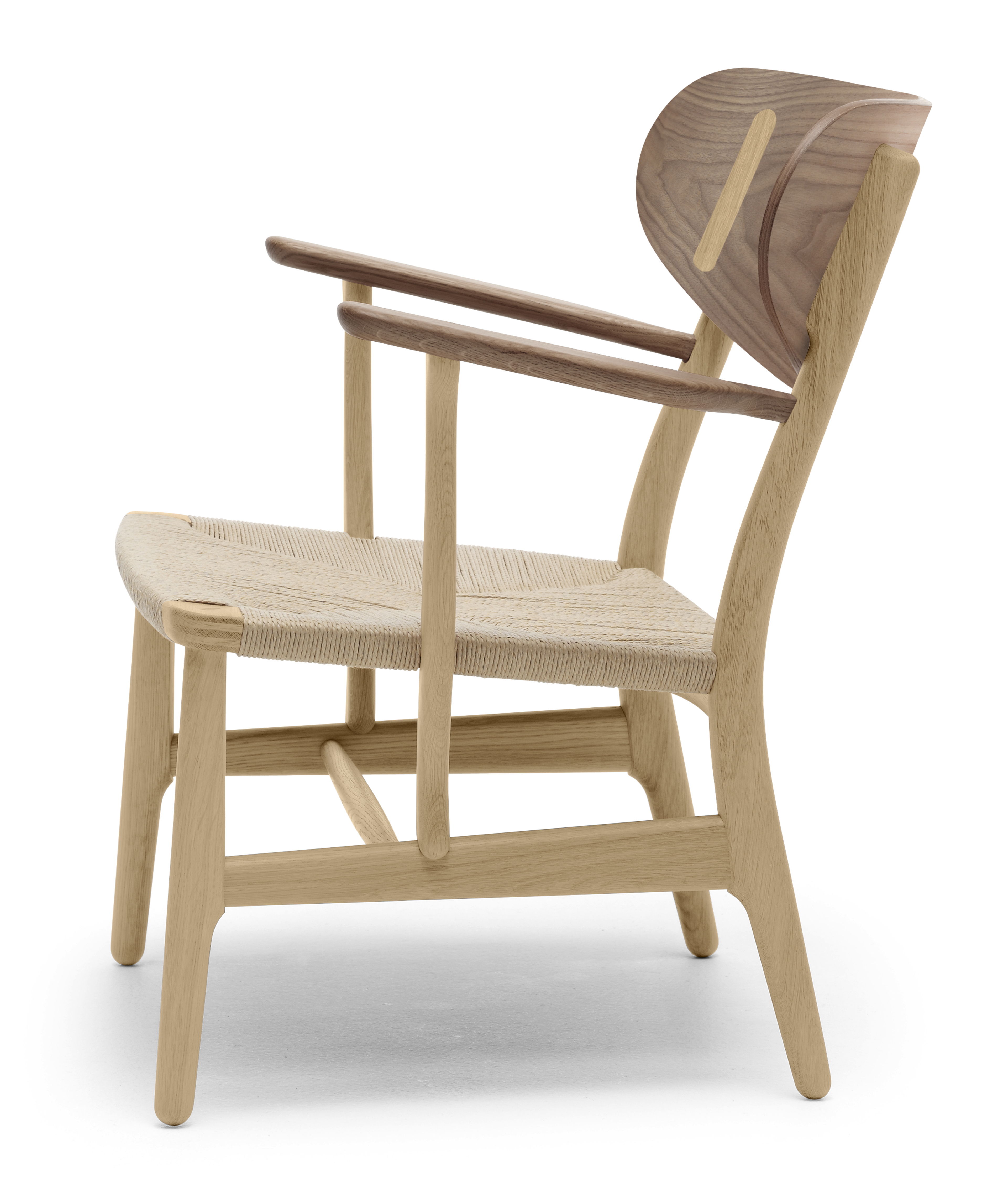 Efter att ha varit ur produktion under flera decennier började Carl Hansen & Søn producera Hans J. Wegners CH22 Lounge Chair igen 2016. Vid första anblicken lägger man kanske märke till Wegner-stolens stora, distinkta trärygg med synliga täcklock, men vid en närmare granskning av stolen blir fler av Wegners signaturdetaljer tydliga. På sidorna ser man till exempel att armstödet omfamnar tvärslån och sätesramen och expanderar till full bredd under armstödet för att ge det optimalt stöd. På ryggstödet leds sätets papperssnören ner runt sitsens ram och genom ett horisontellt spår i den bakre skenan. Det finns två fogar framtill på sitsen där frambenen leds upp genom de handmonterade hörnen. Trots att produktionen självklart har moderniserats tillverkas CH22 fortfarande enligt samma hantverksprinciper som när Wegner följde och deltog i tillverkningen av de första exemplaren på Carl Hansens familjeägda snickeri 1950. Sedan dess har moderniseringen förbättrat precisionen så att frambenen, som ursprungligen tillverkades runda, nu kan ha samma profil som stolens bakben. Detta innebär att de nu är gjorda enligt Wegners ursprungliga tekniska ritning, där benen skulle gå upp genom sitsramen och låsas med kilar.