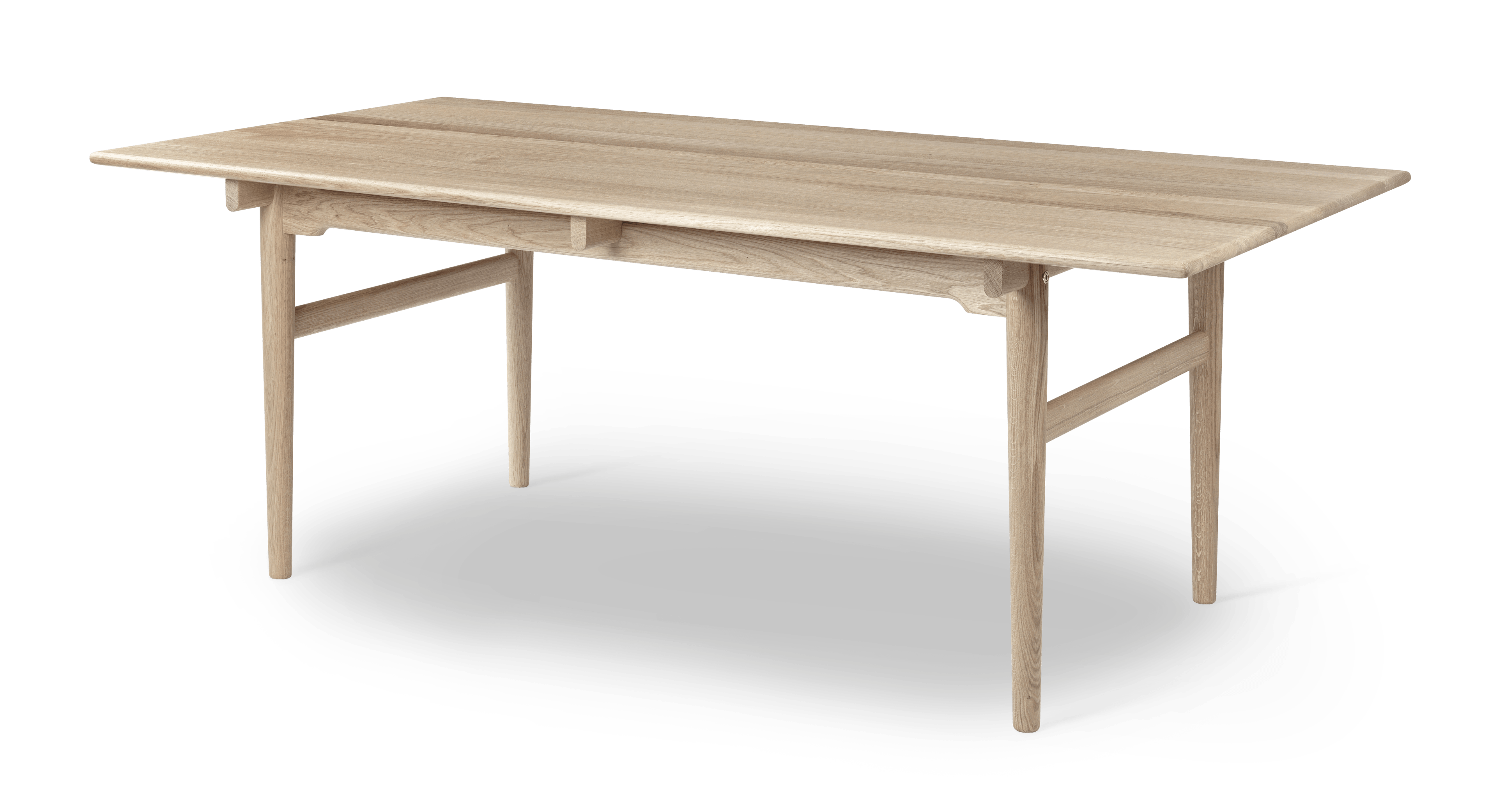 Hans J. Wegners CH327 Dining Table från 1962 är ett bra exempel på hur kreativitet i kombination med förstklassigt hantverk kan resultera i en annorlunda och spännande design. CH327 är ett matbord i massivt trä med mjuka kanter och rundade ben som smalnar av ner mot golvet. Träets ådring går i bordsskivans längdriktning och själva bordsskivan vilar på tre distinkta tvärslåar. Under dessa finns på vardera sida en sidostång som fortsätter i hela bordets längd. Mellan sidostången och bordsskivan finns ett mellanrum vilket ger illusionen av att bordsskivan svävar. Som stöd finns två avtagbara ben i varje ände som är sammankopplade med en tvärslå. Benen och tvärslåarna säkerställer stabiliteten på tvären medan sidostängerna gör detsamma på längden. Sidostängerna sammanfogas högre upp vid bordsbenen och med mindre avstånd för att öka benutrymmet när man sitter vid bordet. CH327 finns i dag i två längder: 190 cm för sex personer och 248 cm för åtta personer. Bägge borden kan förlängas i varje ände med ett 40 cm bred tilläggskiva, vilket ger tio respektive tolv sittplatser. Wegners eleganta CH327 Dining Table kan användas både som matbord och som mötesbord. Det fungerar även som skrivbord.